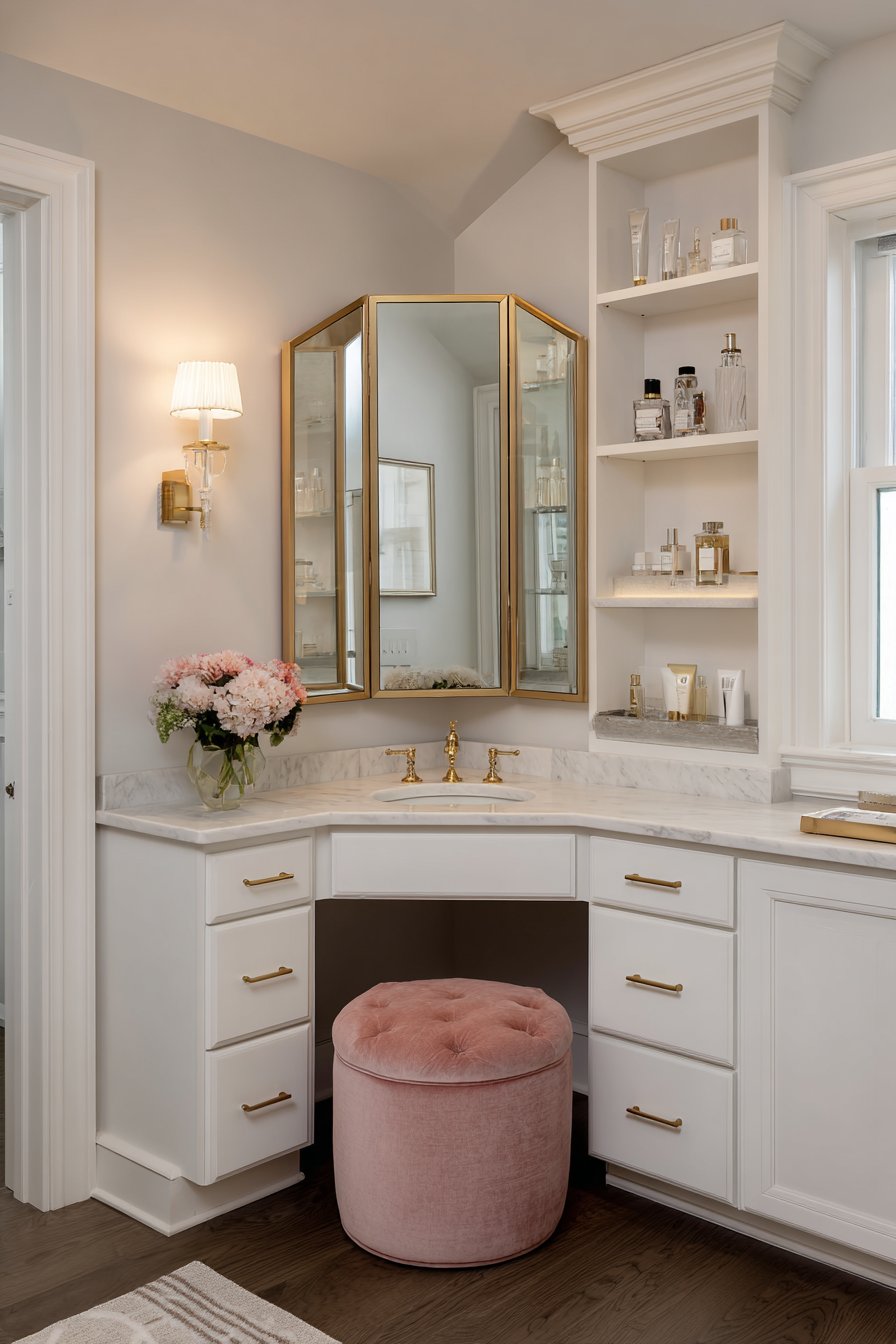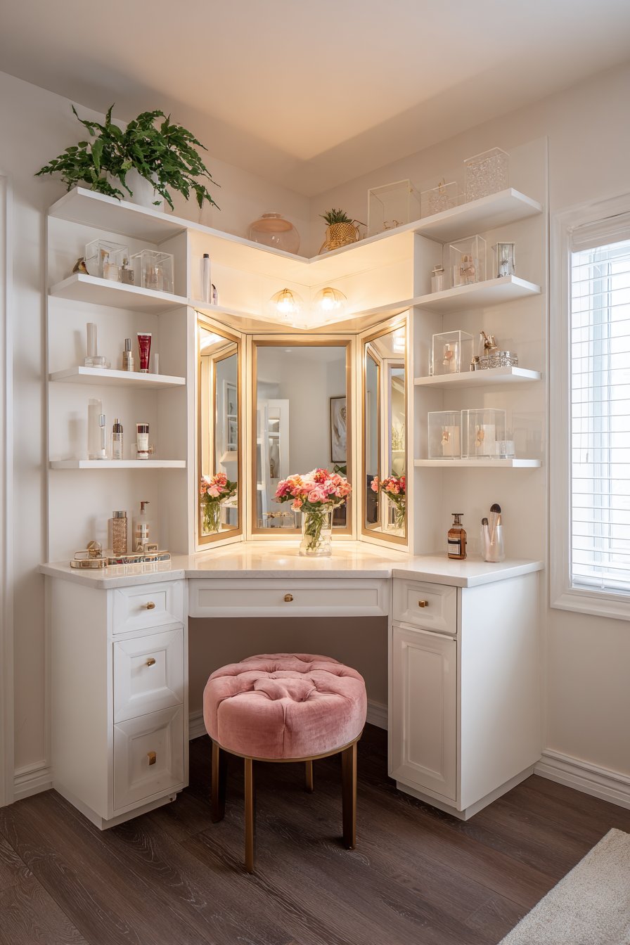 A corner vanity area featuring room corner decor ideas creates a dedicated grooming and beauty space that brings luxury and functionality to bedrooms or dressing areas. The triangular corner-fitted vanity table in white lacquer with gold hardware maximizes the often-awkward corner geometry, transforming it into an asset. The white finish reflects light beautifully, keeping the space feeling bright and clean, while the gold hardware adds sophisticated warmth and tactile pleasure with every drawer pull.