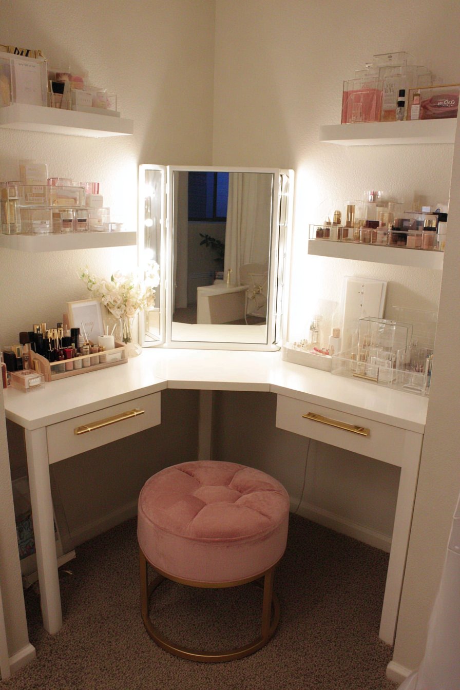 Open shelving on both corner walls displays beauty products in matching clear acrylic organizers, transforming everyday items into attractive displays while maintaining accessibility. The transparency of acrylic organizers allows you to see product levels at a glance, preventing the frustration of running out of essentials. A tufted velvet stool in blush pink provides comfortable seating while adding a touch of feminine elegance. LED strip lighting around the mirror provides even, shadow-free illumination crucial for precision tasks.