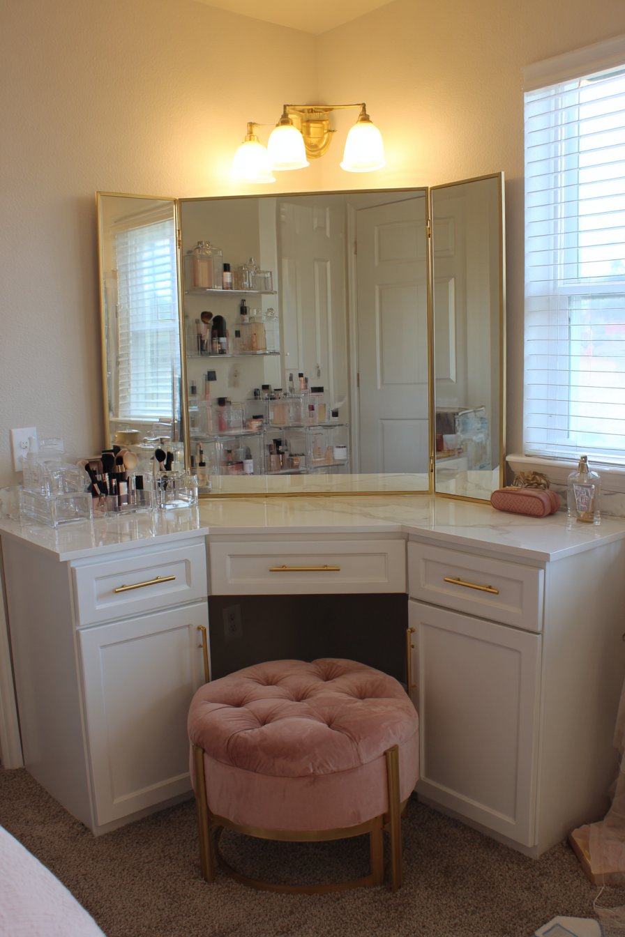 The tri-fold mirror system is the star of this setup, maximizing the corner space while providing multiple viewing angles essential for makeup application, hair styling, and skincare routines. Unlike single mirrors that require contortions to see side views, this three-panel configuration lets you check results from multiple perspectives without repositioning. The mirrors also amplify light throughout the space, making the corner feel larger and more luxurious than its actual square footage.