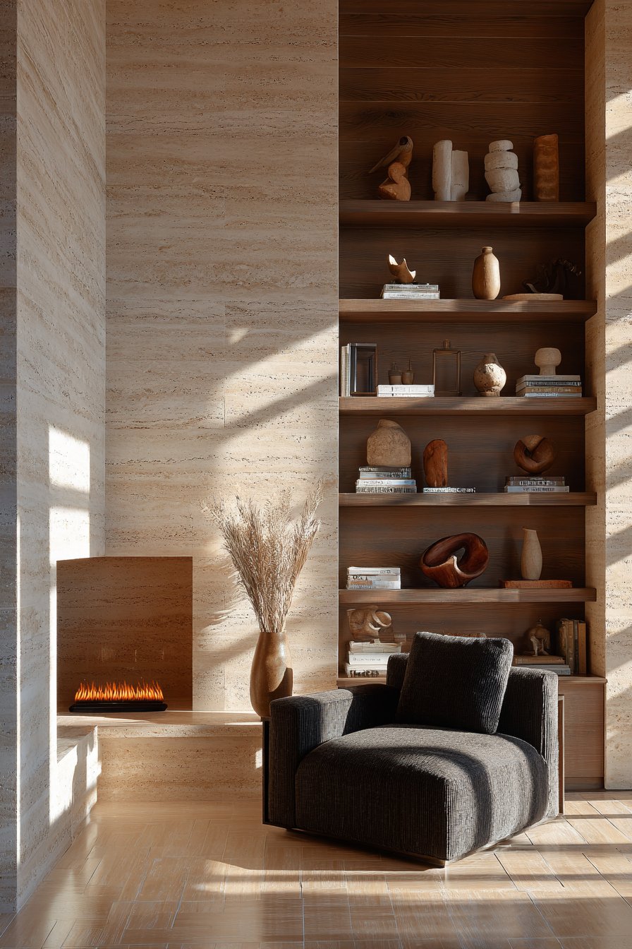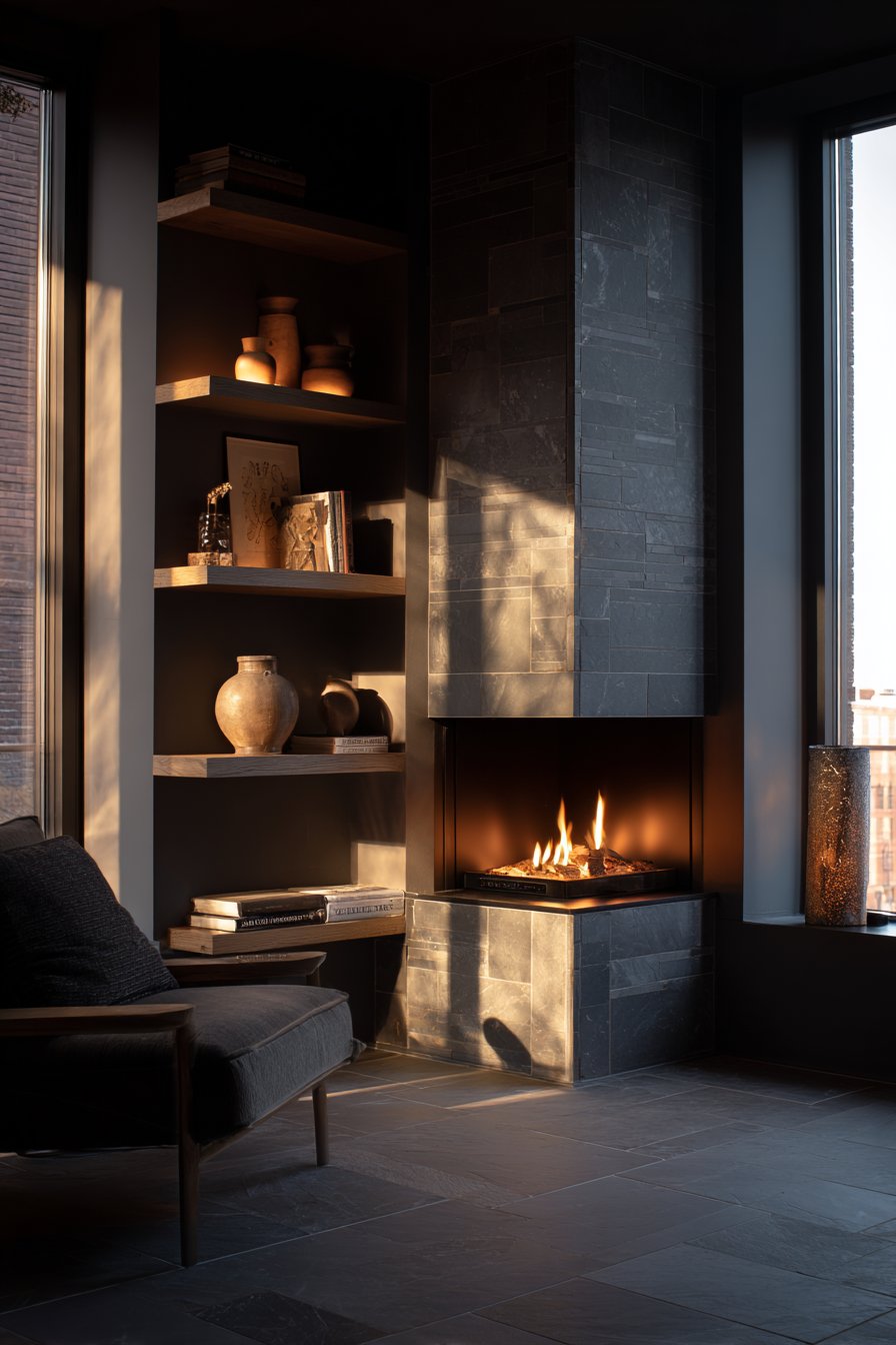 A low-profile armless chair in charcoal linen positions nearby for warmth, its streamlined silhouette maintaining sightlines across the room while providing comfortable fireside seating. The linen fabric brings softness and texture while remaining sophisticated and easy to maintain. Natural stone tiles surrounding the fireplace opening feature a matte finish that evokes organic, earthy qualities while providing necessary heat resistance and safety.