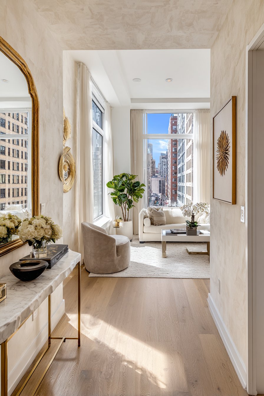 Key Design Tips: Lean oversized mirrors against walls with appropriate wall anchors or safety straps to prevent tipping, especially in homes with children or pets. Position mirrors to reflect the most attractive views—windows bringing natural light, curated furniture vignettes, or plants rather than cluttered areas. Keep the reflection zone consistently organized since it will be constantly visible. Choose simple, neutral frame finishes in small spaces to avoid visual clutter. Place mirrors where you’ll naturally view them from the room’s main seating or living areas for maximum spatial impact.