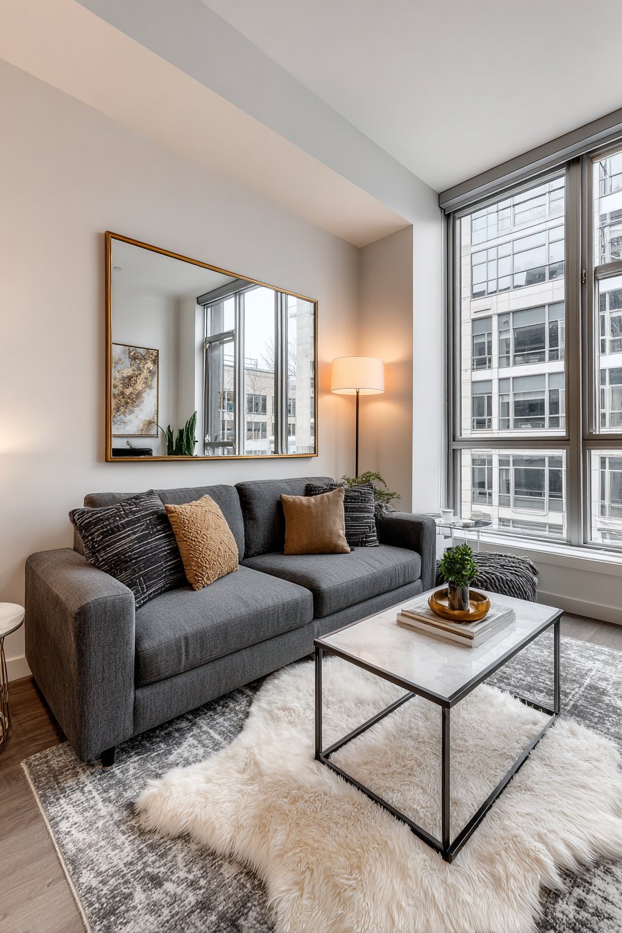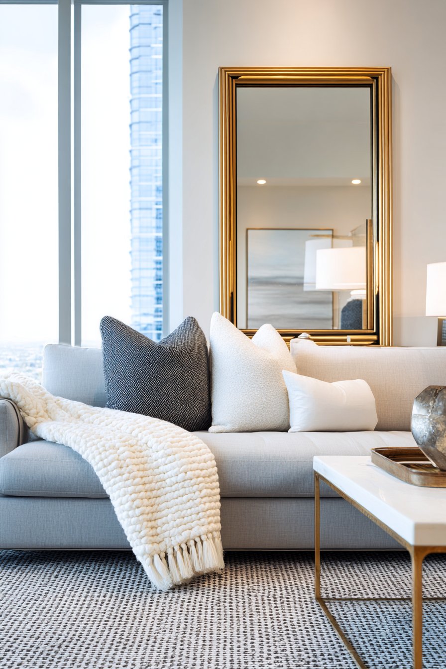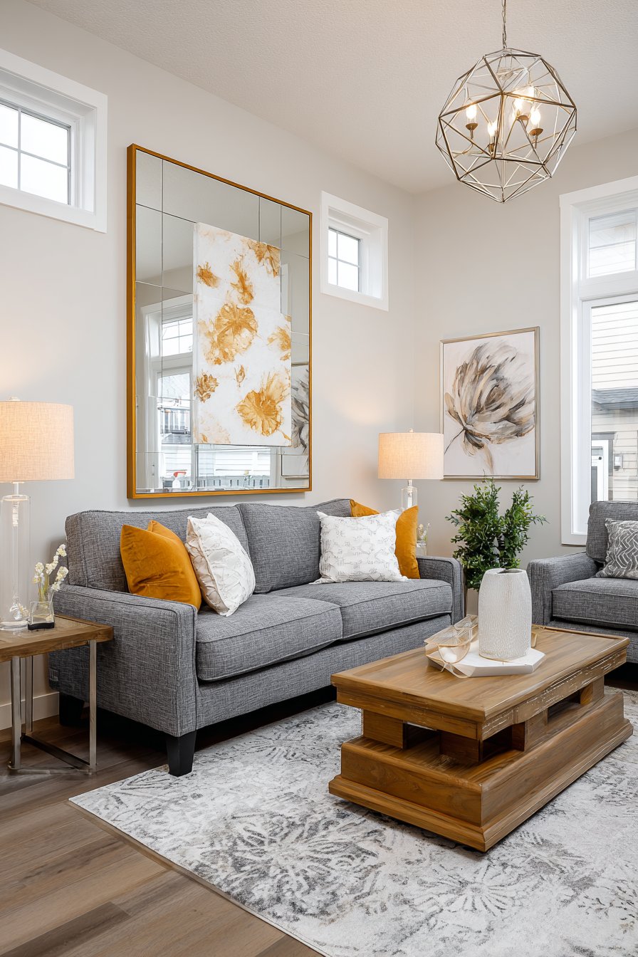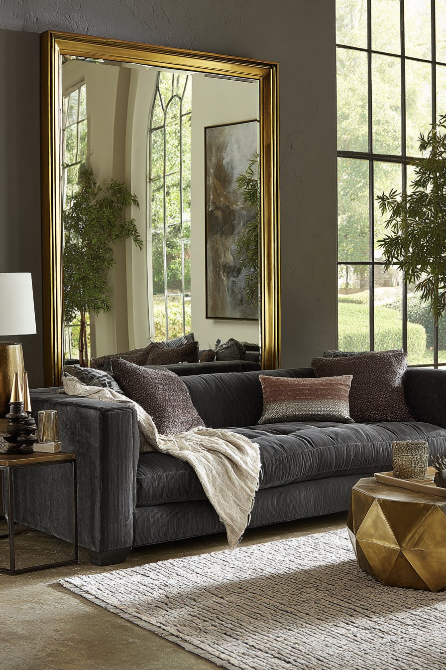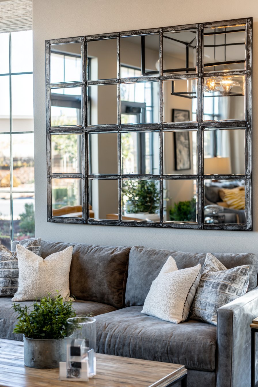 A large geometric mirror with a sophisticated gold-finished metal frame commands attention when mounted above a modern gray sofa, creating an instant focal point that anchors the entire seating area. This oversized rectangular mirror doesn’t merely hang on the wall—it transforms the room’s spatial dynamics by reflecting the opposite wall’s carefully curated artwork and capturing precious natural light from nearby windows, effectively doubling the perceived room size without any structural changes. The clean, angular lines of the geometric frame bring architectural interest to what might otherwise be a flat wall surface, while the warm gold finish adds a touch of luxury that elevates the contemporary aesthetic.