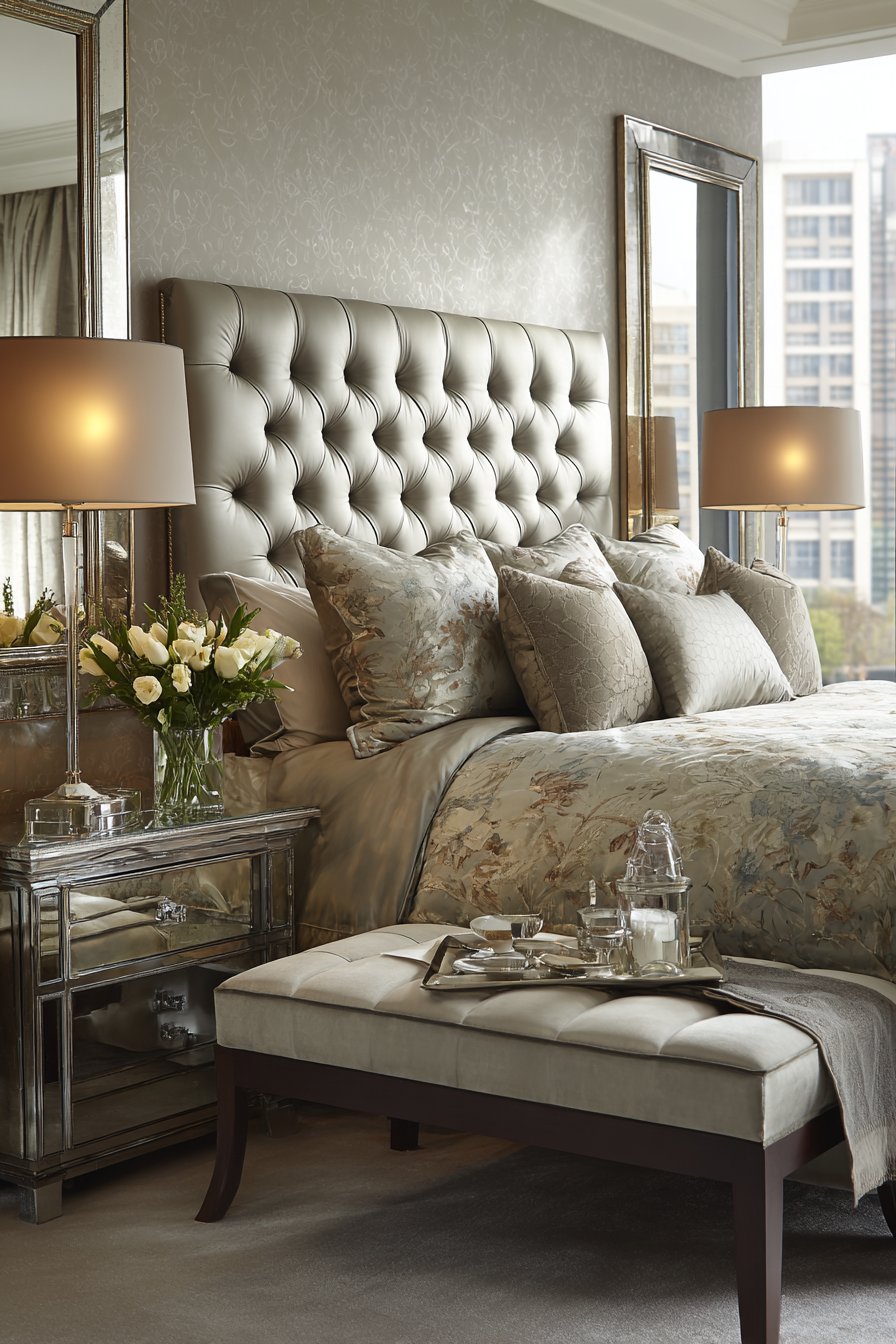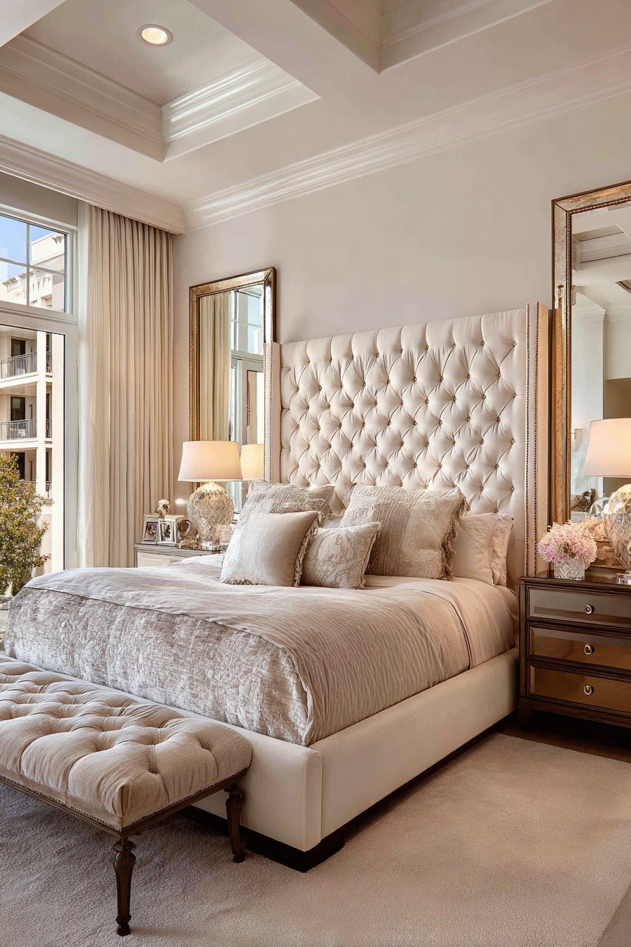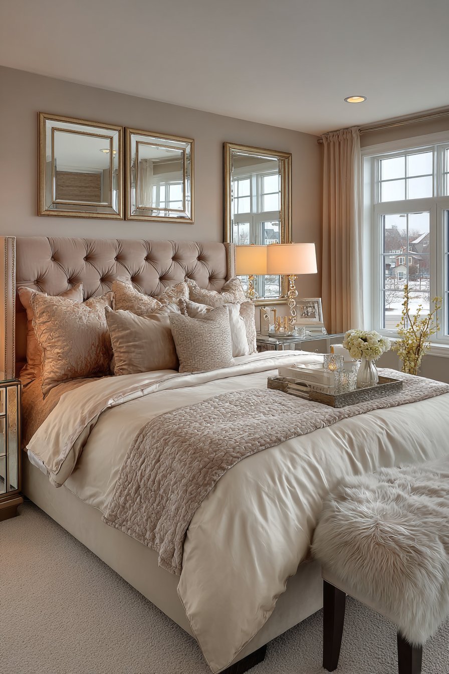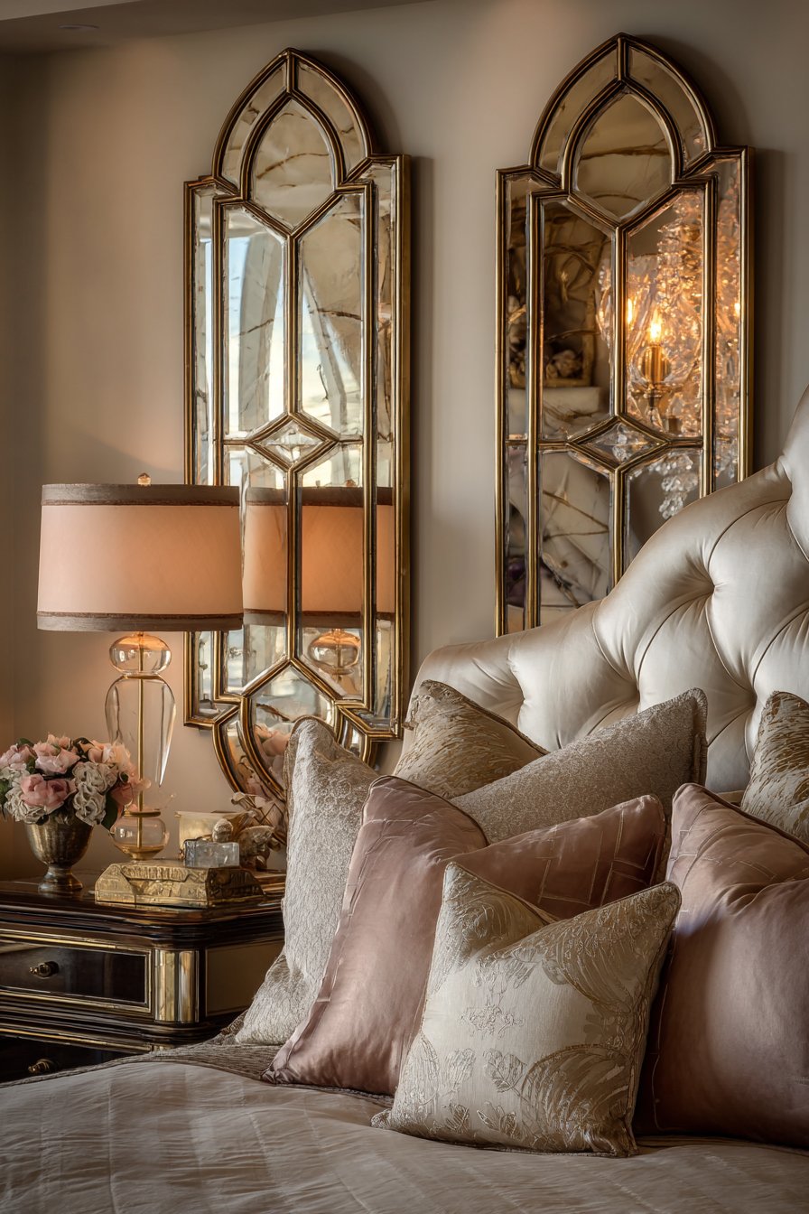 Sophisticated symmetry defines this master bedroom room mirror idea, where matching mirrors in champagne gold frames flank a tufted headboard to create balanced, harmonious composition that exudes refined elegance. Each mirror reflects its adjacent bedside table lamp and nearby windows, creating multiple light sources that enhance the room’s romantic ambiance while making the space feel larger and more luminous. The champagne gold finish brings warmth and subtle glamour without the excessive shine of bright gold or brass, striking an elegant middle ground that feels luxurious without being ostentatious.