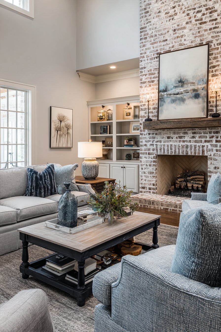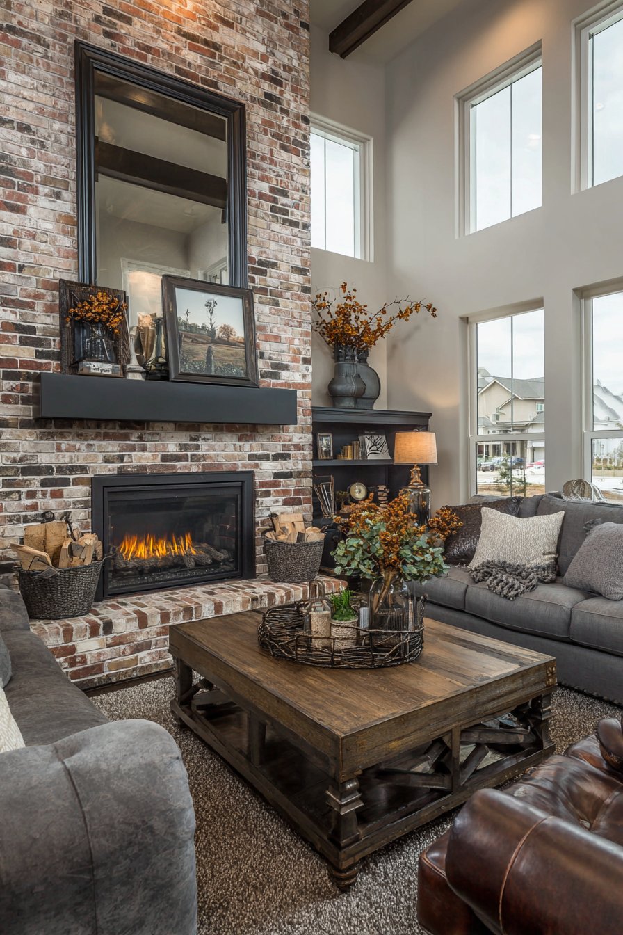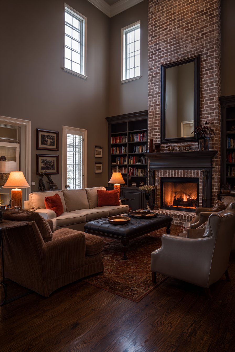 A large rectangular mirror featuring a wide beveled frame in dark espresso finish commands attention above a brick fireplace mantel, serving as the natural focal point in a transitional living room that balances traditional and contemporary elements. The mirror’s substantial size and traditional beveled edge frame design honor classic interior design principles, while its clean lines and dark finish prevent it from feeling dated or overly ornate. The reflective surface captures built-in bookshelves and comfortable seating arrangements, adding visual depth that makes the room feel larger and more dynamic than its actual dimensions.