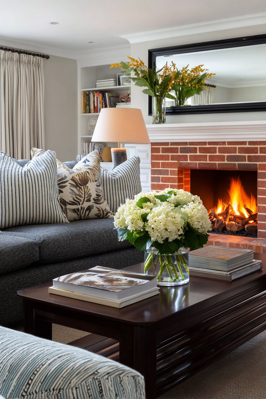 The dark espresso frame provides grounding weight that anchors the mirror visually, preventing it from appearing to float disconnected above the mantel. This substantial frame also creates pleasing contrast against lighter wall colors while coordinating beautifully with traditional wood furniture pieces found in transitional spaces. The beveled edge adds subtle dimensional interest, catching and refracting light in ways that flat mirrors cannot, creating sparkle and visual intrigue without requiring ornate decorative elements.