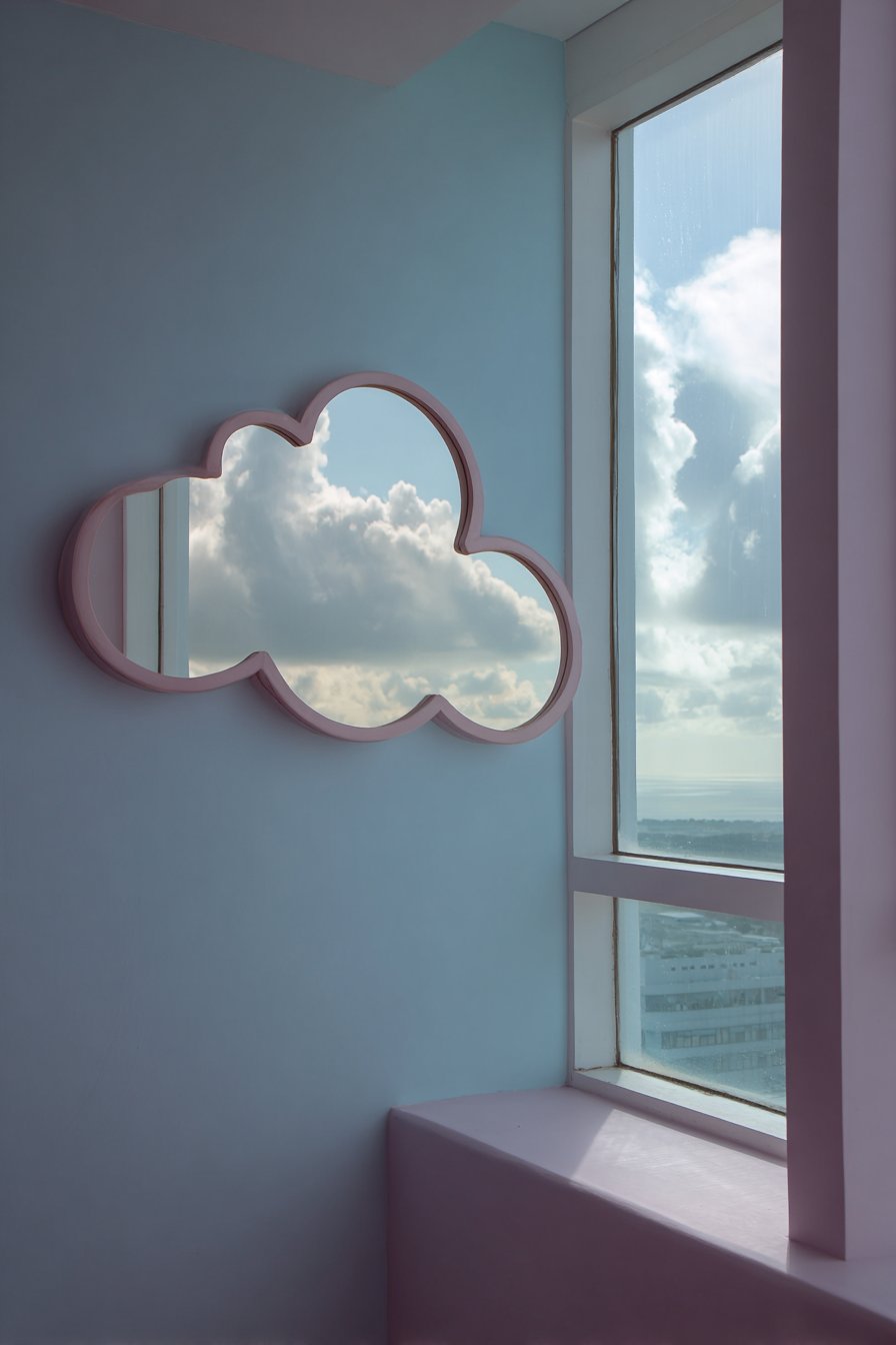 A whimsical cloud-shaped safety mirror with soft rounded edges mounted at child height on a pastel blue wall brings playful functionality to a nursery while prioritizing the paramount concern of child safety. This thoughtful room mirror idea recognizes that young children are naturally curious about mirrors and reflections, providing a safe, shatterproof surface designed specifically for small hands and faces to explore. The cloud shape adds enchanting character that complements the nursery’s gentle aesthetic while avoiding sharp corners or angles that could present safety hazards.