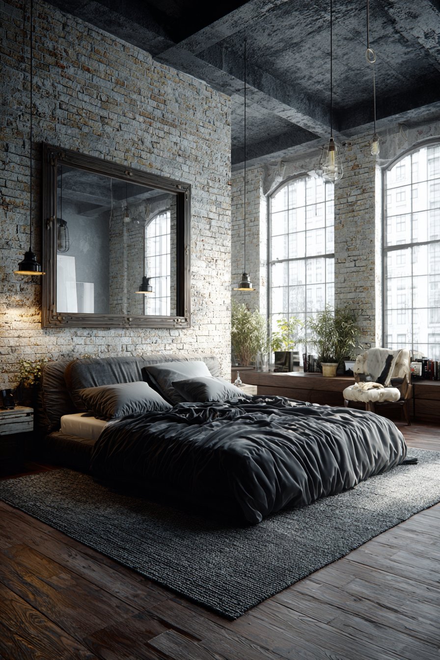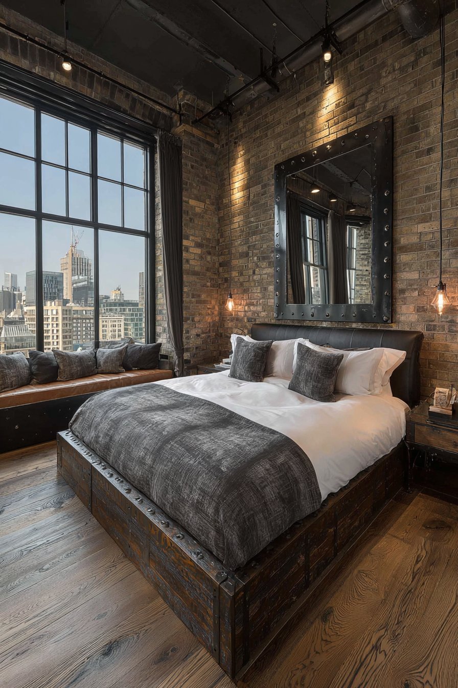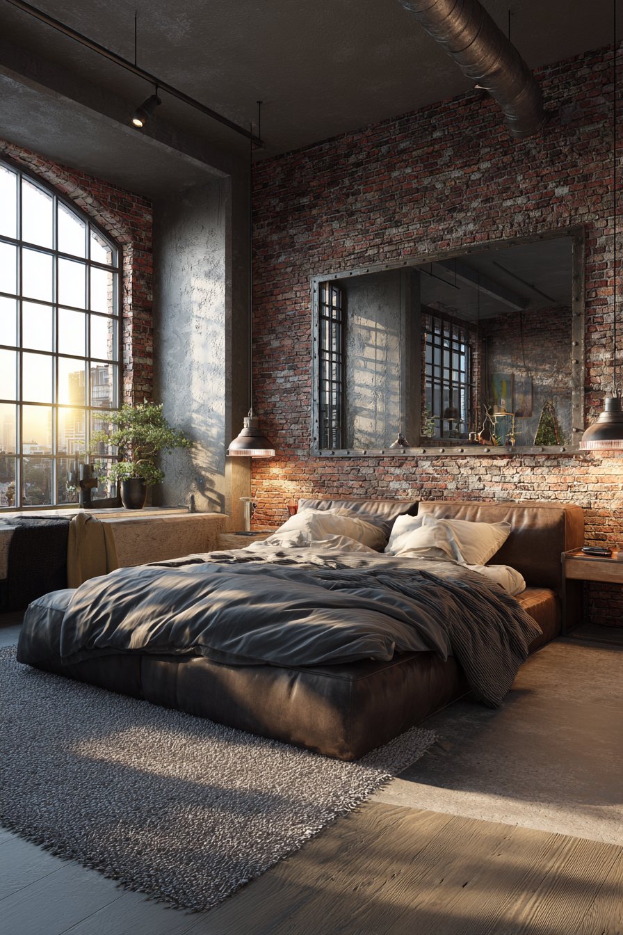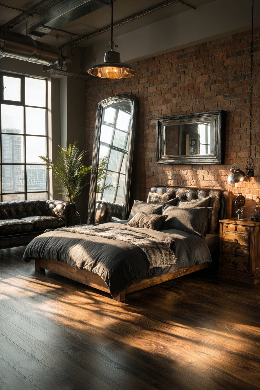 A massive rectangular mirror in a riveted metal frame with dark iron finish embodies industrial aesthetic when leaning dramatically against exposed brick walls in a loft bedroom, its substantial size and raw materials making an undeniable statement. This commanding room mirror idea celebrates the industrial style’s appreciation for utilitarian materials, architectural honesty, and bold scale, with the riveted frame suggesting repurposed factory equipment or salvaged architectural elements. The mirror’s impressive dimensions—often approaching eight feet in height—create powerful visual impact while serving the practical function of providing full-length reflection for outfit checking.