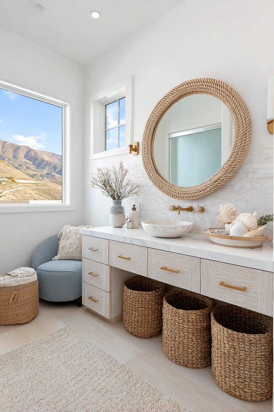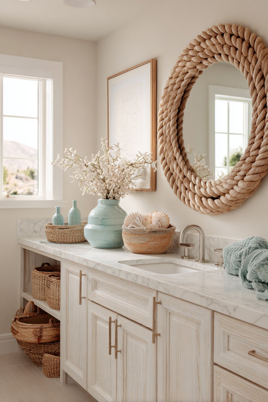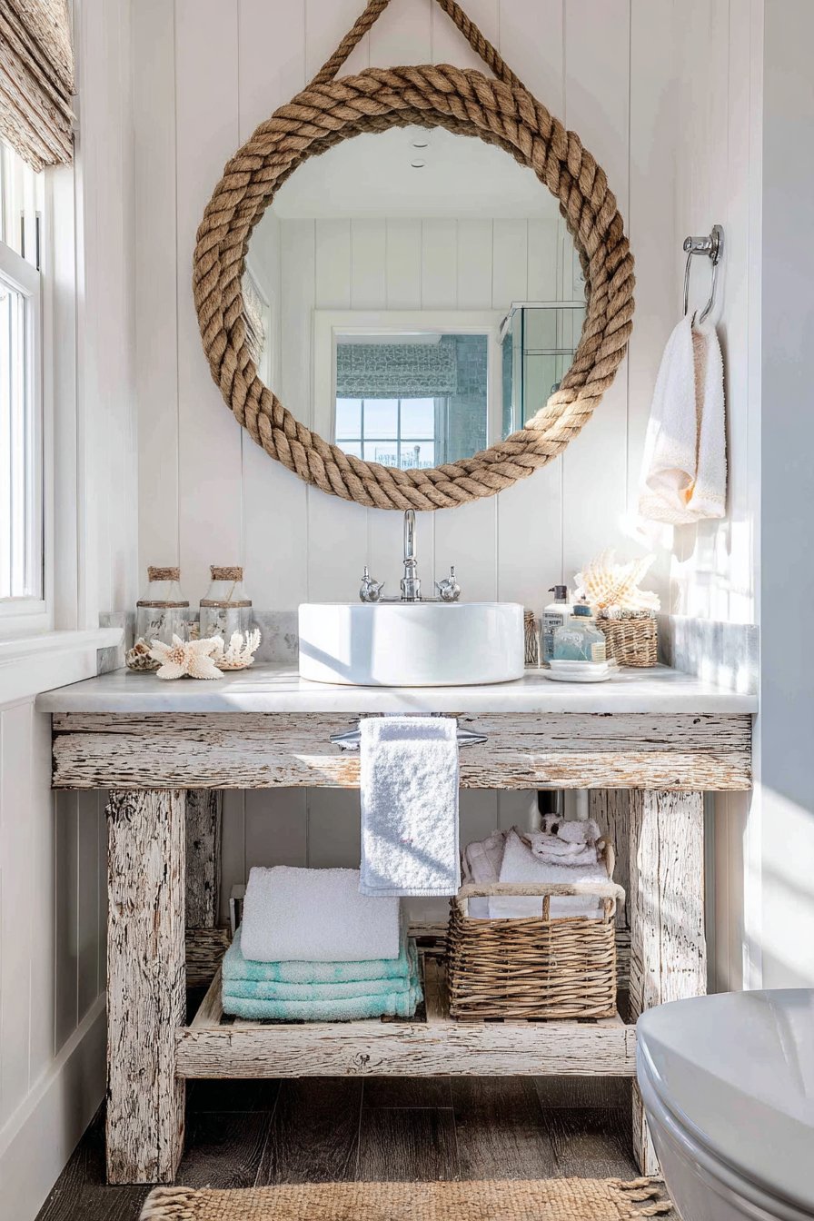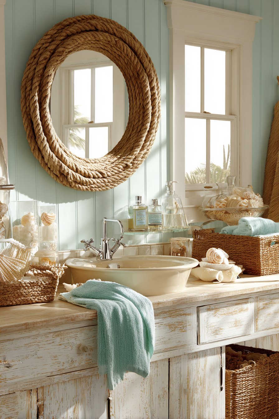 The mirror reflects soft aqua accents strategically placed throughout the bathroom—perhaps sea glass green towels, turquoise accessories, or ocean-blue decorative elements—while capturing natural light from a frosted window that provides privacy without sacrificing illumination. Seashell accessories and woven baskets complement the rope-framed mirror, building a cohesive coastal narrative that transports you mentally to seaside vacation even during daily morning routines. The whitewashed vanity continues the beach-cottage aesthetic, its deliberately weathered finish suggesting furniture naturally aged by salt air and sun exposure.