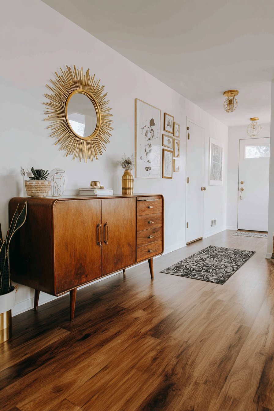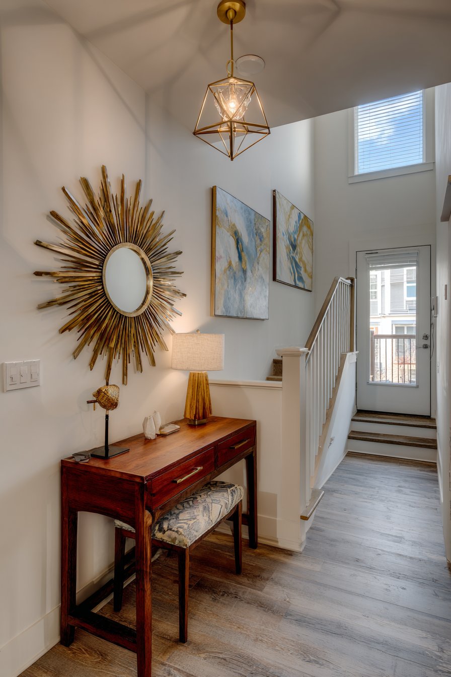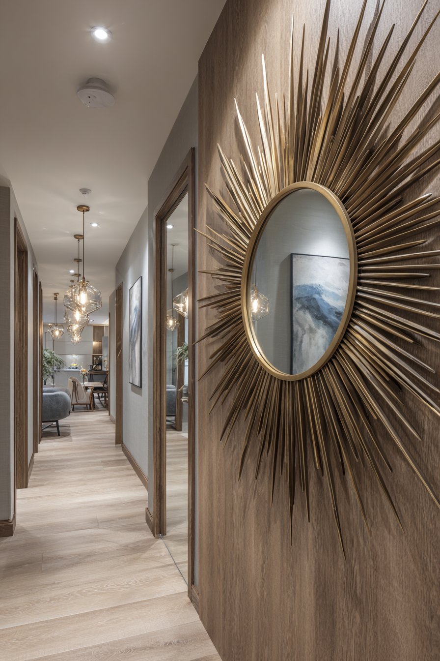 A sunburst mirror in antique brass finish creates retro focal point on a hallway gallery wall, its radiating design instantly evoking the optimistic, space-age aesthetic of mid-century modern design. This iconic room mirror idea features metal spokes extending from a central circular mirror like sun rays, creating dramatic sculptural presence that functions equally as art object and reflective surface. The antique brass finish provides warm metallic glow that catches and reflects light from pendant fixtures and nearby windows, creating sparkle and visual interest that draws the eye down otherwise plain hallways.