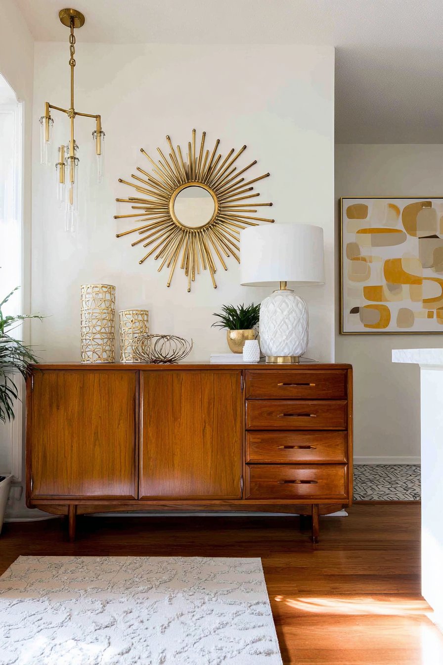 Positioned among carefully curated abstract artwork and period-appropriate decorative objects, the sunburst mirror anchors the gallery wall composition while introducing the dimensional depth that three-dimensional objects bring to flat wall displays. The mirror reflects pendant lighting’s ambient glow, effectively doubling the light source’s impact while creating intriguing multiple reflections of the fixture itself. Warm wood tones in vintage furniture pieces coordinate beautifully with the brass finish, building cohesive mid-century aesthetic that feels collected and authentic rather than theme-park reproduction.