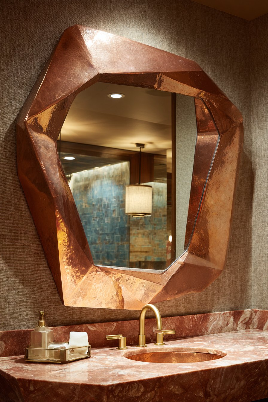Key Design Tips: Invest in genuine artisan-crafted mirrors with authentic hammer marks and hand-applied finishes rather than mass-produced imitations. Understand that living finishes like copper, brass, and bronze will naturally patina over time—embrace this evolution rather than fighting it with constant polishing. Position artisan mirrors where they can be properly appreciated, typically in powder rooms, entryways, or other spaces where visitors pause and take notice. Light these statement pieces thoughtfully to highlight texture and dimensional details that make handcrafted objects special. Keep surrounding elements relatively simple to allow the artisan mirror’s unique character to take center stage.