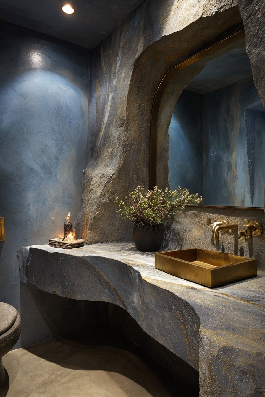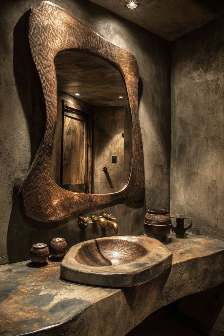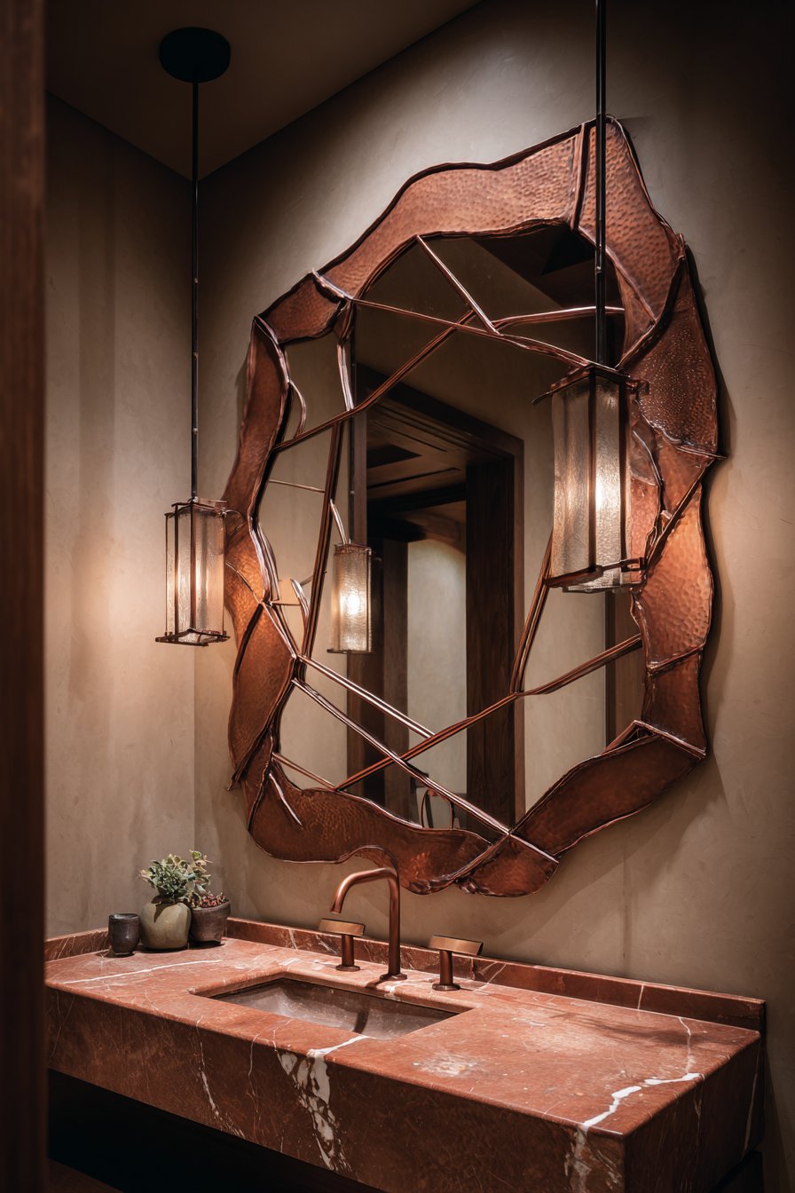 An irregularly shaped organic mirror featuring a hand-hammered copper frame brings sculptural artistry to a contemporary powder room, functioning simultaneously as essential reflective surface and statement art piece. This unique room mirror idea celebrates the beauty of handcrafted elements in an increasingly mass-produced world, with each hammer mark visible in the copper’s surface telling the story of the artisan’s creation process. The free-form, asymmetrical shape suggests natural elements like tide pools, geodes, or organic erosion patterns, providing visual relief from the rectangular geometry that dominates most interior spaces.