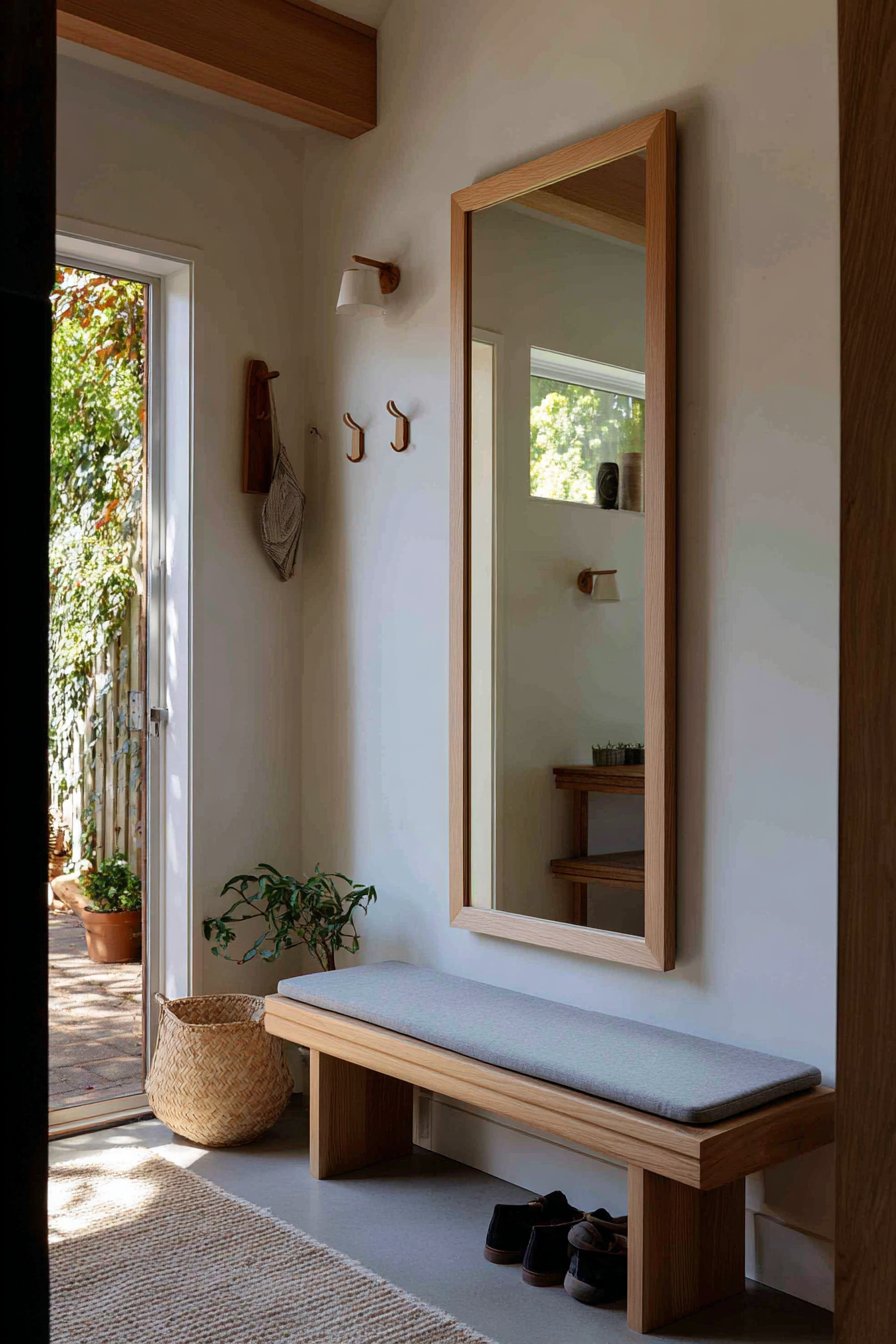 Key Design Tips: Choose light-colored wood frames in ash, white oak, or birch to maintain the bright, airy quality essential to Scandinavian design. Position entry mirrors where they receive and reflect natural light from doorway glass panels, sidelights, or nearby windows. Keep the reflection zone consistently organized to maintain the clean, calm aesthetic—add concealed storage if necessary to hide clutter. Pair mirrors with functional elements like hooks, benches, and baskets that address practical entry needs while maintaining minimal visual impact. Select simple, organic shapes and natural materials that align with Scandinavian principles of understated beauty and practical elegance.
