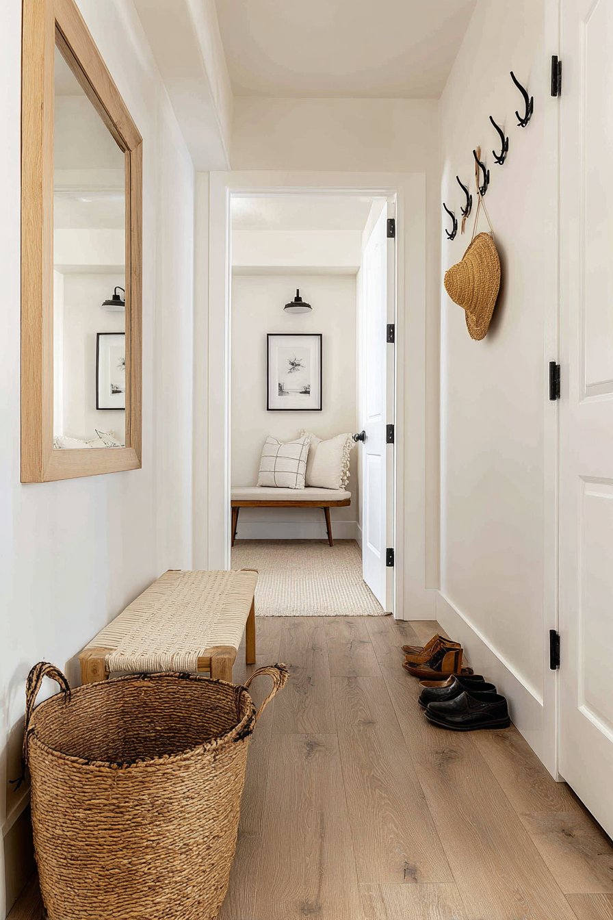 The mirror’s vertical orientation emphasizes the entry’s height while providing full-length reflection for outfit assessment from head to toe. Positioned alongside wall-mounted hooks that provide convenient storage for coats, bags, and scarves, plus a simple bench for comfortable shoe removal, the mirror becomes part of a comprehensive organizational system that addresses every practical need of an entryway. Minimalist accessories—perhaps a woven basket for shoes and a small tray for keys—maintain the clean aesthetic while providing additional functionality.