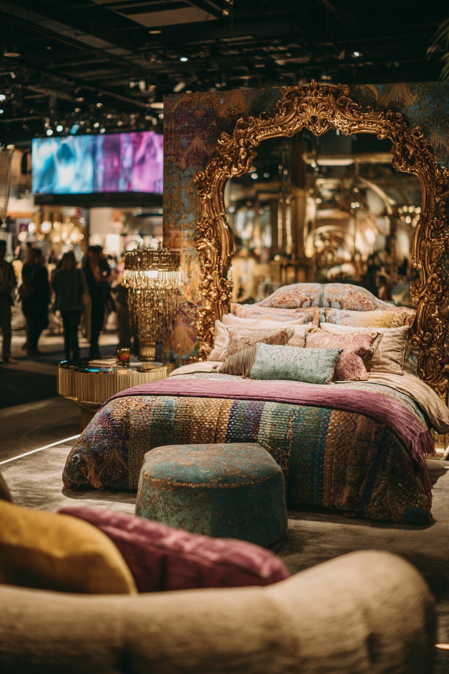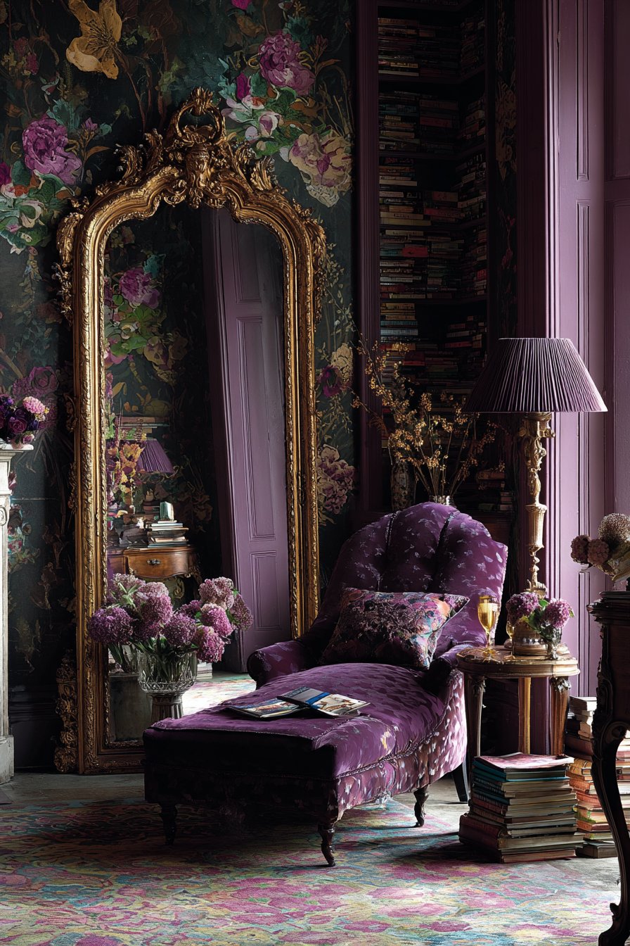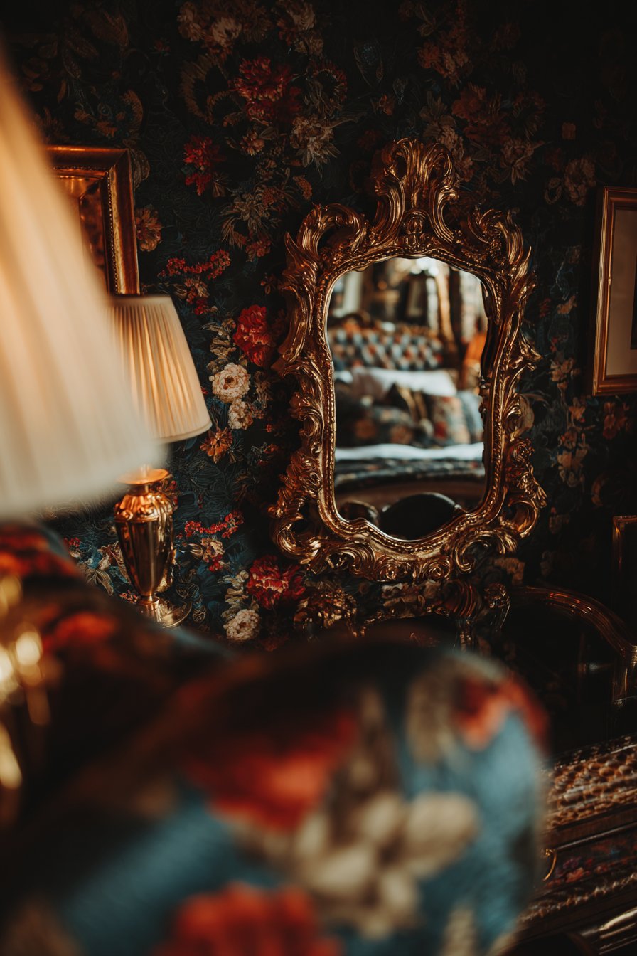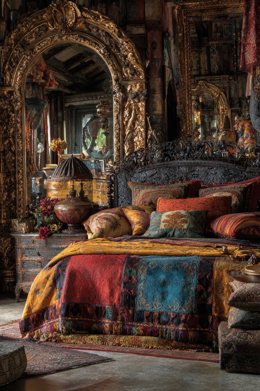 An elaborate gilded frame with baroque detailing showcases the maximalist design philosophy that celebrates abundance, ornamentation, and dramatic visual impact, positioned prominently in a bedroom corner where it can reflect the room’s riot of colors, patterns, and textures. This opulent room mirror idea features scrolling acanthus leaves, cherub details, floral motifs, and complex molding that create three-dimensional sculptural presence worthy of palace halls or grand estates. The heavily gilded finish catches and reflects light from multiple sources throughout the room, creating sparkle and shimmer that changes constantly as viewing angles shift.