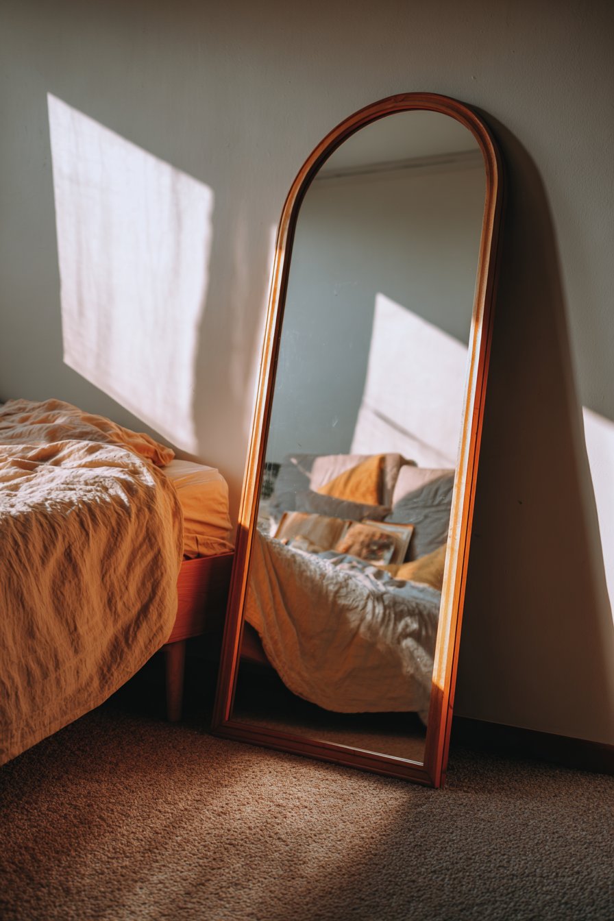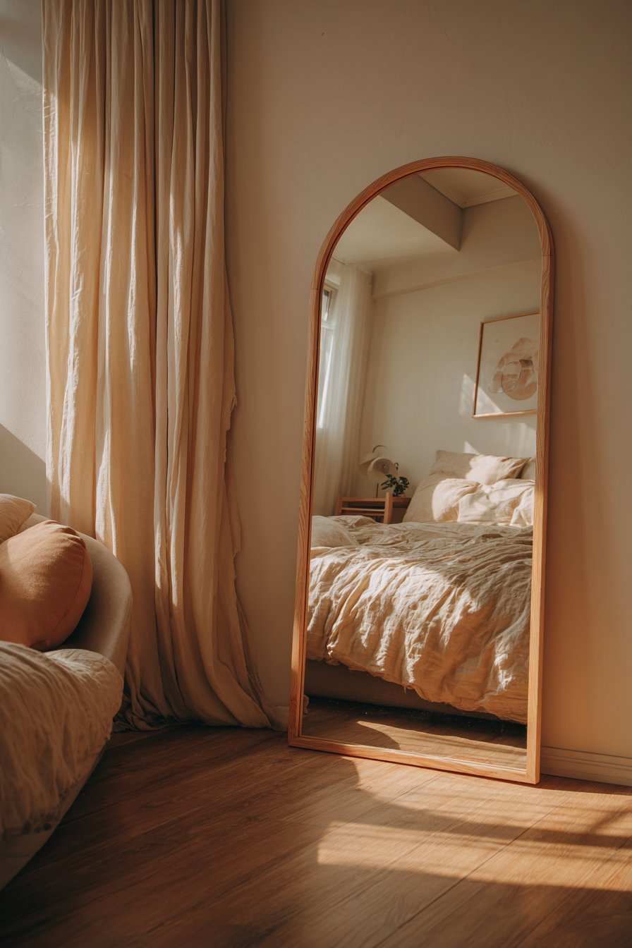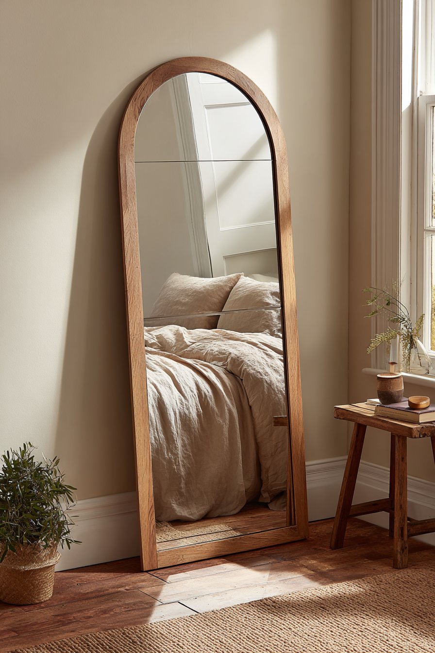 Morning light filtering through nearby windows creates the most enchanting effect with this room mirror idea, casting soft shadows that accentuate the mirror’s graceful arch while illuminating the reflected scene. The casual lean rather than formal mounting gives the space a relaxed, lived-in quality that invites comfort rather than formality. This positioning also offers practical flexibility—the mirror can be easily adjusted or relocated as your room’s layout evolves, making it perfect for renters or those who enjoy periodically refreshing their space.