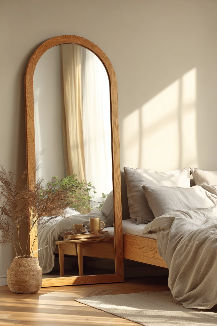 The gentle curve of an arched floor mirror in a natural oak frame brings organic softness to a bedroom corner, leaning casually against a cream-colored wall in the effortlessly chic manner characteristic of Scandinavian design. This full-length mirror reflects a carefully composed vignette of neutral linen bedding and a cozy reading nook, creating depth while maintaining the room’s serene, uncluttered aesthetic. The oak frame’s light, natural finish introduces warmth without disrupting the space’s peaceful color palette, while the arched top adds architectural interest that echoes the gentle curves found in nature.