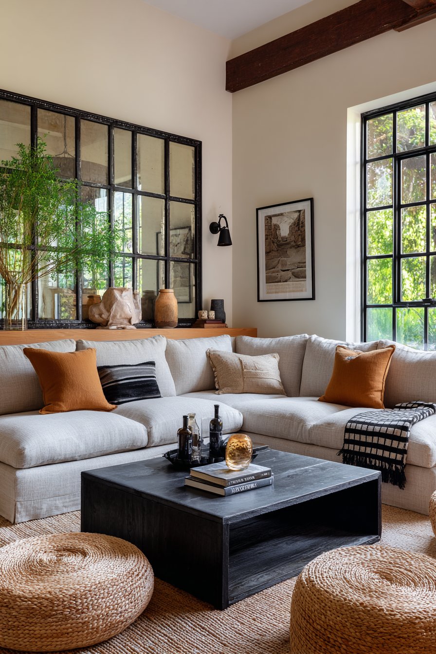 Key Design Tips: Select windowpane mirrors with sturdy metal frames and securely mounted individual panes to ensure long-lasting durability. Position these architectural mirrors where they complement rather than compete with actual windows—often on perpendicular or opposite walls. Clean individual panes carefully to maintain visibility while avoiding damage to the muntins separating them. Coordinate frame finish with other black elements in the room like light fixtures, hardware, or furniture pieces for cohesive design. Consider the windowpane mirror’s grid pattern when planning wall arrangements, ensuring surrounding elements work with rather than fight the strong linear design.