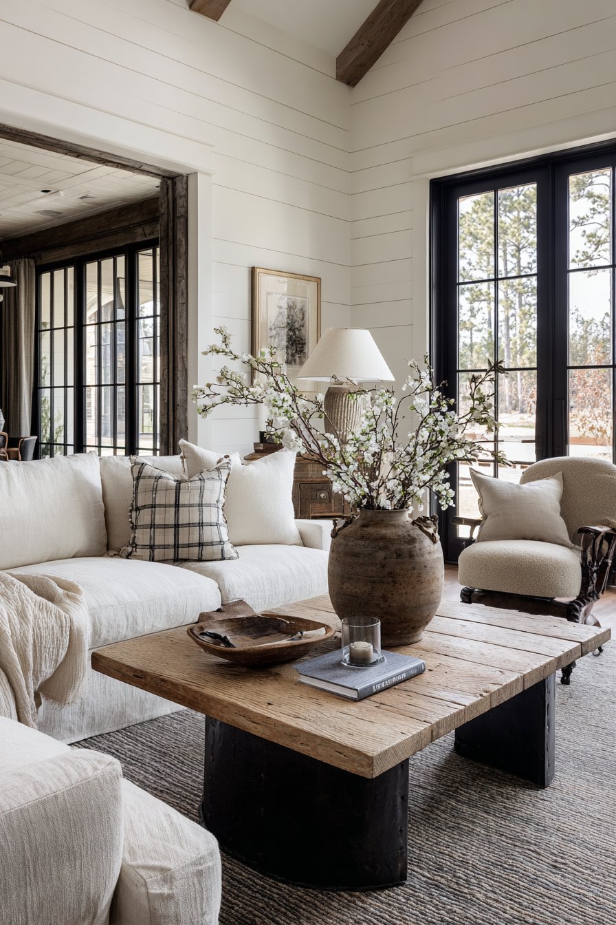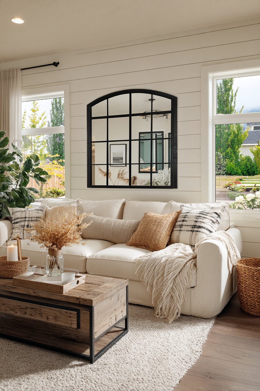 This room mirror idea exemplifies modern farmhouse style’s ability to balance rustic elements with contemporary sensibilities, avoiding the overly precious or theme-park quality that can afflict purely traditional farmhouse decor. The black metal frame feels current and fresh rather than dated, while the windowpane configuration honors farmhouse tradition. The mirror’s architectural quality allows it to function almost as a structural element rather than mere accessory, adding perceived dimension and depth to the wall.