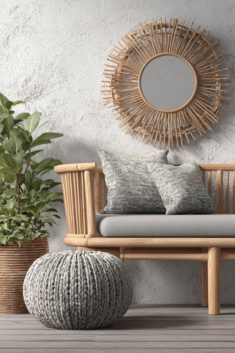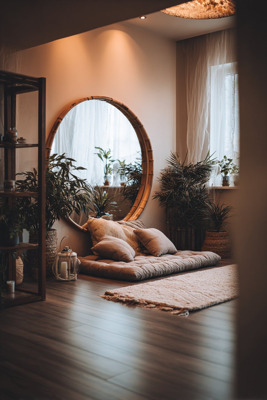 The mirror reflects soft natural light filtering through nearby windows along with carefully chosen indoor plants that bring living energy into the meditation space, creating gentle visual interest without causing distraction or overstimulation. Floor cushions in neutral tones provide comfortable seating for meditation practice, while the minimal decor allows the mind to rest rather than constantly processing visual information. The bamboo’s sustainable, fast-growing nature aligns with zen principles of environmental mindfulness and living in harmony with nature.
