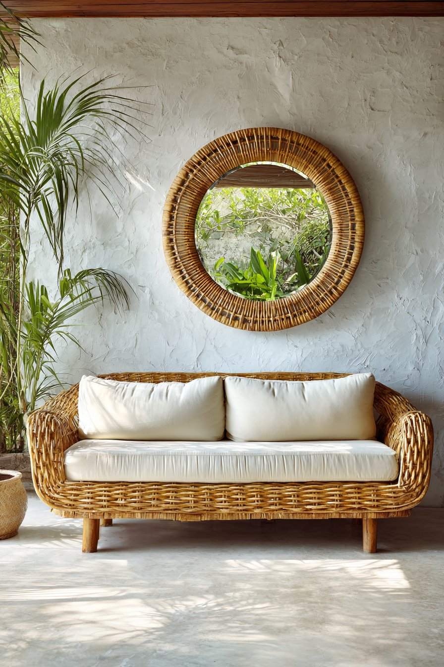 This room mirror idea demonstrates how frame materials can dramatically influence a mirror’s stylistic impact—the same round mirror in a sleek metal frame would read as modern, while a carved wood frame might suggest traditional or rustic styling. The rope’s neutral tan color provides organic warmth while coordinating effortlessly with virtually any coastal color palette, from crisp navy-and-white nautical schemes to soft seafoam-and-sand palettes. The textured frame also serves practical purposes, disguising fingerprints or minor wear that might show obviously on smooth, painted surfaces.