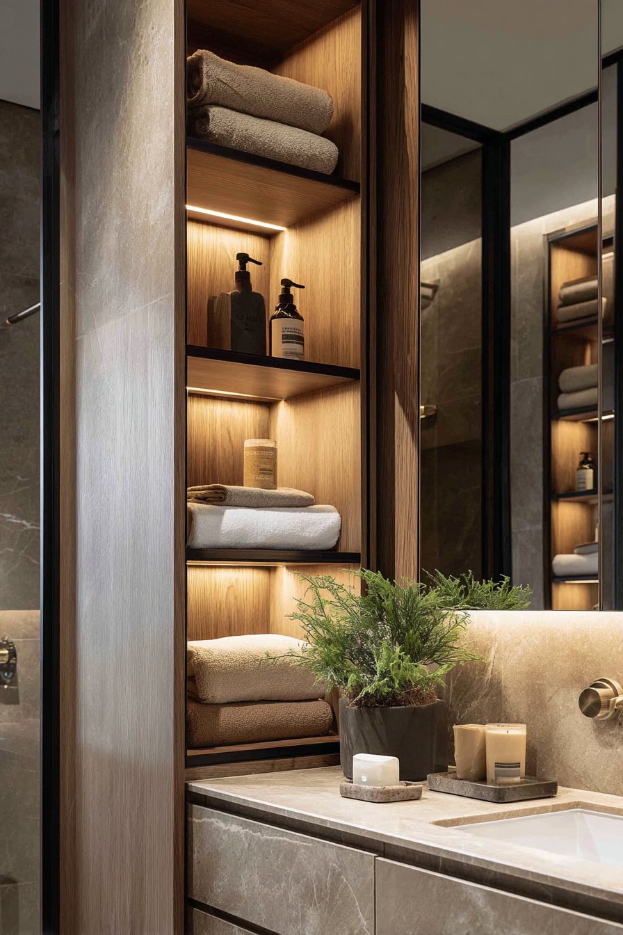 This practical room mirror idea addresses one of small-bathroom design’s greatest challenges: providing adequate storage without consuming precious floor space or making the room feel cramped and cluttered. The concealed storage keeps countertops clear of daily-use items that might otherwise create visual chaos, maintaining the clean, calm aesthetic essential to making small bathrooms feel larger and more pleasant. The soft-close mechanism prevents the jarring slam that might occur with standard cabinet doors, adding refined detail that elevates the overall user experience.