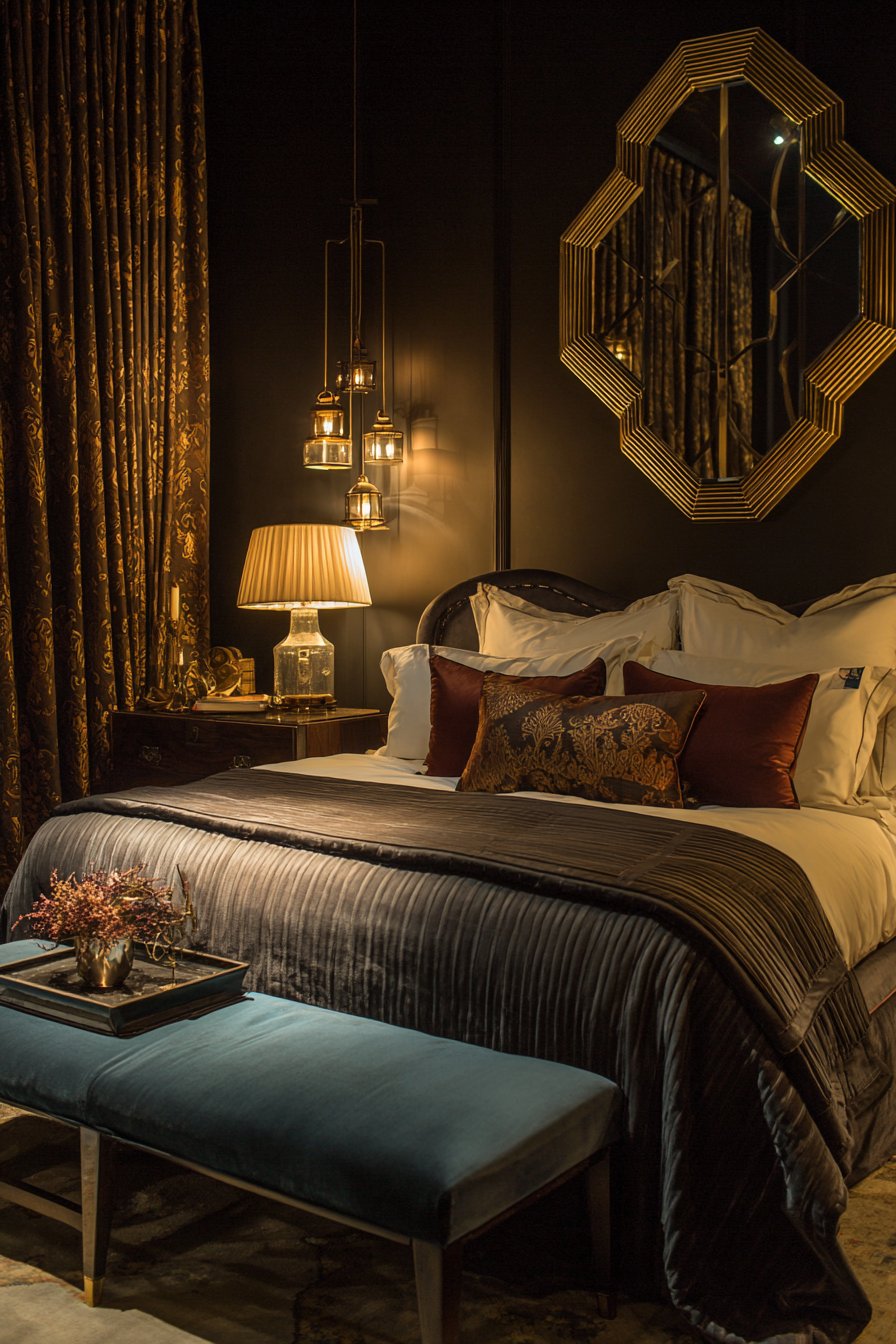 An octagonal mirror featuring a stepped geometric frame in polished chrome finish captures the sophisticated glamour of art deco design, mounted above a velvet upholstered bench in a bedroom that celebrates the era’s distinctive aesthetic. This striking room mirror idea showcases art deco’s love of geometric patterns, luxurious materials, and machine-age modernism through the eight-sided shape and chrome’s reflective metallic finish. The stepped frame design creates dimensional interest through layered planes that catch and reflect light differently, producing the play of highlights and shadows that makes art deco design so visually dynamic.