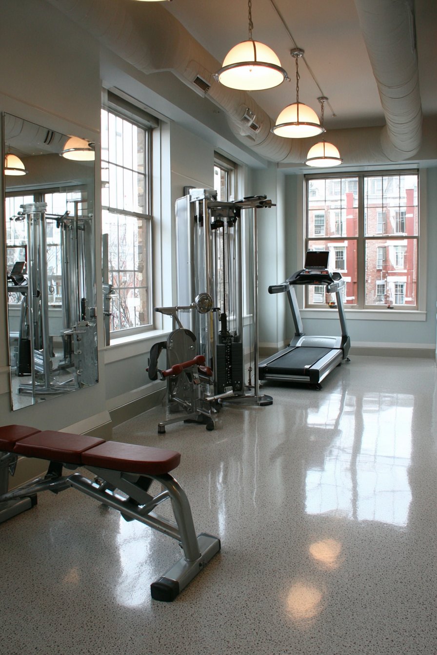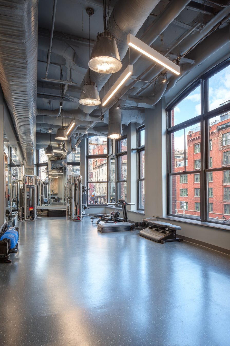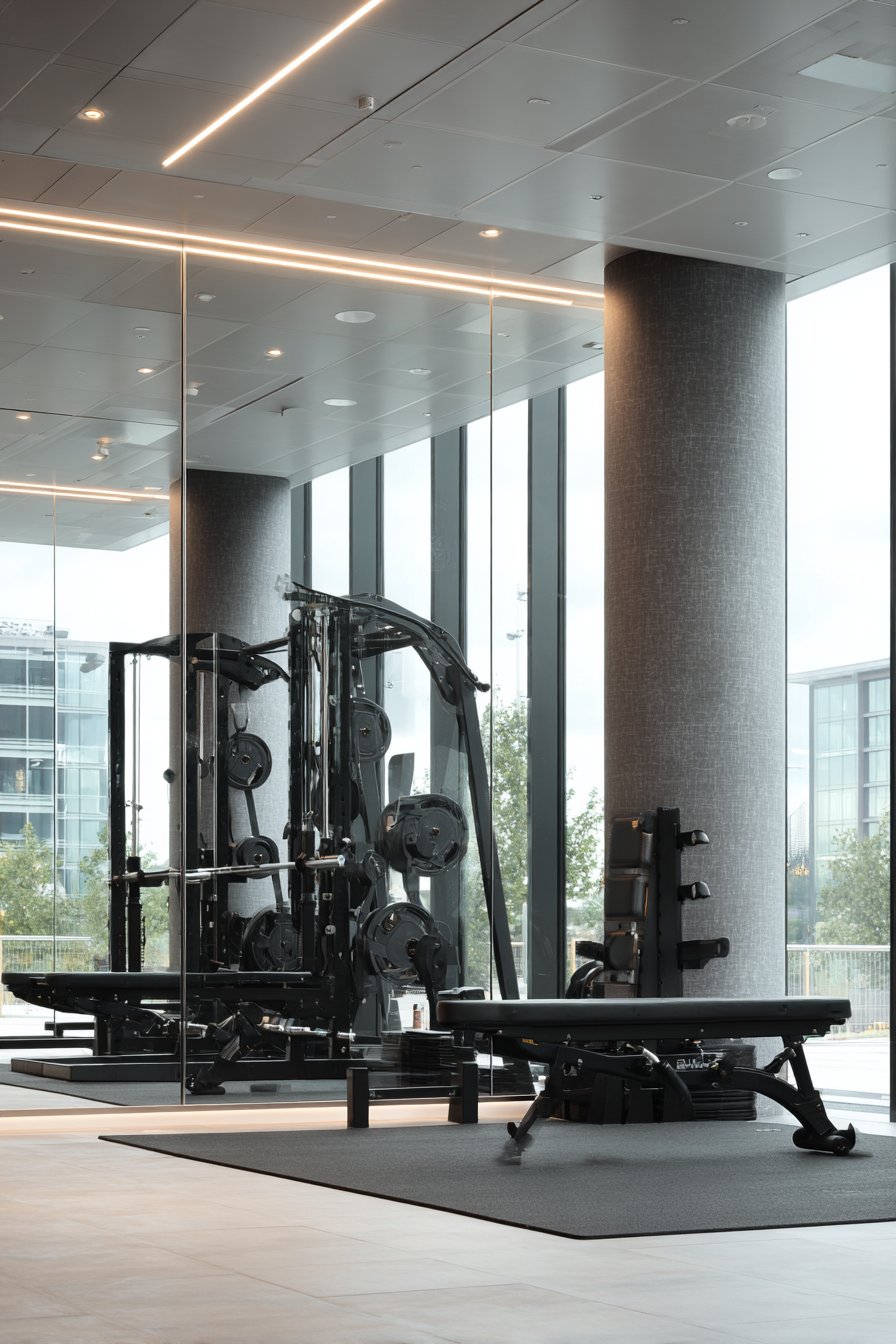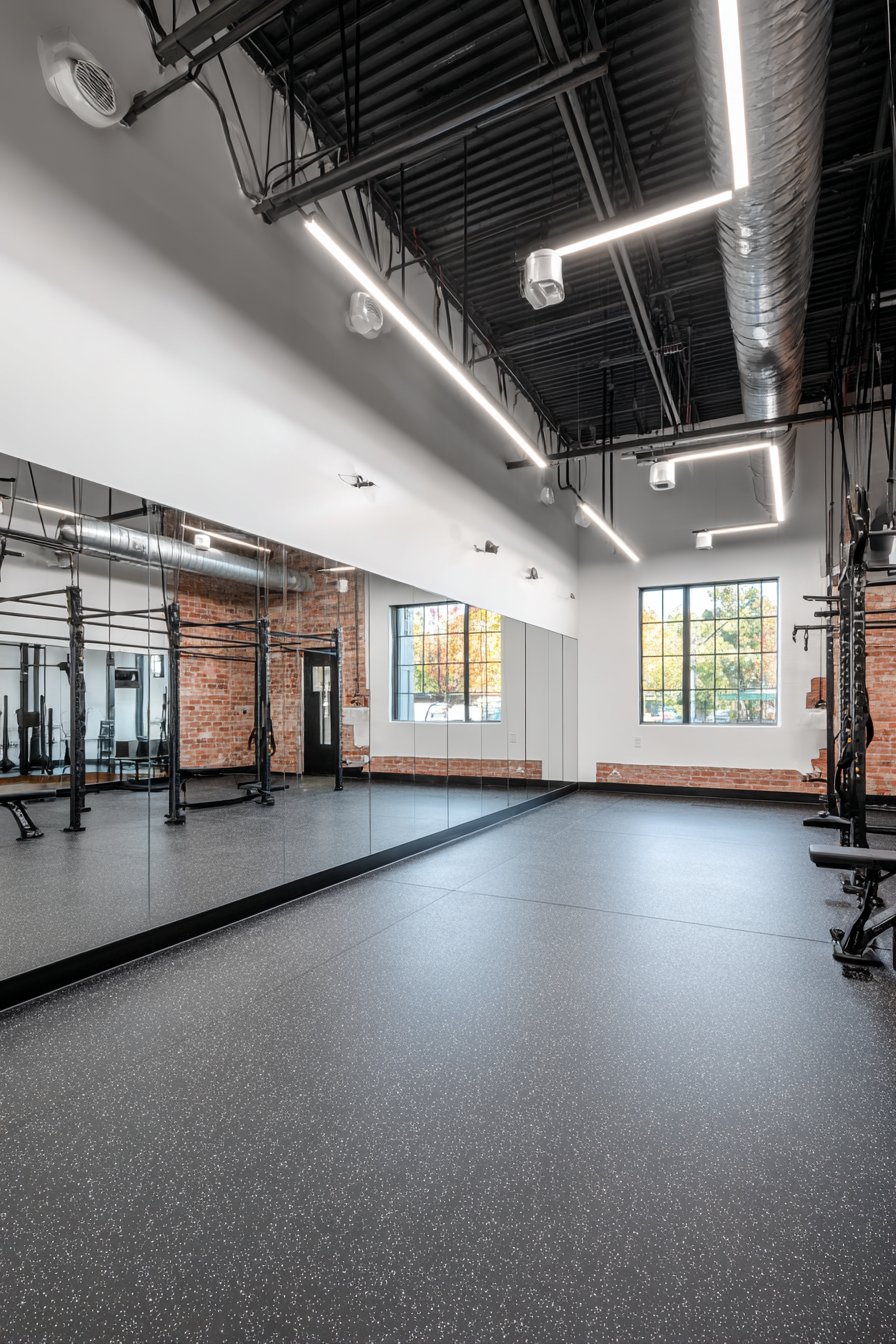 The wall-to-wall installation creates seamless reflective surface without interrupting seams or frames that might distract during workouts, while the floor-to-ceiling height ensures visibility from floor exercises through standing movements and overhead presses. Rubber flooring provides impact absorption and easy maintenance appropriate for fitness spaces, while minimal equipment maintains the clean, focused aesthetic that supports concentrated training. Natural light from high windows combines with overhead LED lighting to ensure even, shadow-free illumination that allows accurate assessment of movement and form from any angle.
