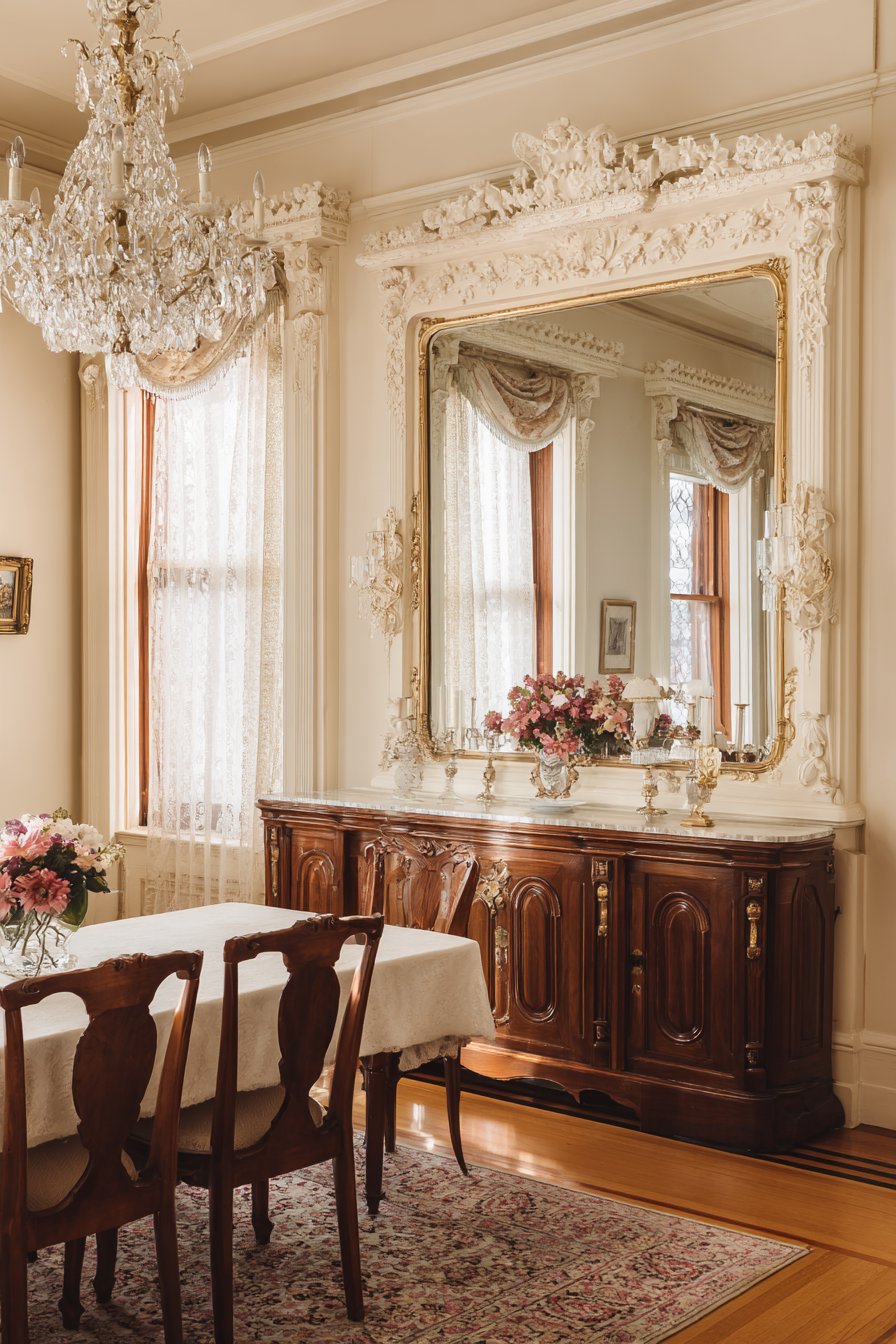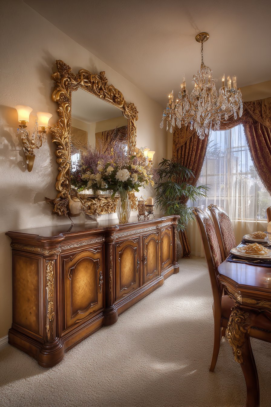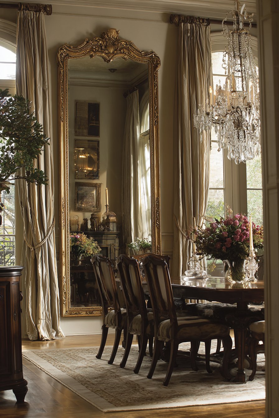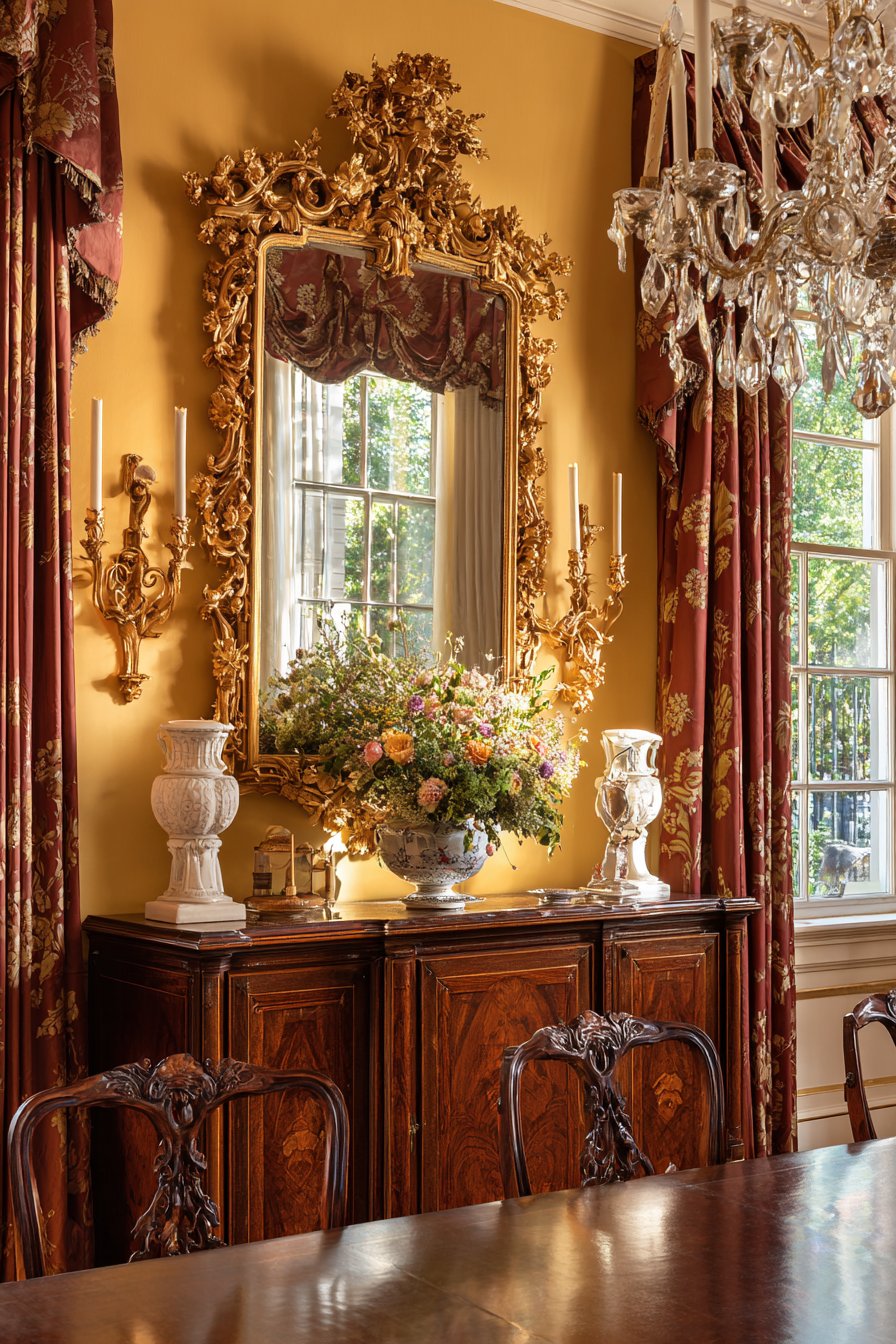 Key Design Tips: Invest in quality frames with genuine carved detailing rather than molded reproductions that lack the depth and craftsmanship of authentic traditional pieces. Size dining room mirrors to span roughly two-thirds of the sideboard or buffet width for balanced proportions. Position mirrors to reflect the chandelier and table settings while avoiding reflections of kitchen doorways or less attractive views. Clean gilt frames carefully using soft, dry cloths or specialized gold-cleaning products that won’t damage delicate gilding. Maintain the formal aesthetic through coordinated elements like matching candlesticks, formal table linens, and quality serving pieces.