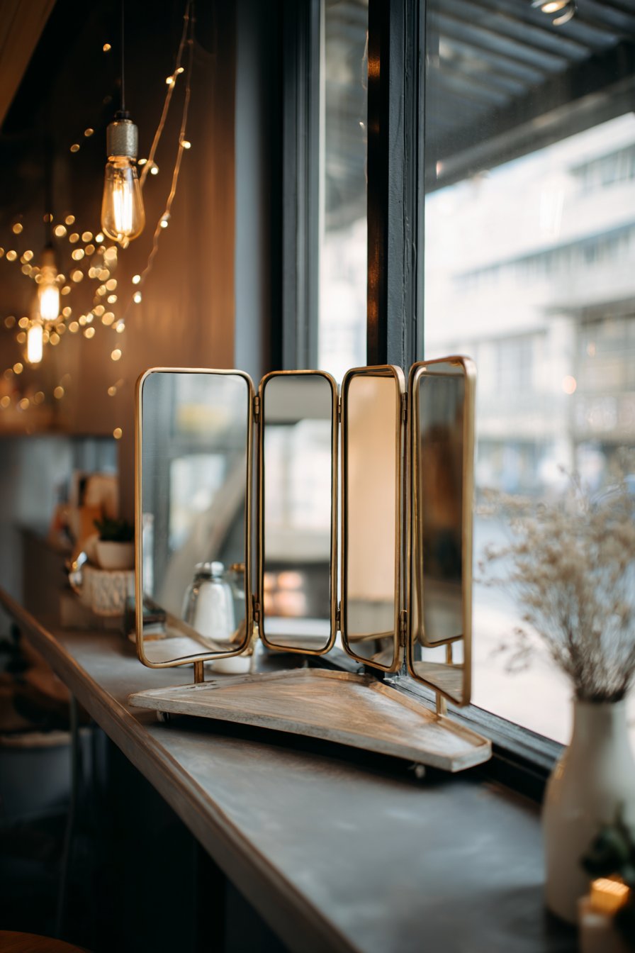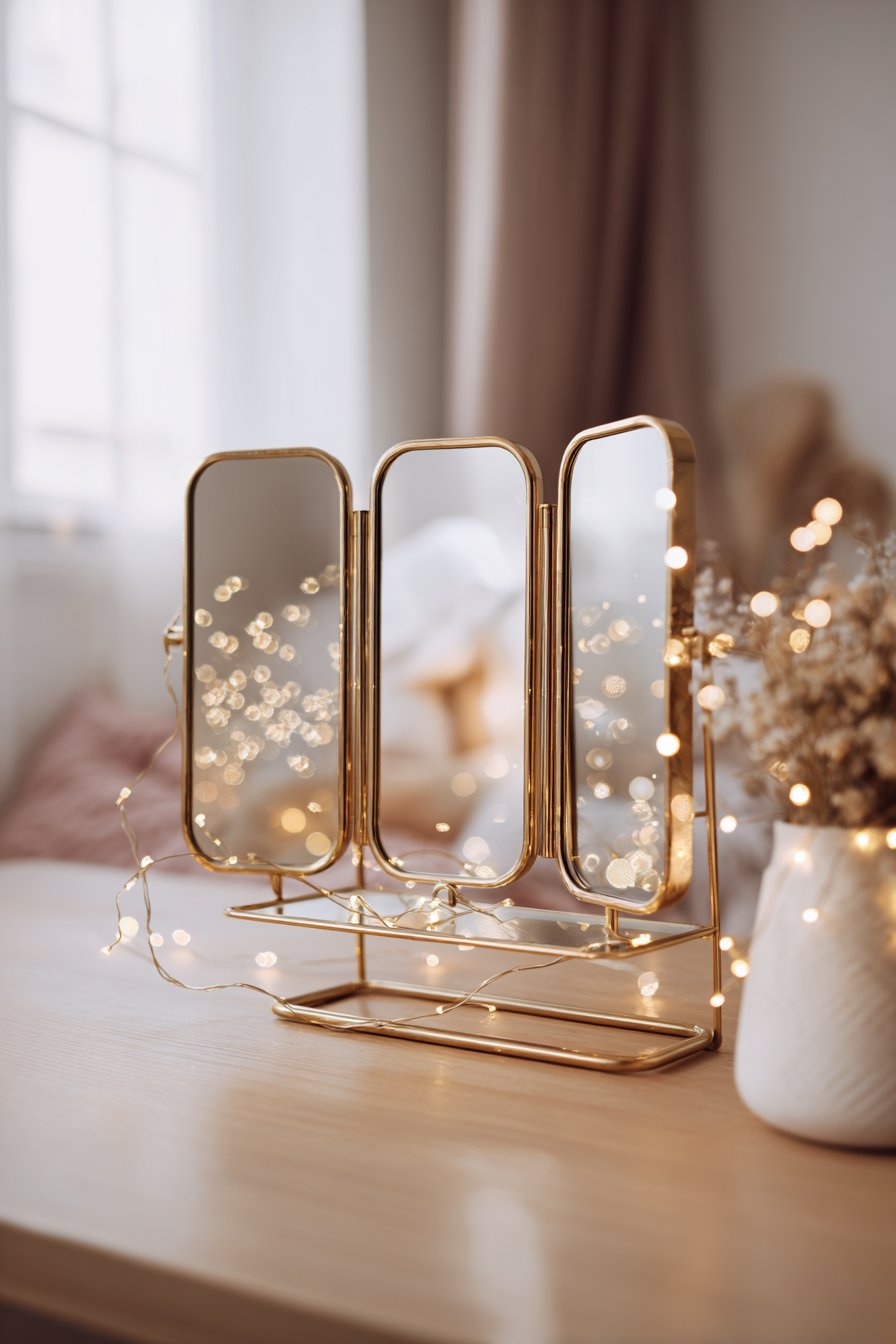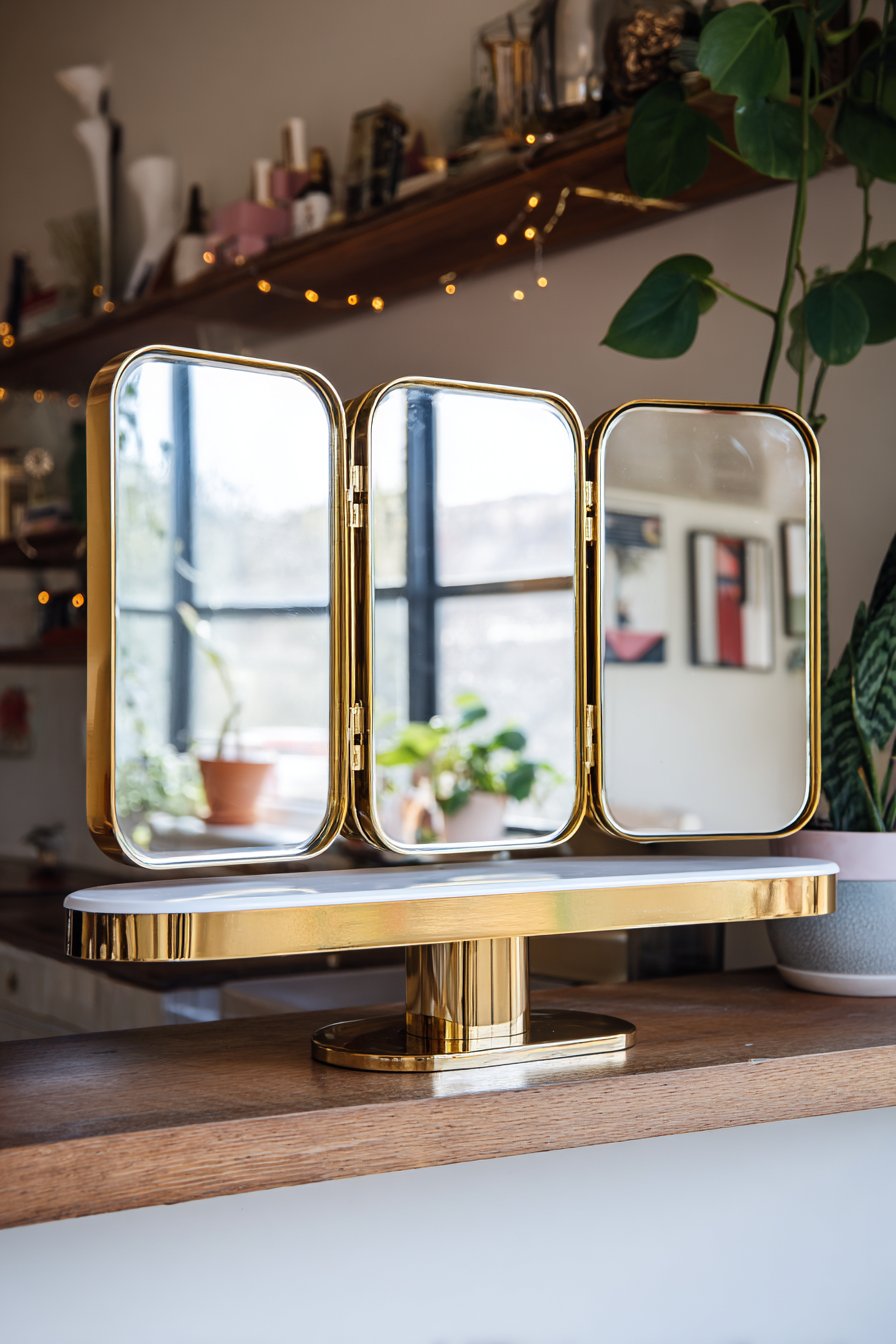 Key Design Tips: Choose triptych mirrors with smooth, reliable hinge mechanisms that allow easy adjustment of side panels without binding or loosening over time. Position vanity mirrors where they receive adequate natural or artificial lighting for accurate color representation during grooming. Use the floating shelf or vanity surface for organized display of frequently used items arranged in attractive, considered compositions. Clean all three mirror panels regularly to maintain clarity, including the back surfaces of adjustable side panels that can accumulate dust. Coordinate frame finish with other warm metals in the space like brass lamp bases, copper planters, or gold-toned hardware.