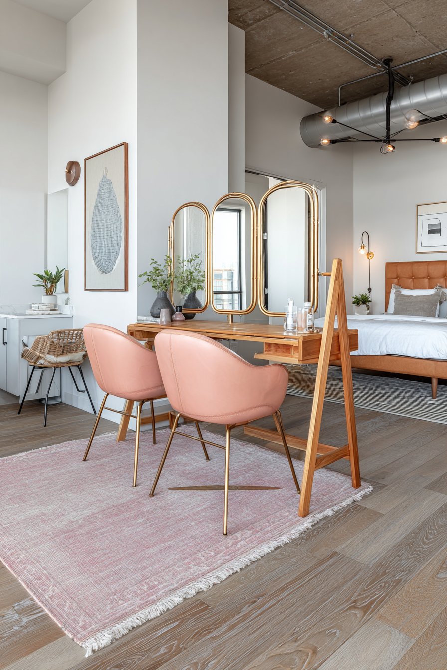 This room mirror idea works beautifully in bedrooms where you want personal grooming space that feels collected and unique rather than generic and mass-produced. The triptych design adds architectural interest through the three-dimensional form created by adjustable side panels, while the vintage styling introduces character and personality that modern frameless mirrors cannot provide. The gold finish adds warmth and subtle luxury without overwhelming small spaces or competing with other design elements.