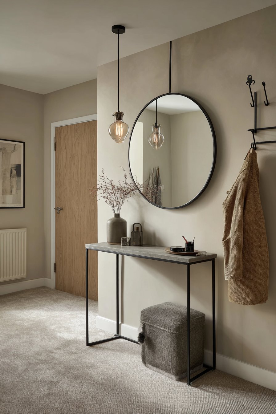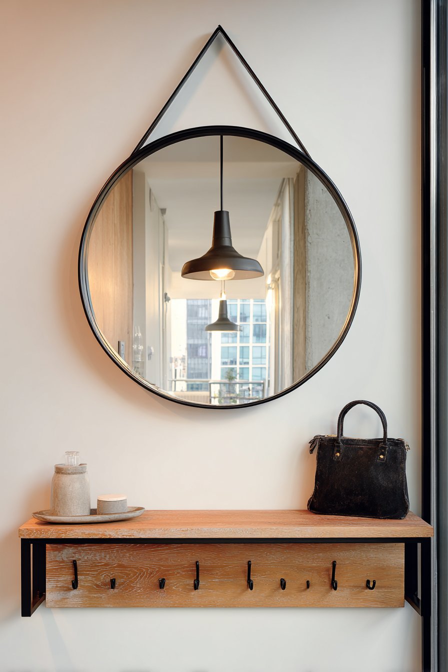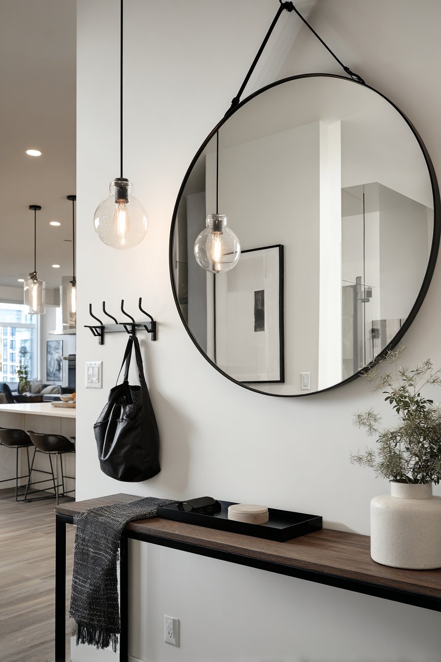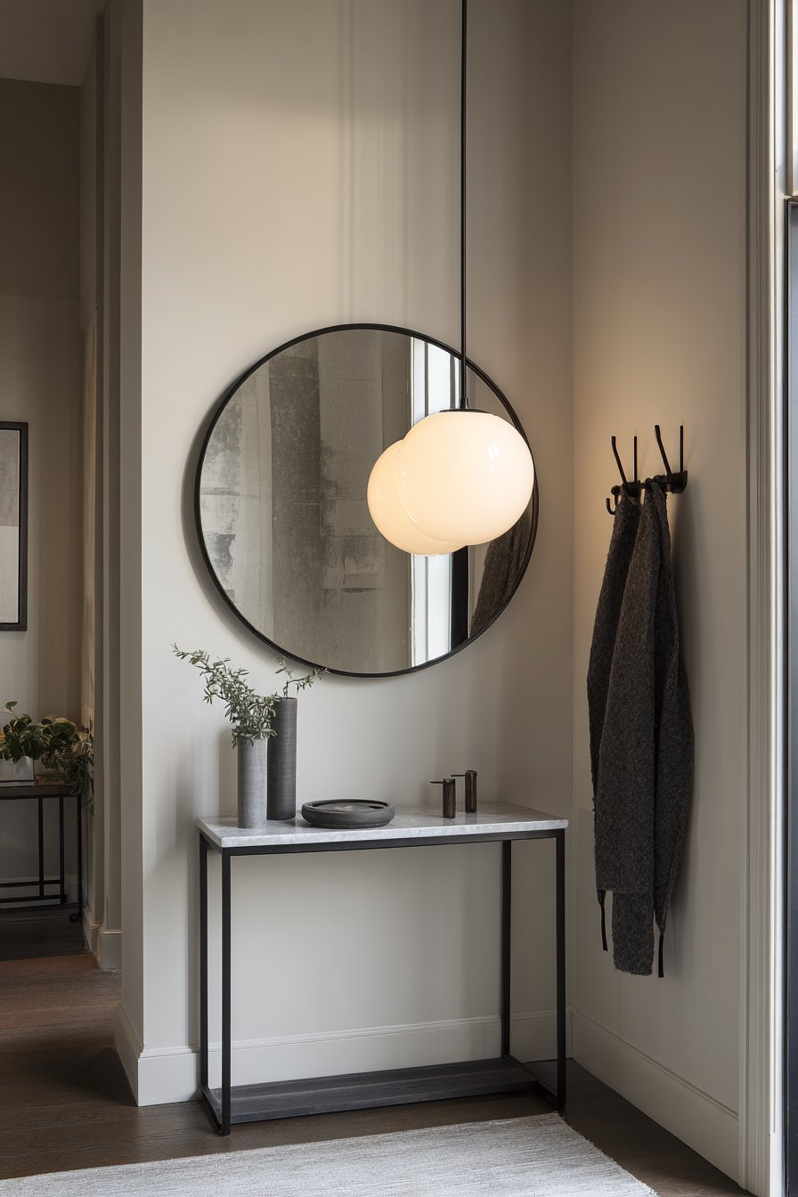 A round convex mirror with a thin black metal frame proves that powerful design impact doesn’t require substantial square footage, demonstrating how the right room mirror idea can transform even the most compact entryway into a welcoming and functional space. Mounted strategically above a narrow console table, this clever mirror style creates an intriguing fish-eye reflection that captures the hallway’s depth and the glow of a hanging pendant light, producing an illusion of expanded space in an area where every inch counts. The convex surface provides a wider field of view than a flat mirror, allowing you to glimpse approaching visitors or quickly check your appearance from multiple angles.