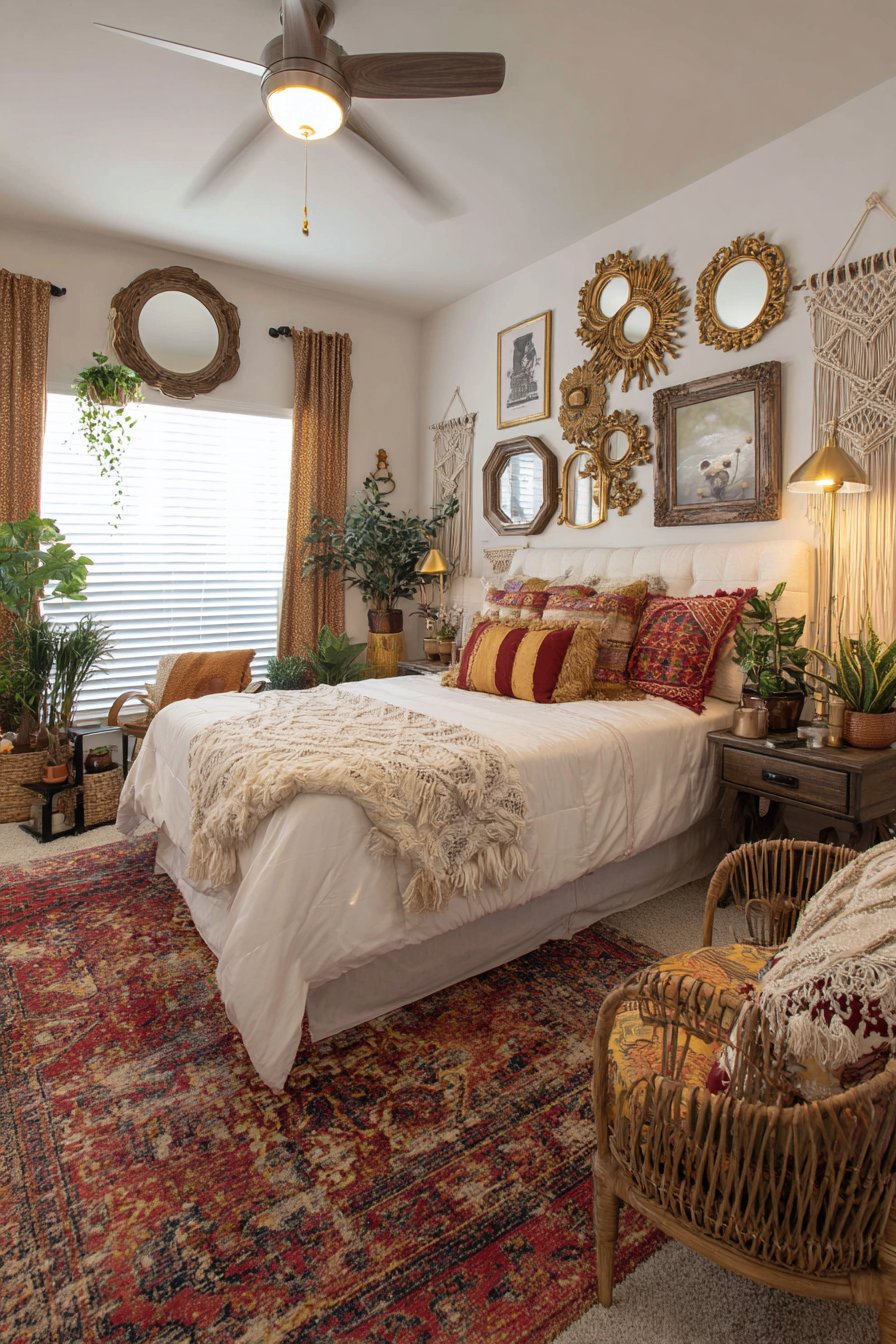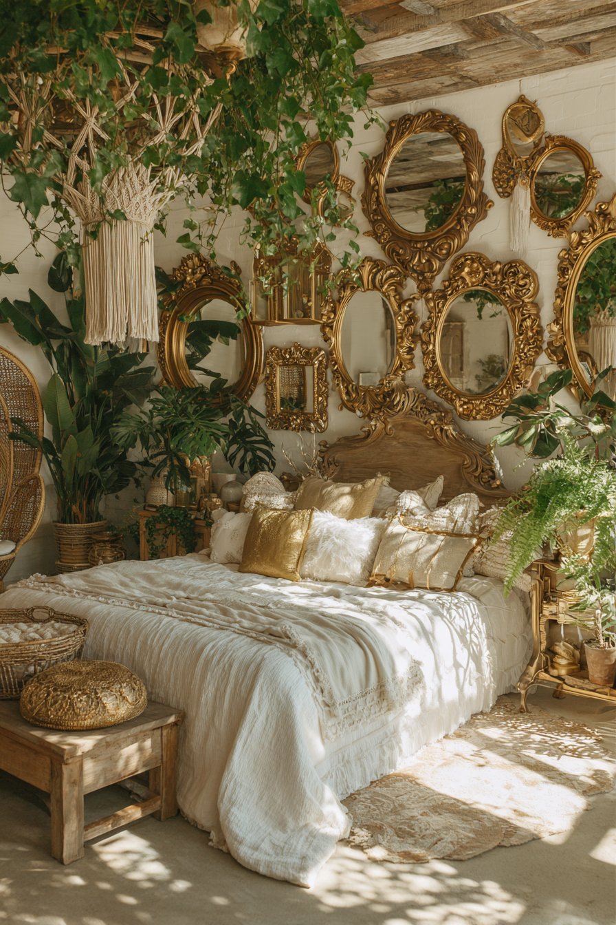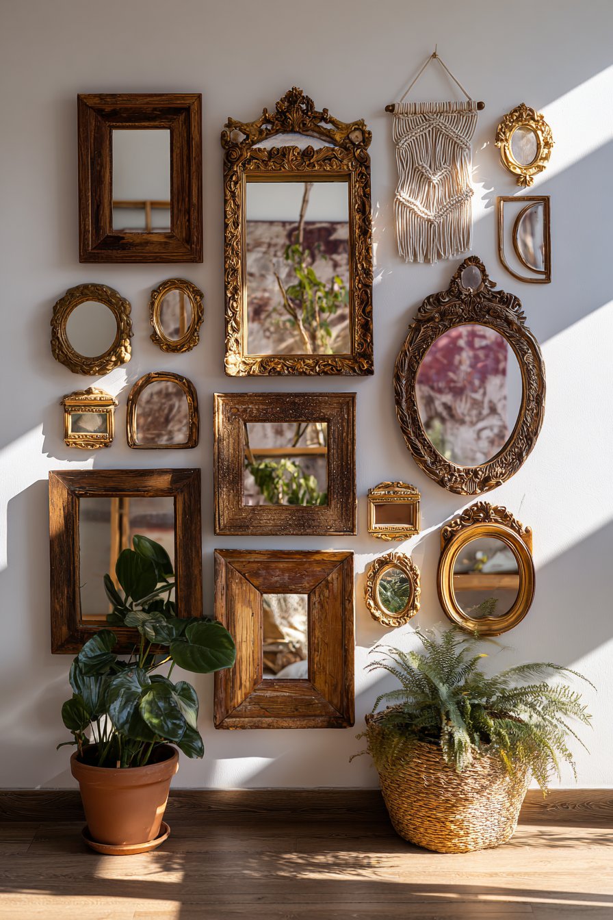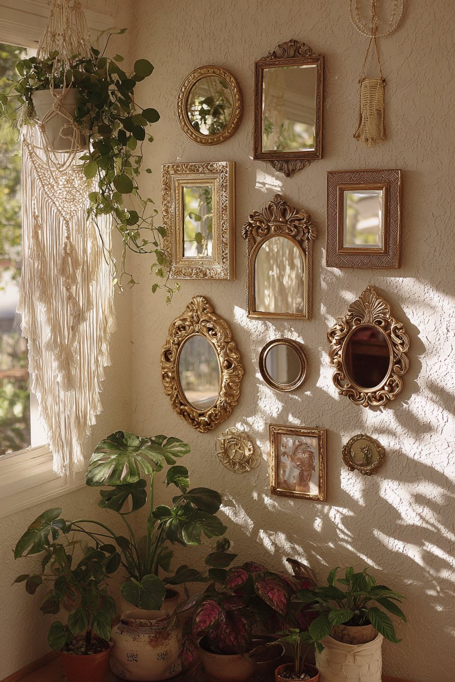 Natural lighting plays a crucial role in bringing this room mirror idea to life, as sunlight interacts with the varied frame finishes to create an ever-changing display of highlights, shadows, and reflected patterns throughout the day. The ornate frames themselves become sculptural elements worthy of attention even without their reflective surfaces, their three-dimensional details casting intricate shadows against the wall. Complementary bohemian elements like macramé wall hangings and cascading potted plants enhance the layered, collected-over-time aesthetic that makes boho style feel personal and authentic rather than merely decorated.