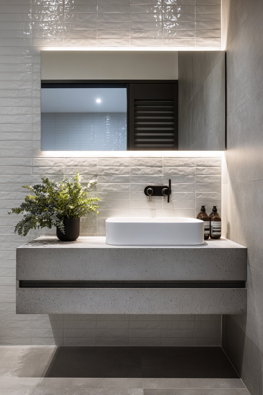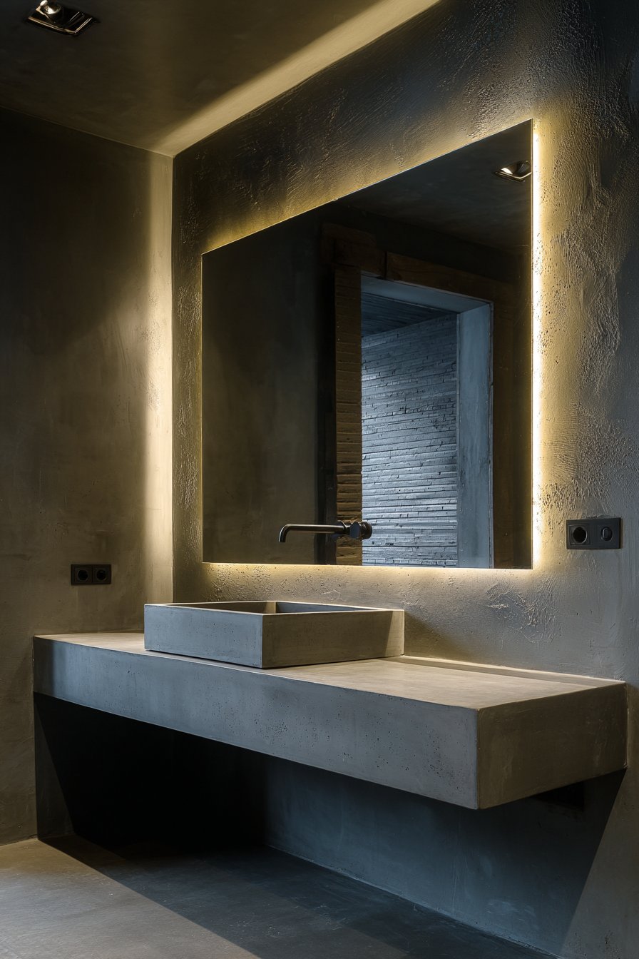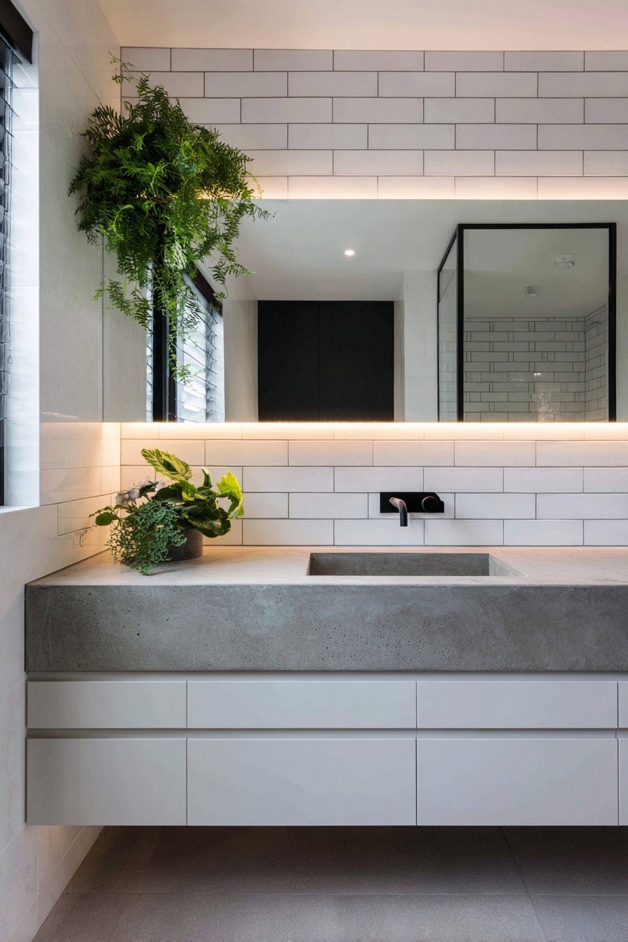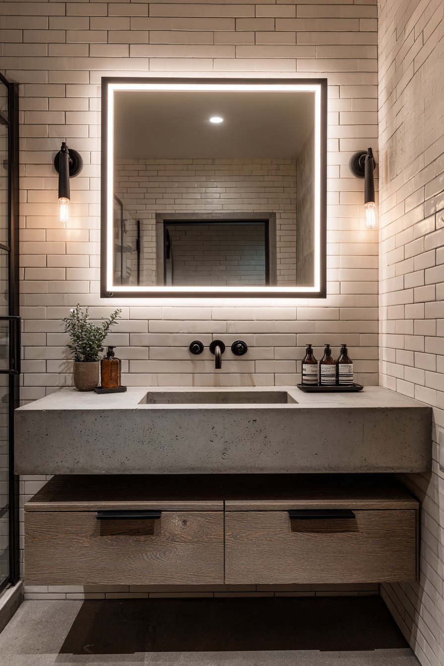 Sleek sophistication defines this modern bathroom room mirror idea, where a frameless rectangular mirror features integrated LED backlighting that serves both aesthetic and functional purposes with remarkable efficiency. Mounted above a floating concrete vanity, the illuminated mirror casts a soft ambient glow against white subway tiles, creating a spa-like atmosphere while providing optimal task lighting for grooming activities. The absence of a traditional frame allows the mirror to appear as a floating panel of light and reflection, emphasizing clean lines and contemporary minimalism that characterizes modern design.