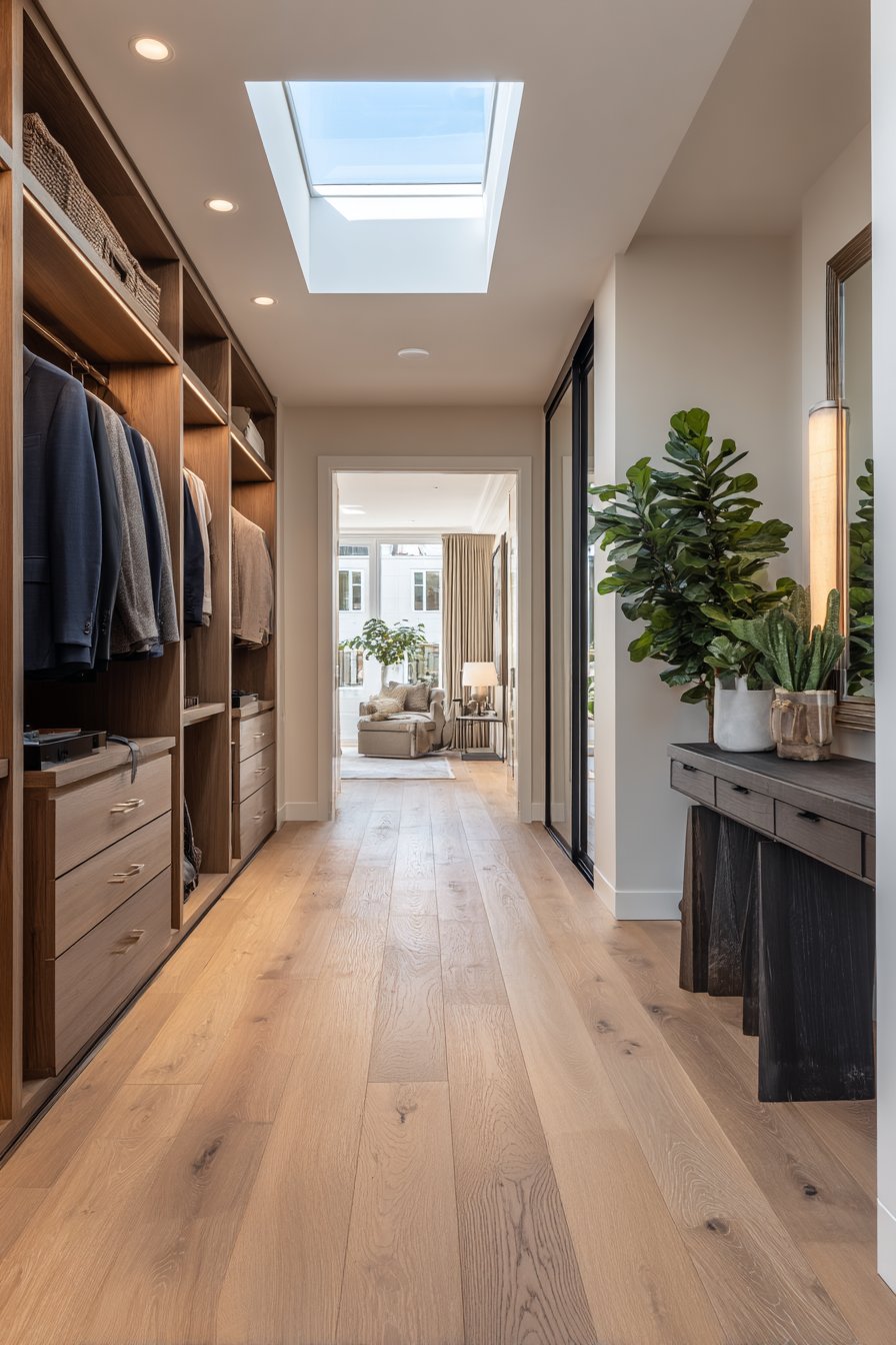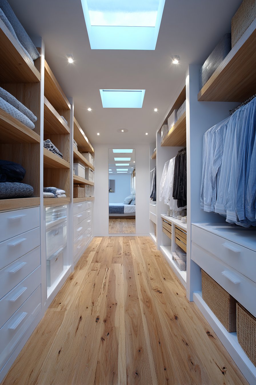 The sliding mechanism offers significant advantages over traditional hinged doors in closet applications, requiring no clearance space for door swing and allowing easy access to the closet’s entire width. When closed, the mirrored surface effectively doubles as a full-length dressing mirror, eliminating the need for separate floor mirrors in the bedroom. The combination of soft overhead lighting and natural light from a skylight creates even, shadow-free illumination that accurately represents colors and fabrics—essential for making informed wardrobe decisions.