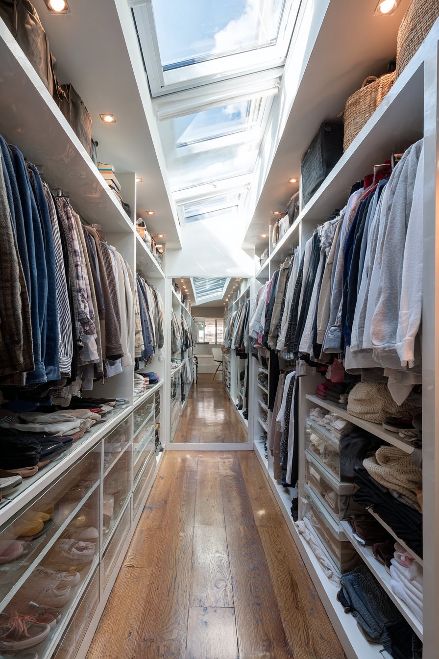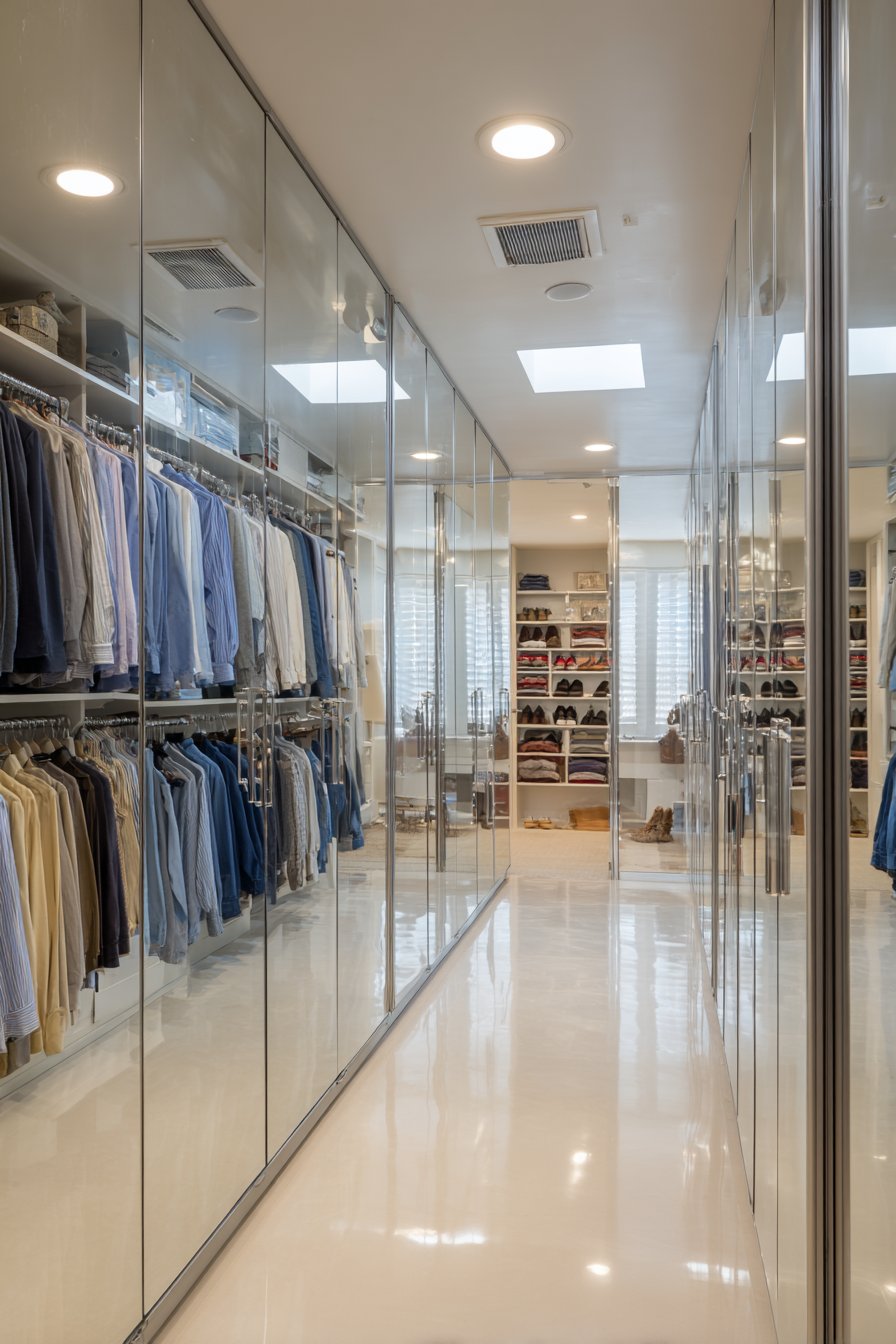 Floor-to-ceiling mirrored sliding doors transform a spacious walk-in closet into a dual-purpose space that serves both storage and dressing functions with remarkable elegance. These full-length mirrors provide essential functionality for viewing complete outfits from head to toe while simultaneously making the closet appear twice its actual size—a brilliant optical illusion that turns a practical storage space into a luxurious dressing suite. The mirrors reflect the organized shelving and carefully curated clothing displays on the opposite wall, creating visual depth that makes selecting outfits a more pleasant, boutique-like experience.