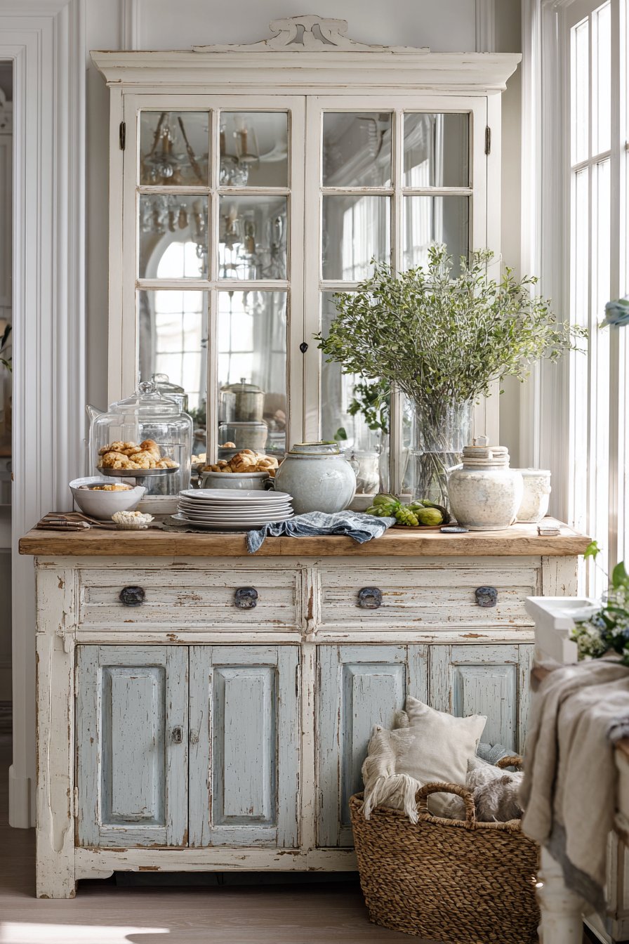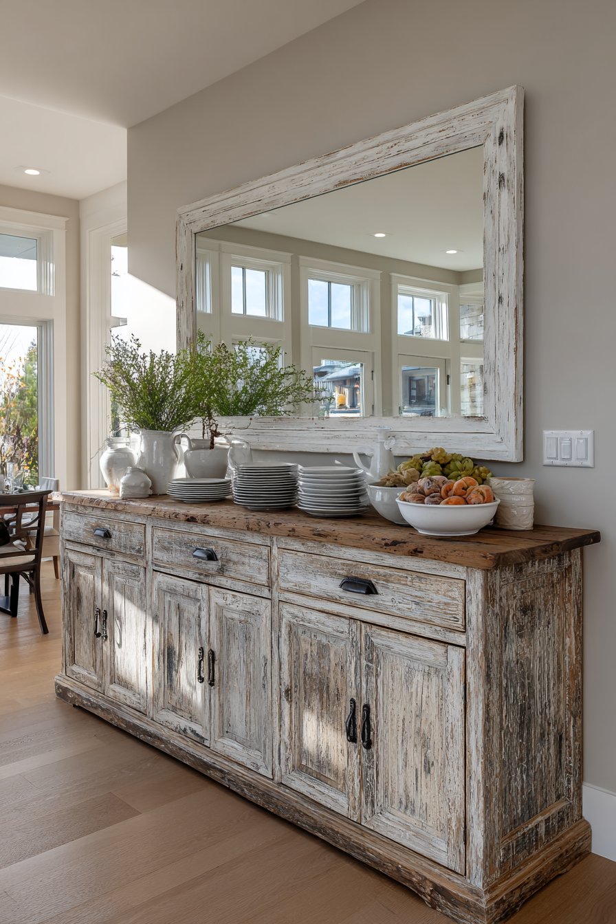 Key Design Tips: Source genuine reclaimed wood or high-quality reproductions that capture authentic patina and wear patterns for the most convincing farmhouse aesthetic. Scale the mirror to span approximately two-thirds to three-quarters of the buffet width for balanced proportions. Position the mirror to reflect the dining table and windows rather than cluttered areas or blank walls. Clean distressed frames gently to preserve the intentional wear while removing dust and grime. Complement the mirror with other farmhouse elements like vintage ironstone, fresh flowers in mason jars, and natural fiber textiles.