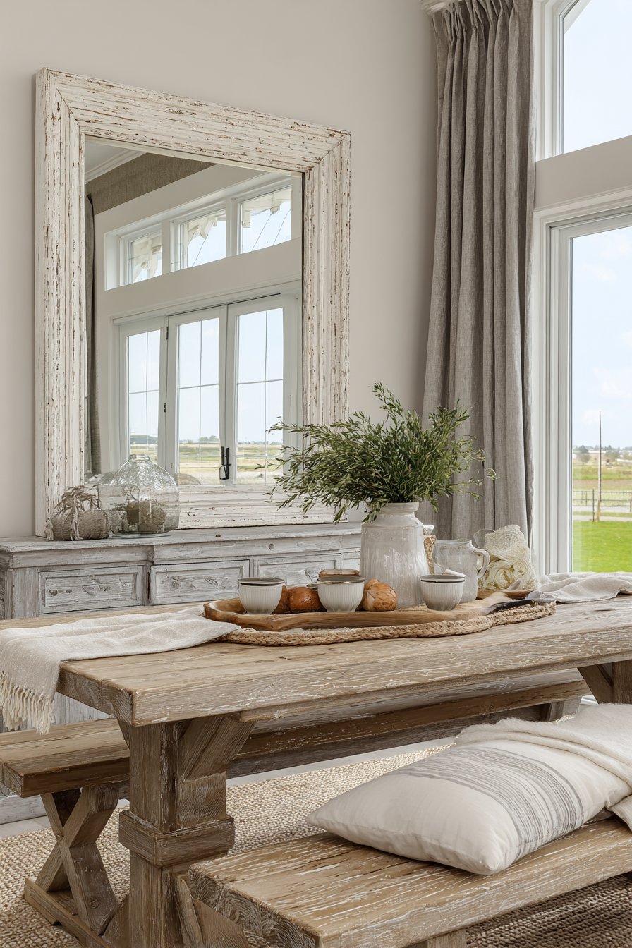 Natural light from nearby windows bounces off the mirror’s surface, distributing illumination throughout the dining space and creating a brighter, more welcoming environment for family meals and entertaining. This room mirror idea exemplifies the farmhouse style’s talent for combining practical function with cozy aesthetics—the mirror serves its reflective purpose while the distressed frame adds textural interest and vintage appeal. The horizontal orientation emphasizes the room’s width, making the dining area feel more expansive and open, particularly beneficial in narrower spaces where every visual trick helps.