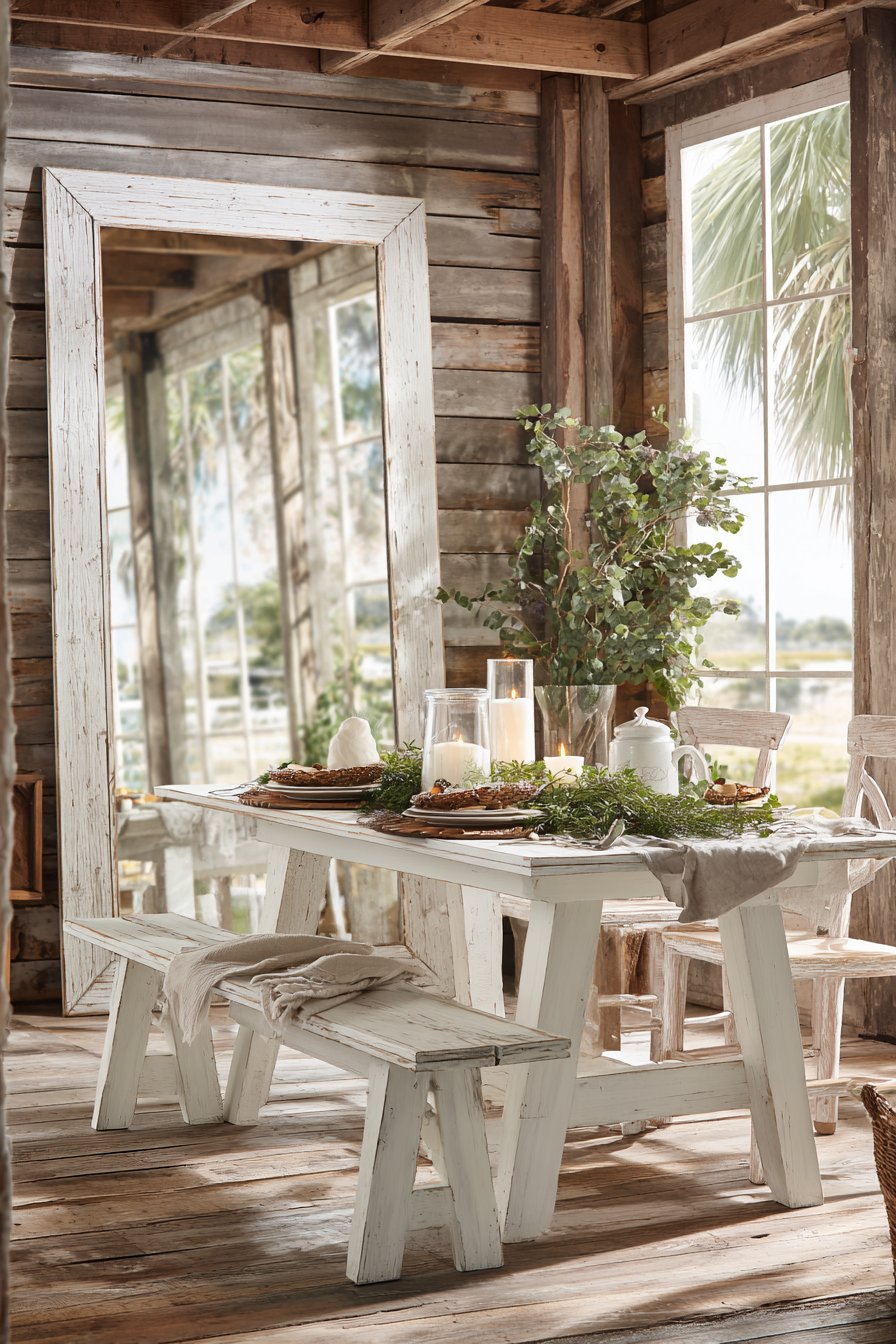A large mirror in a distressed white wooden frame brings rustic farmhouse charm to a dining room when hung horizontally above a reclaimed wood buffet table, creating a focal point that combines practical reflection with architectural interest. The weathered frame finish tells a story of age and character, whether genuinely antique or skillfully crafted to evoke vintage appeal, perfectly complementing the rough-hewn texture of the reclaimed wood furniture below. The mirror’s reflective surface captures and multiplies the simple beauty of the dining table set with ceramic dishes and fresh greenery centerpieces, adding depth to the room while maintaining the farmhouse aesthetic’s emphasis on natural, unpretentious beauty.