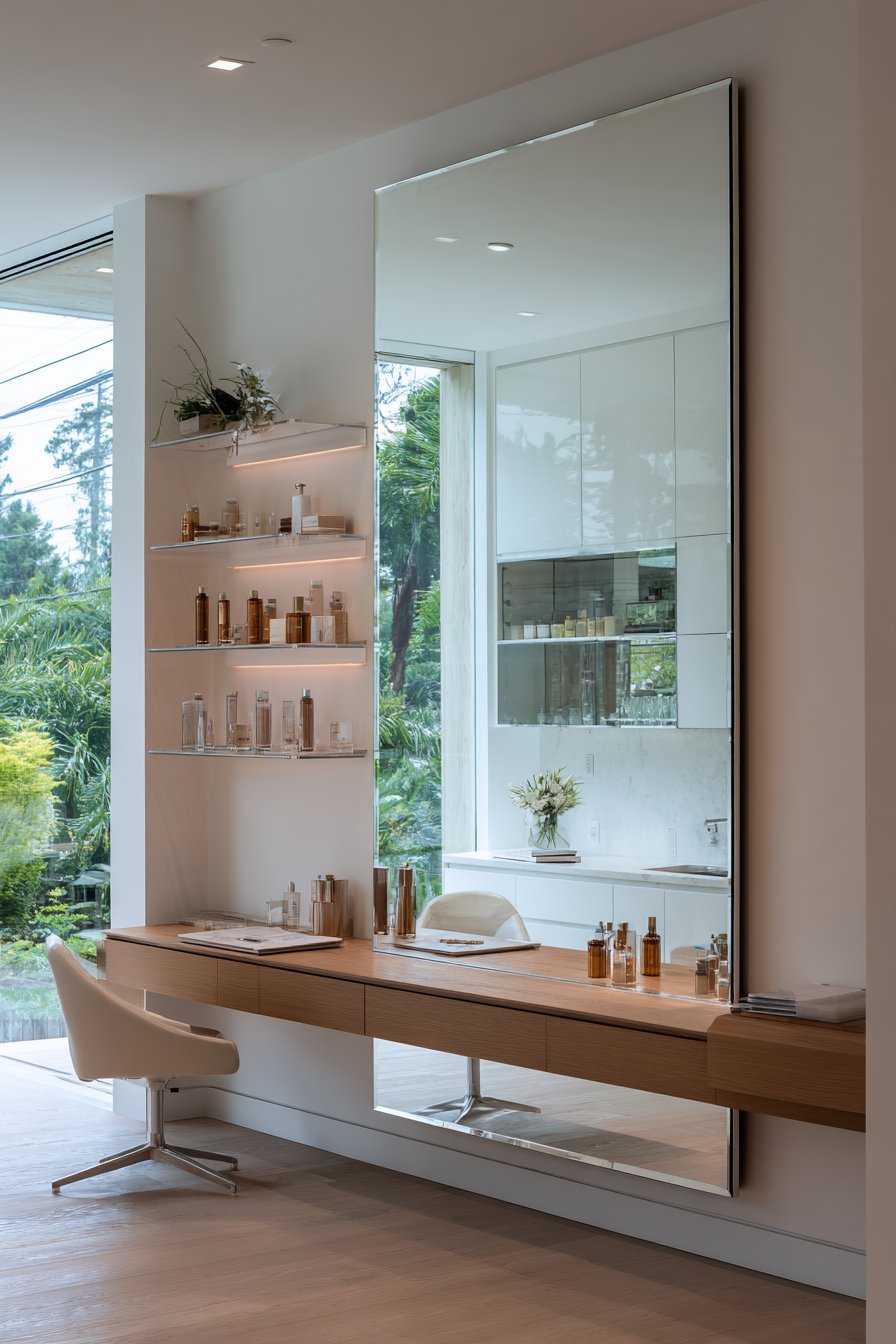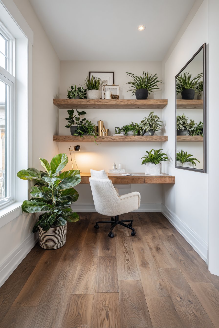 A sleek horizontal mirror with a thin metal frame positioned behind a minimalist desk setup demonstrates how room mirror ideas can enhance workspace functionality while adding visual interest to what might otherwise be a purely utilitarian environment. The mirror’s reflective surface captures organized floating shelves lined with books and office supplies, along with carefully selected indoor plants that bring life and color to the workspace. This reflection creates layers of depth that prevent the office from feeling flat or confined, instead producing a dynamic, visually engaging environment that supports focus and creativity.