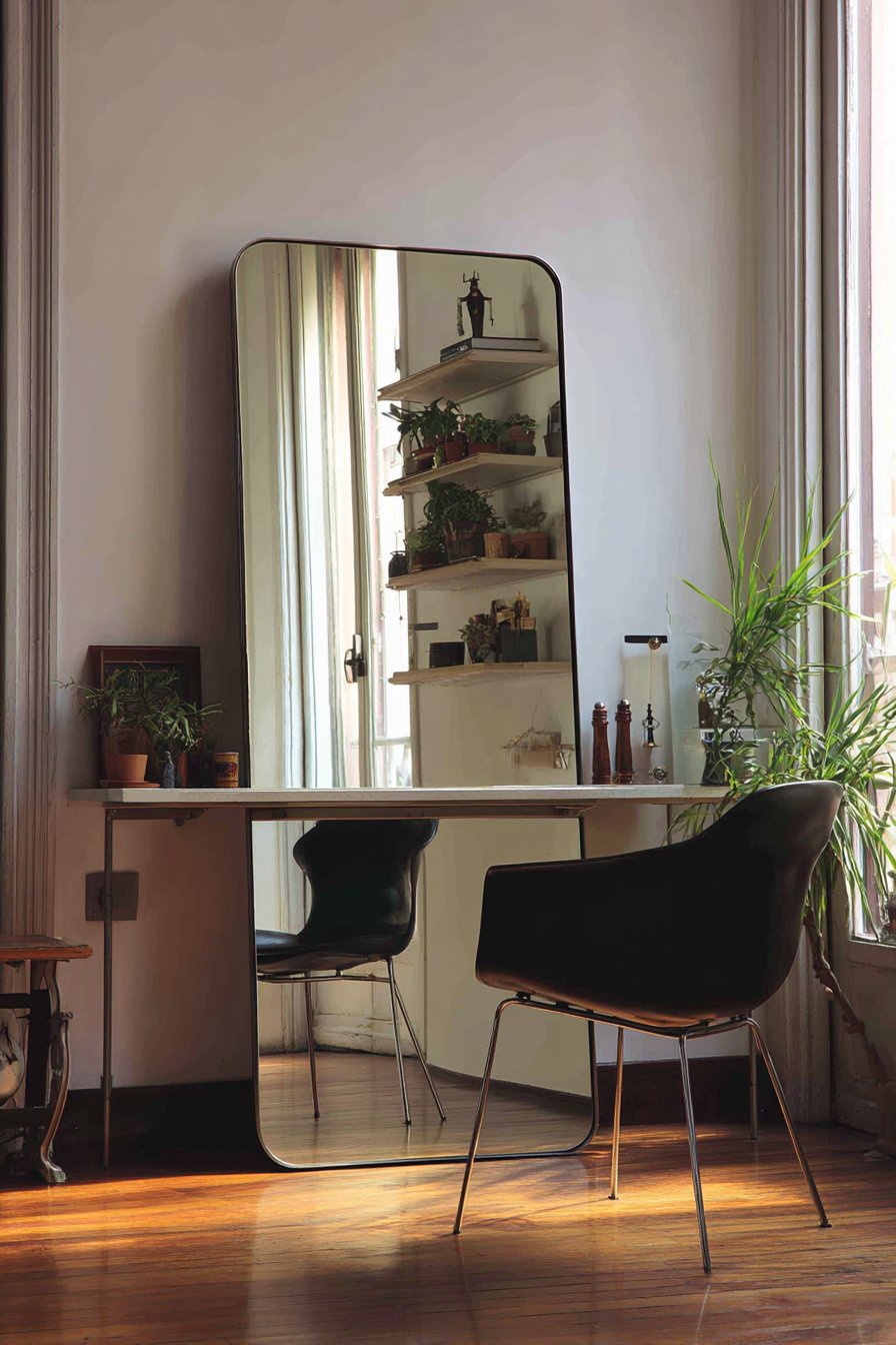 A vintage-style triptych vanity mirror featuring three adjustable panels in thin gold frames creates versatile grooming station when set upon a modern floating shelf, demonstrating how room mirror ideas can successfully blend historical inspiration with contemporary styling. The three-panel design provides practical viewing angles impossible with single flat mirrors—side panels can be angled to show profile views, check hairstyles from behind, or ensure makeup application appears even from all perspectives. The folding construction adds functionality allowing the mirror to be partially or fully closed when not in use, protecting the reflective surfaces while maintaining a tidier appearance.