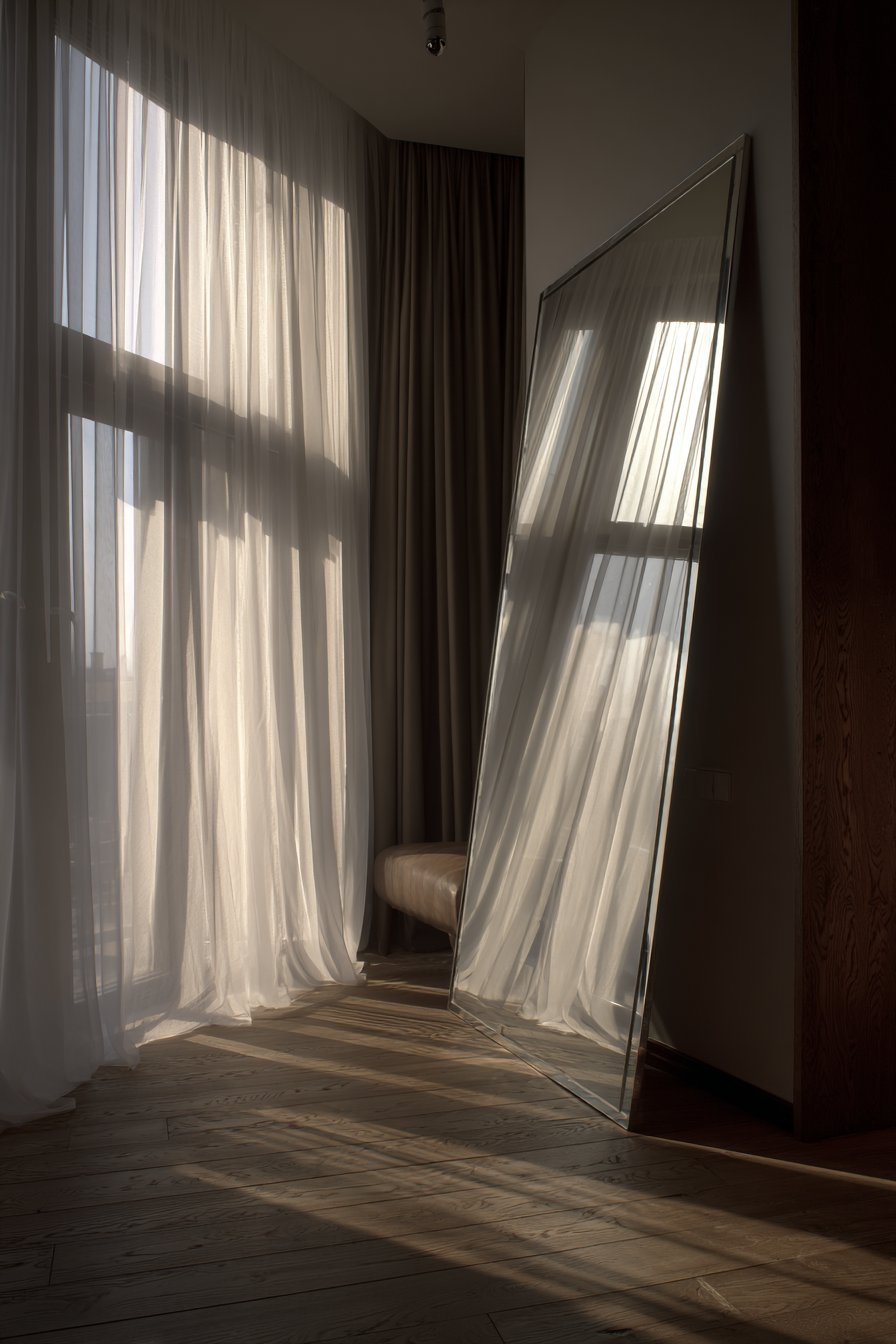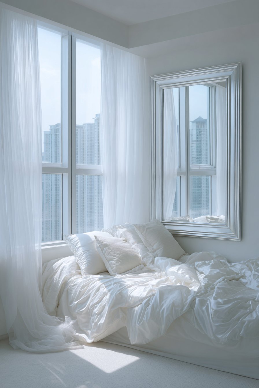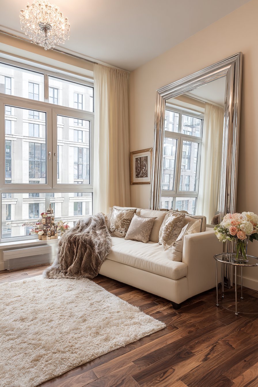 Sheer curtains filter natural light entering through the windows, creating soft, diffused illumination that the mirror captures and redistributes throughout the compact room, ensuring even distant corners receive some reflected brightness. The simple silver frame provides just enough definition to give the mirror finished polish without adding ornate details that might overwhelm the limited space or compete with other design elements. This room mirror idea exemplifies the principle that in small-space design, less is often more—the mirror’s impact comes from its size and strategic placement rather than elaborate framing or complex styling.