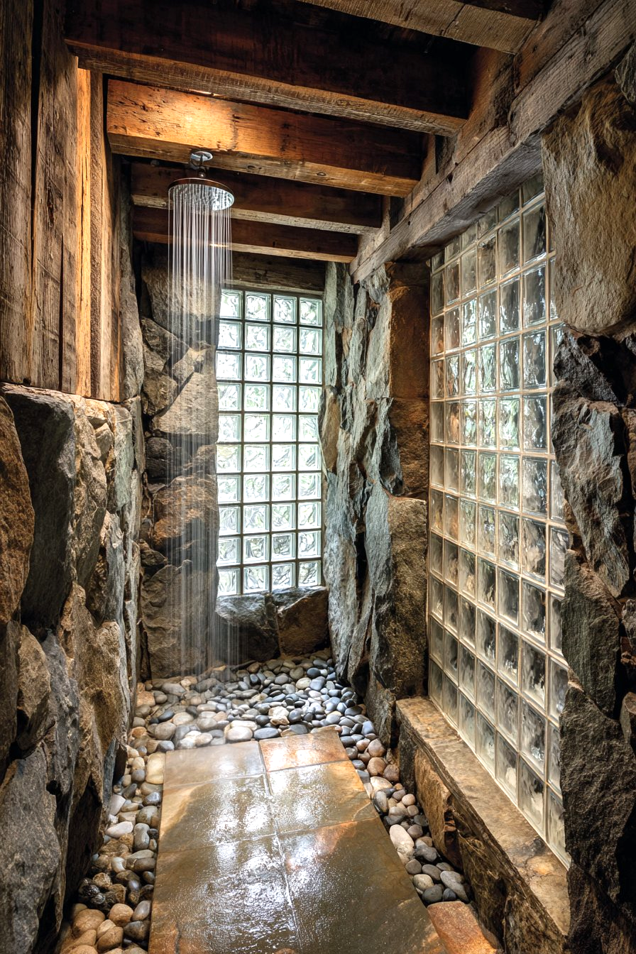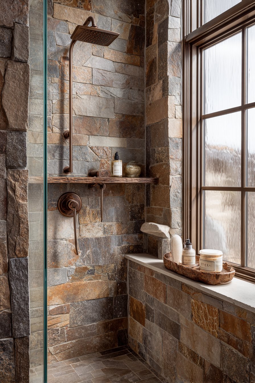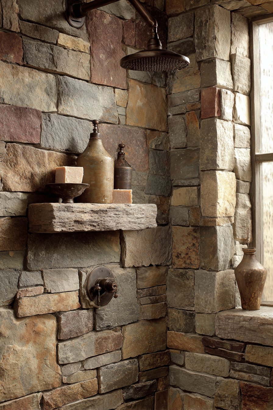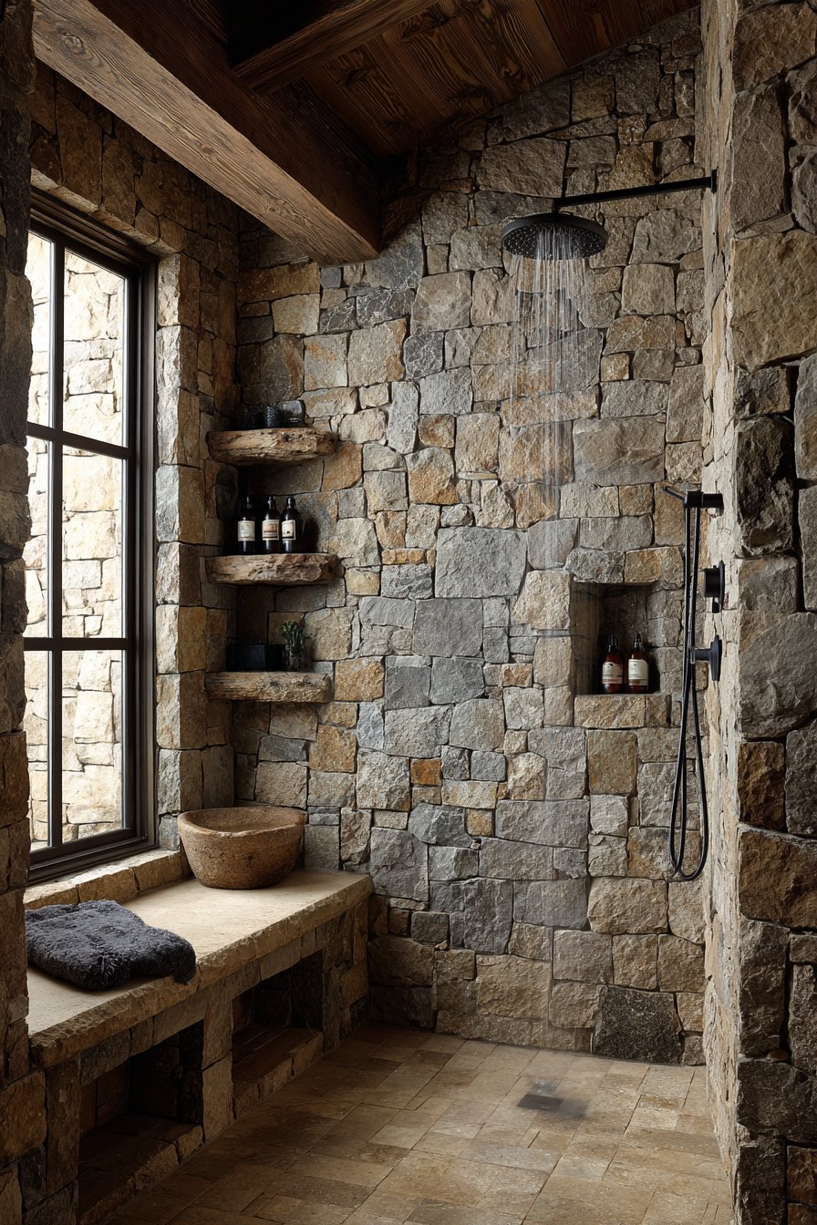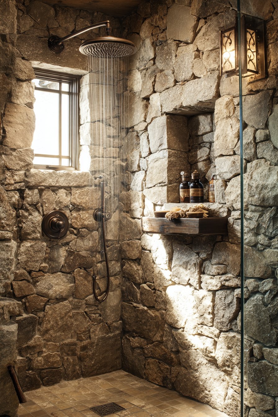 The thoughtful details elevate this rustic shower from basic to extraordinary. A reclaimed wood shelf mounted directly into the stone wall provides practical storage for handmade soaps and rustic accessories while introducing an additional natural material that warms the overall palette. The shelf’s integration into the stonework appears intentional and organic rather than added as an afterthought, demonstrating how rustic design rewards careful planning. Natural morning light filtering through a frosted window creates soft, diffused illumination that changes throughout the day, casting gentle shadows across the textured stone surfaces and highlighting the dimensional quality of the stacked stone installation.