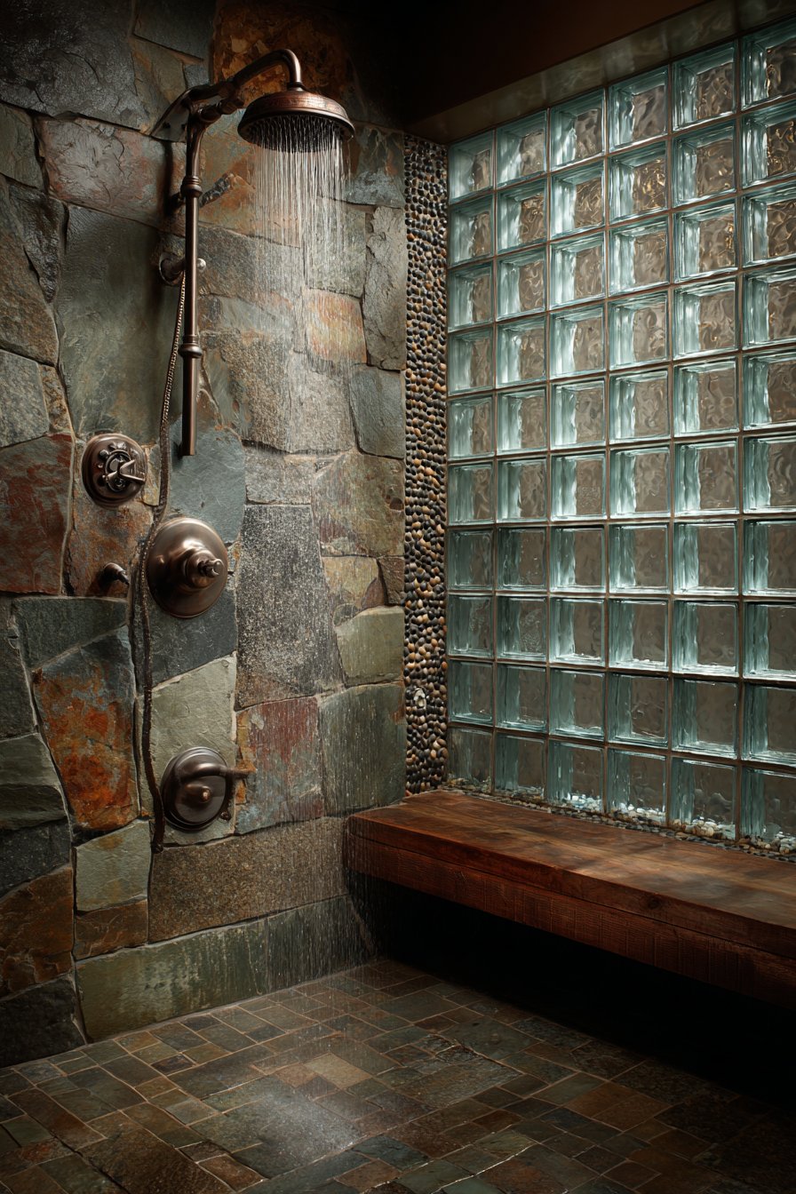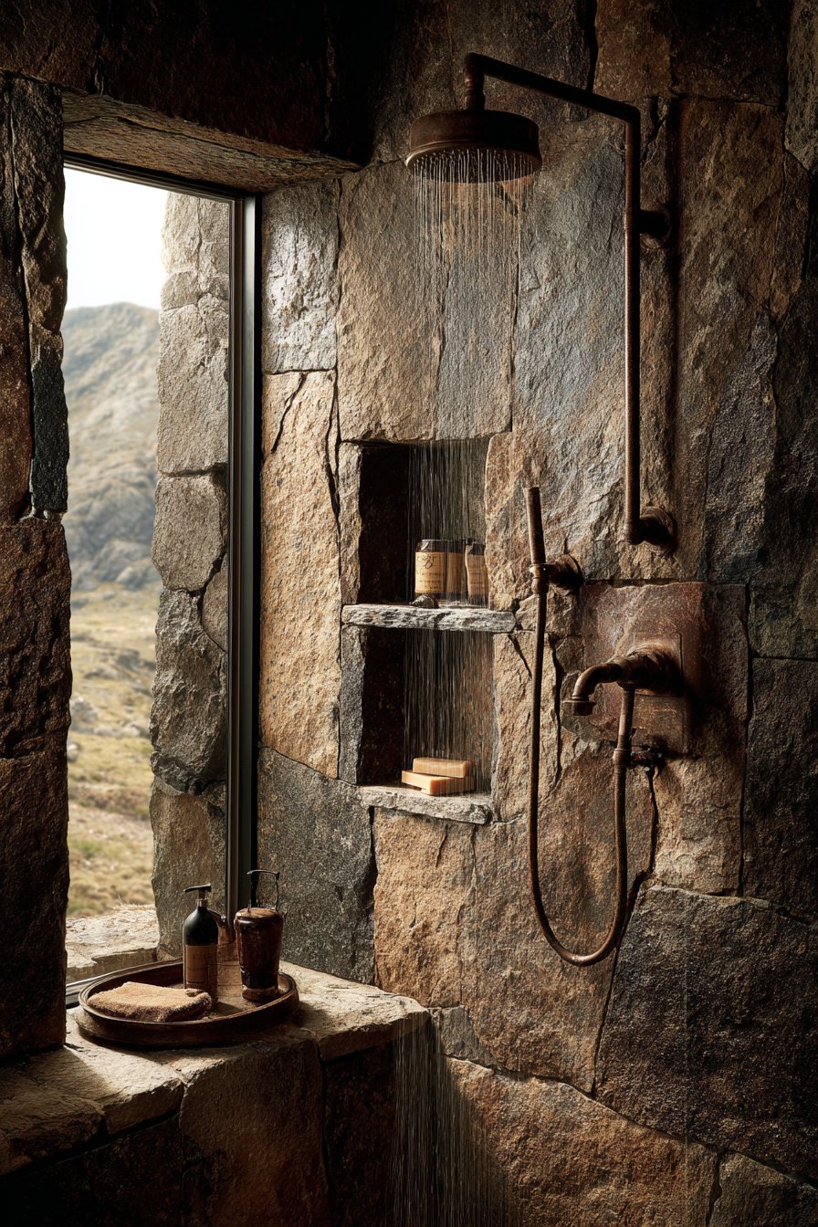 Essential design considerations include: choosing stone pieces with similar thickness to ensure proper stacking and professional appearance, using a skilled mason familiar with natural stone to ensure structural integrity and proper mortar application, selecting a bronze finish with protective coating to slow (but not prevent) natural patina development, installing proper backing and waterproof membranes behind stone to prevent moisture migration, and incorporating a recessed niche or shelf during initial construction rather than attempting to retrofit later. This rustic shower idea proves that traditional materials and time-honored techniques create spaces with lasting beauty and value.
