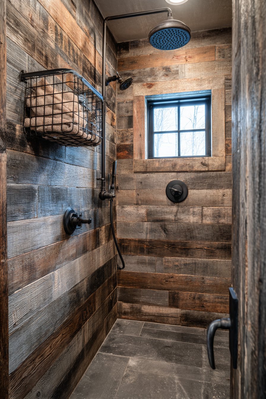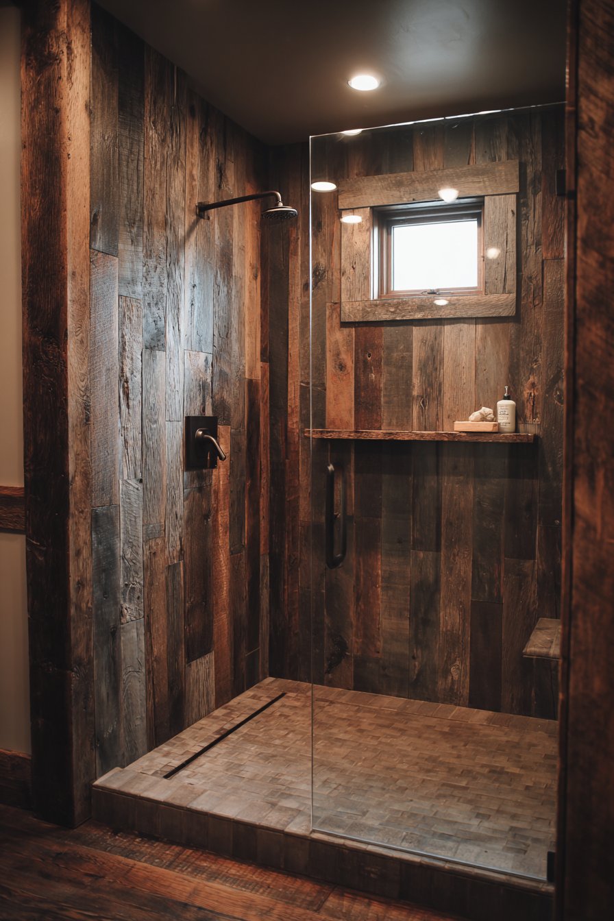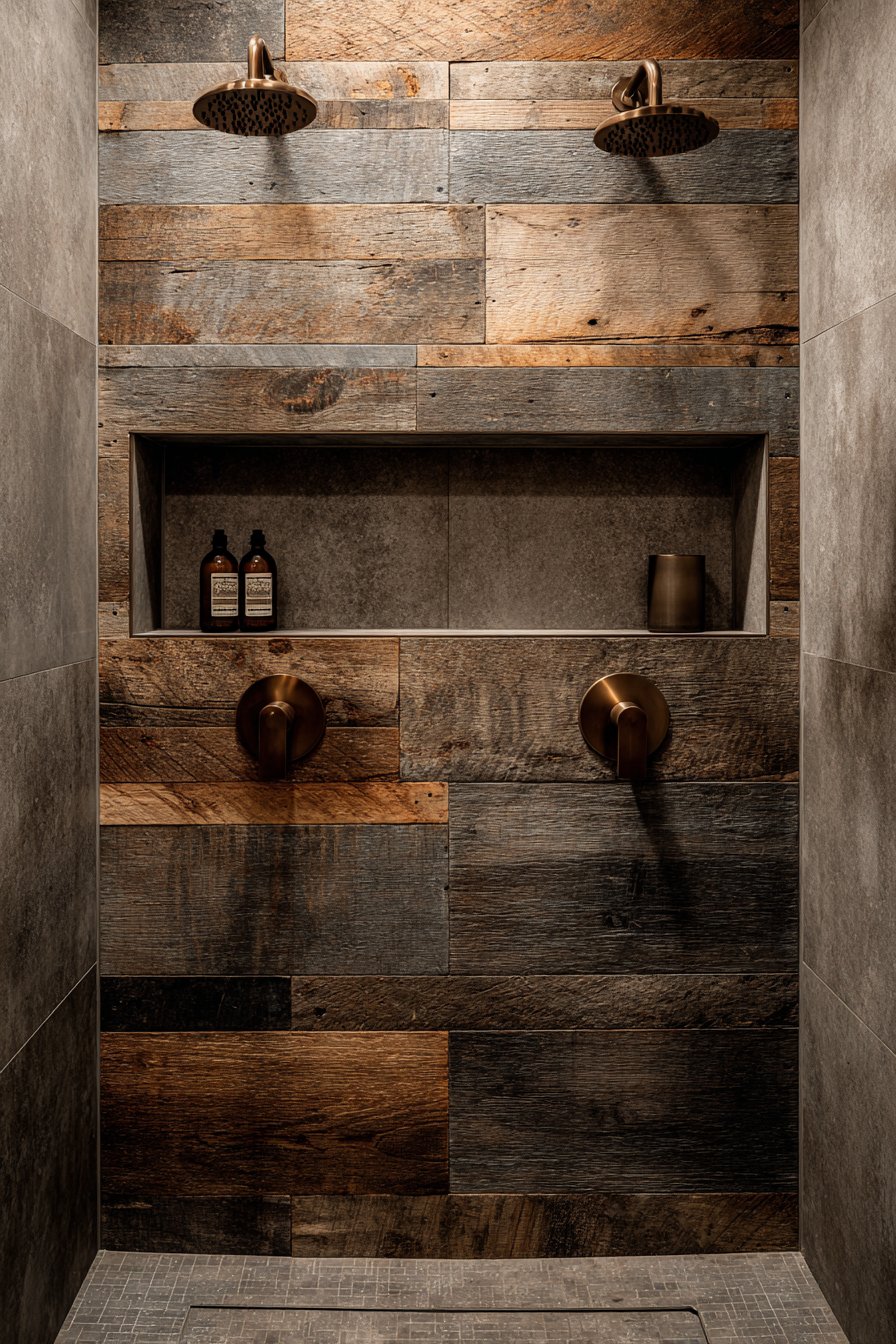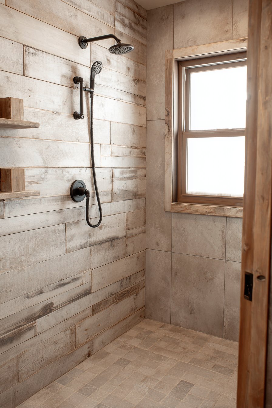The ultimate expression of industrial-rustic fusion, this shower design features horizontal wood plank walls in mixed-width barn wood style that celebrates authentic reclaimed materials while proper sealing and treatment ensure appropriate performance in shower environments. The mixed widths—typically ranging from four to twelve inches—create visual rhythm and authentic character impossible to achieve with uniform-width modern materials. The varied weathered gray and brown tones display the natural aging and patina developed over decades of previous use, each board telling its own story through color shifts, nail holes, and wear patterns. Concrete-look porcelain tile floor in charcoal provides industrial counterpoint while offering superior water resistance and slip resistance essential for safe showering.