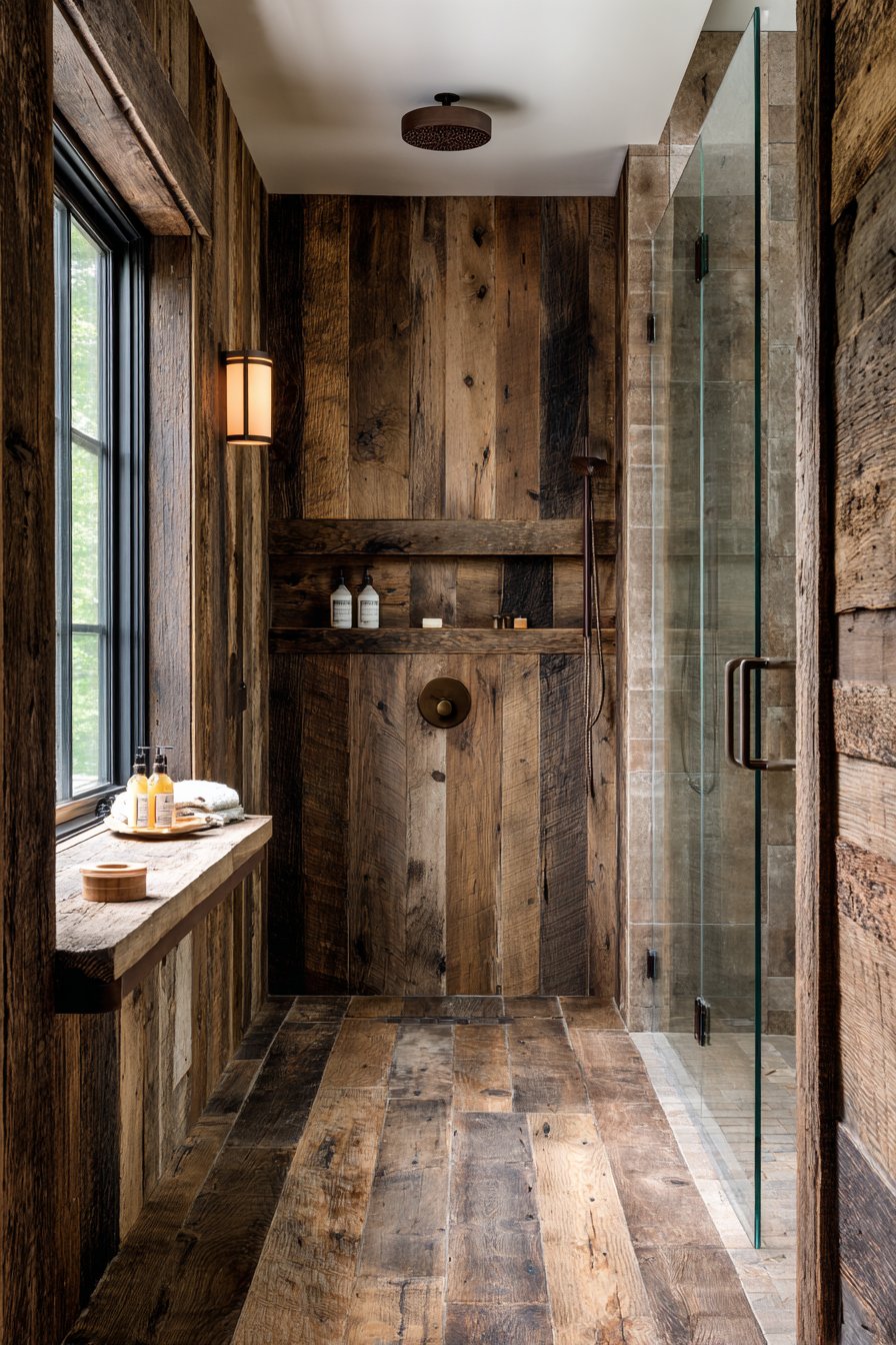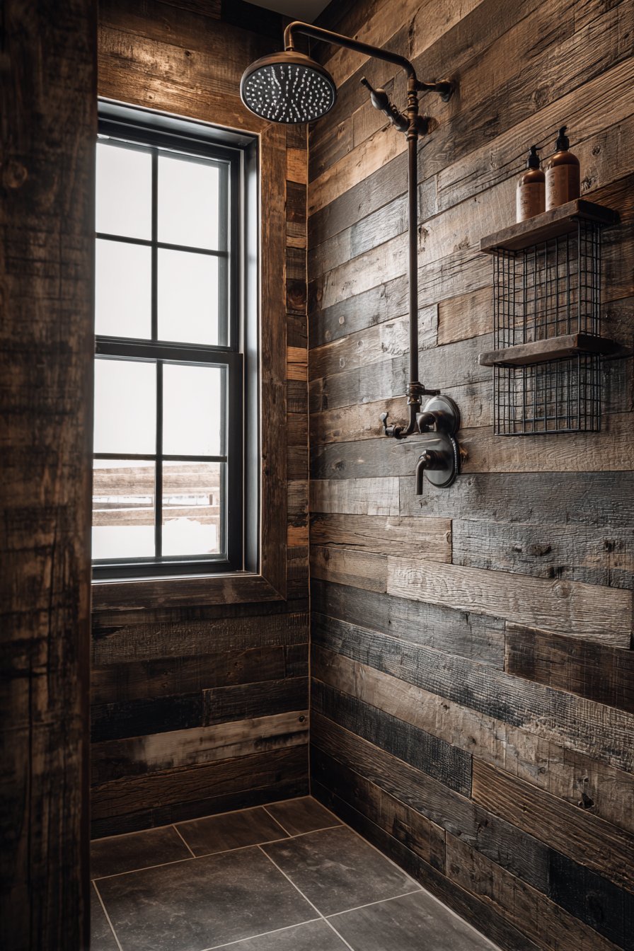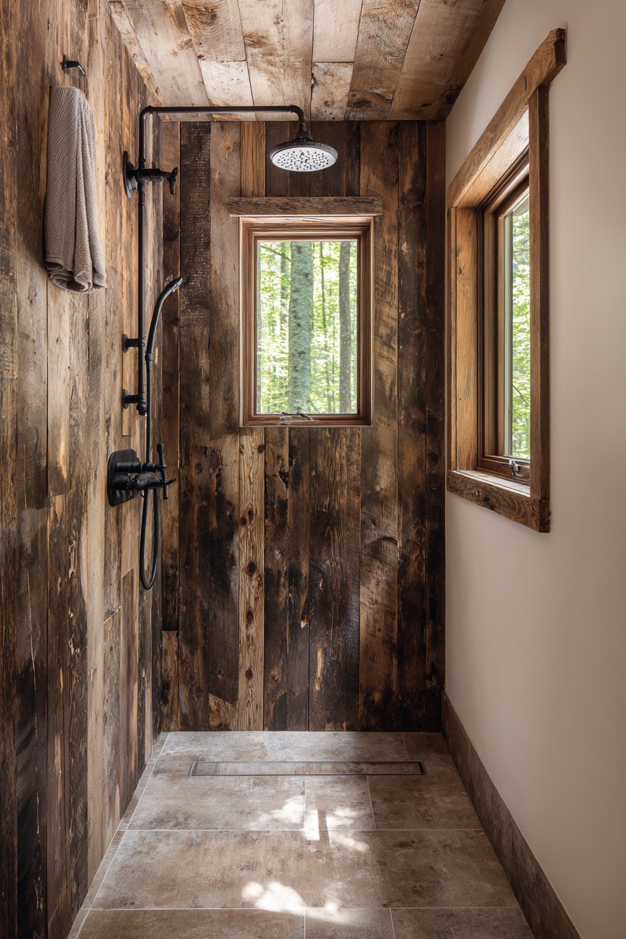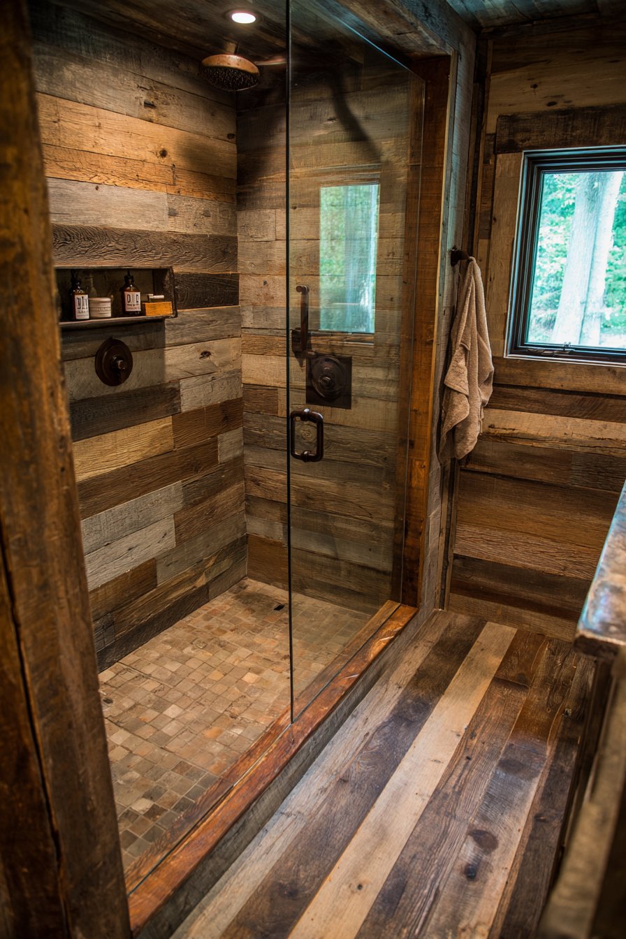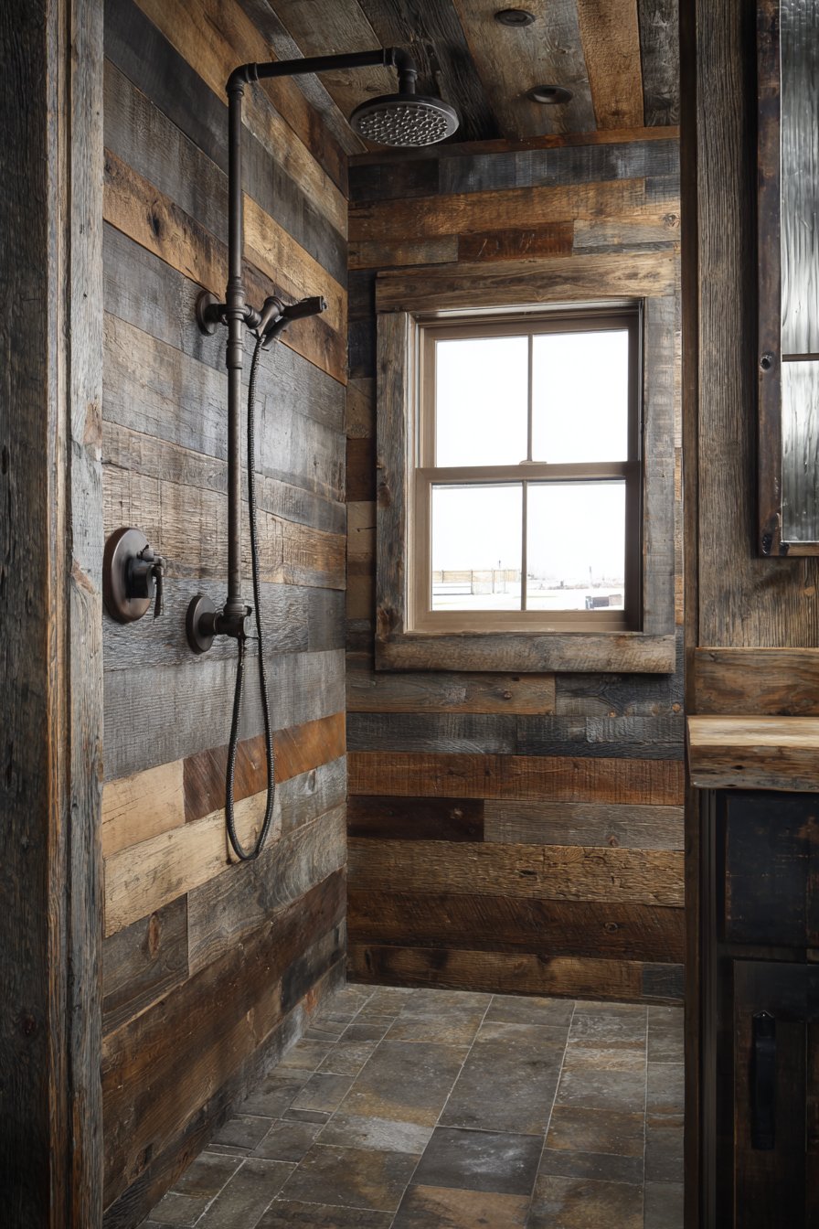 The ultimate expression of industrial-rustic fusion, this shower design features horizontal wood plank walls in mixed-width barn wood style that celebrates authentic reclaimed materials while proper sealing and treatment ensure appropriate performance in shower environments. The mixed widths—typically ranging from four to twelve inches—create visual rhythm and authentic character impossible to achieve with uniform-width modern materials. The varied weathered gray and brown tones display the natural aging and patina developed over decades of previous use, each board telling its own story through color shifts, nail holes, and wear patterns. Concrete-look porcelain tile floor in charcoal provides industrial counterpoint while offering superior water resistance and slip resistance essential for safe showering.