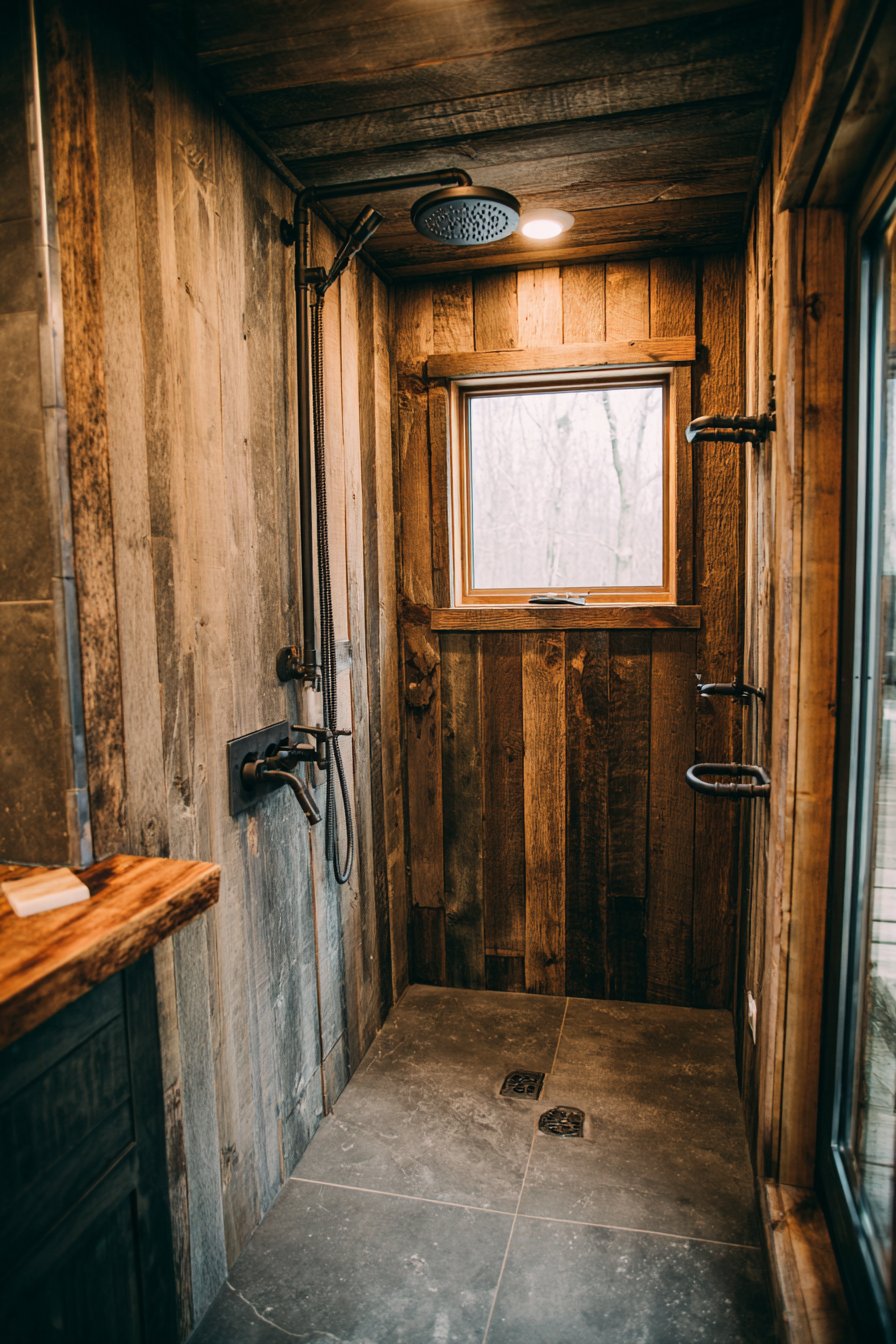 Wide-angle interior photography captures how careful material selection and strategic design choices maximize the impact of limited square footage. The vertical shiplap draws the eye upward, the exposed plumbing creates interest without consuming precious space, and the dark floor grounds the design while the window prevents any sense of claustrophobia.