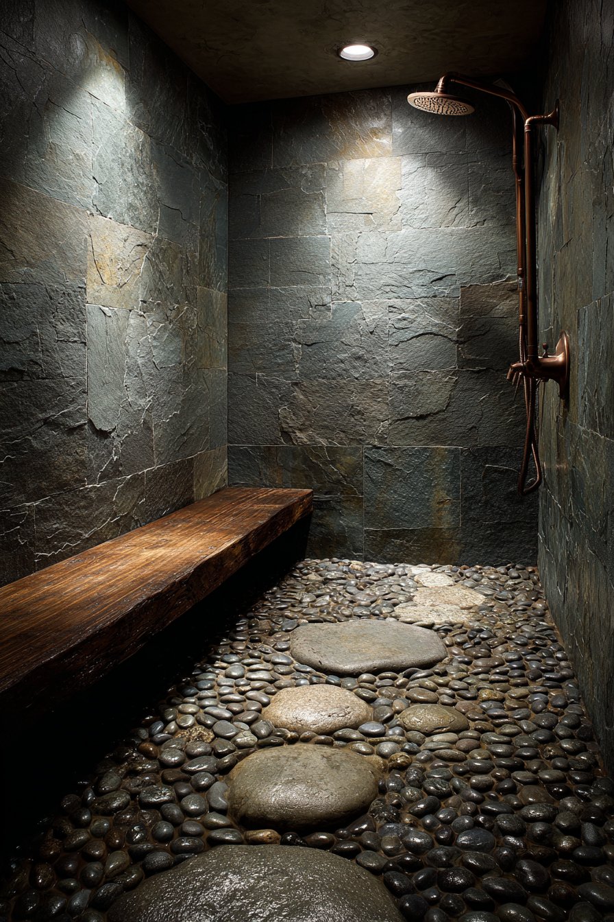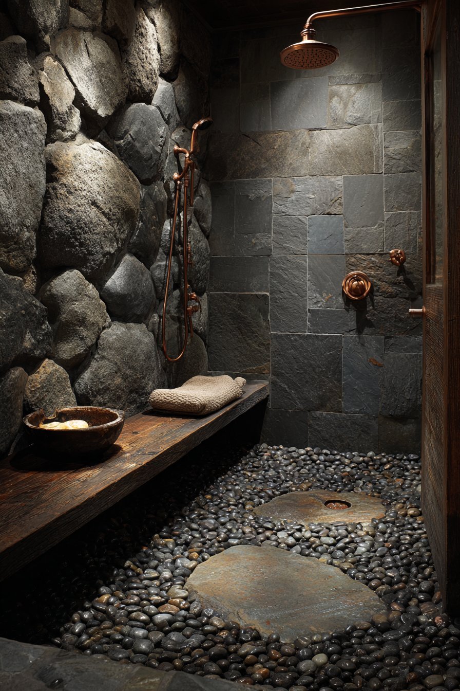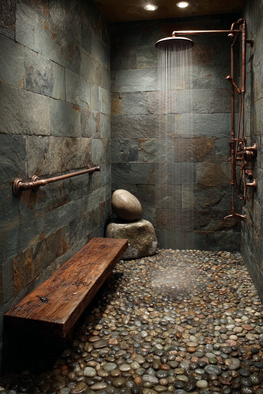 Important considerations for this design include: installing a proper shower pan beneath river rock flooring to ensure water drains to the correct location rather than seeping into subflooring, using a skilled tile installer experienced with natural slate to accommodate its thickness variations and ensure proper setting, applying appropriate sealers to both slate and river rock to enhance color and provide stain resistance while maintaining natural appearance, ensuring copper piping is properly supported and connections are watertight to prevent leaks behind walls, and treating the wooden bench with water-resistant finish suitable for constant moisture exposure. Regular resealing of natural stone surfaces maintains their beauty and performance. This rustic shower idea demonstrates how combining multiple natural materials with varying textures and colors creates rich, layered spaces with enduring appeal.