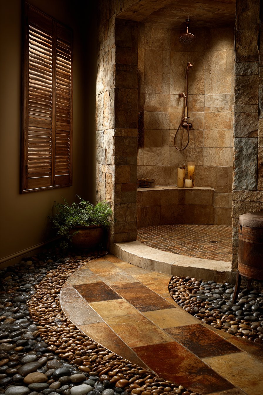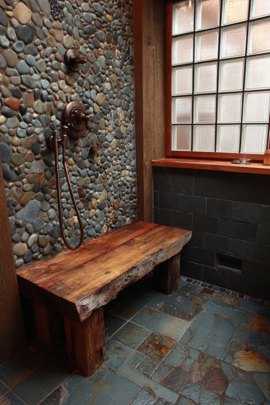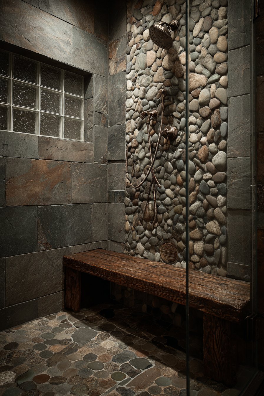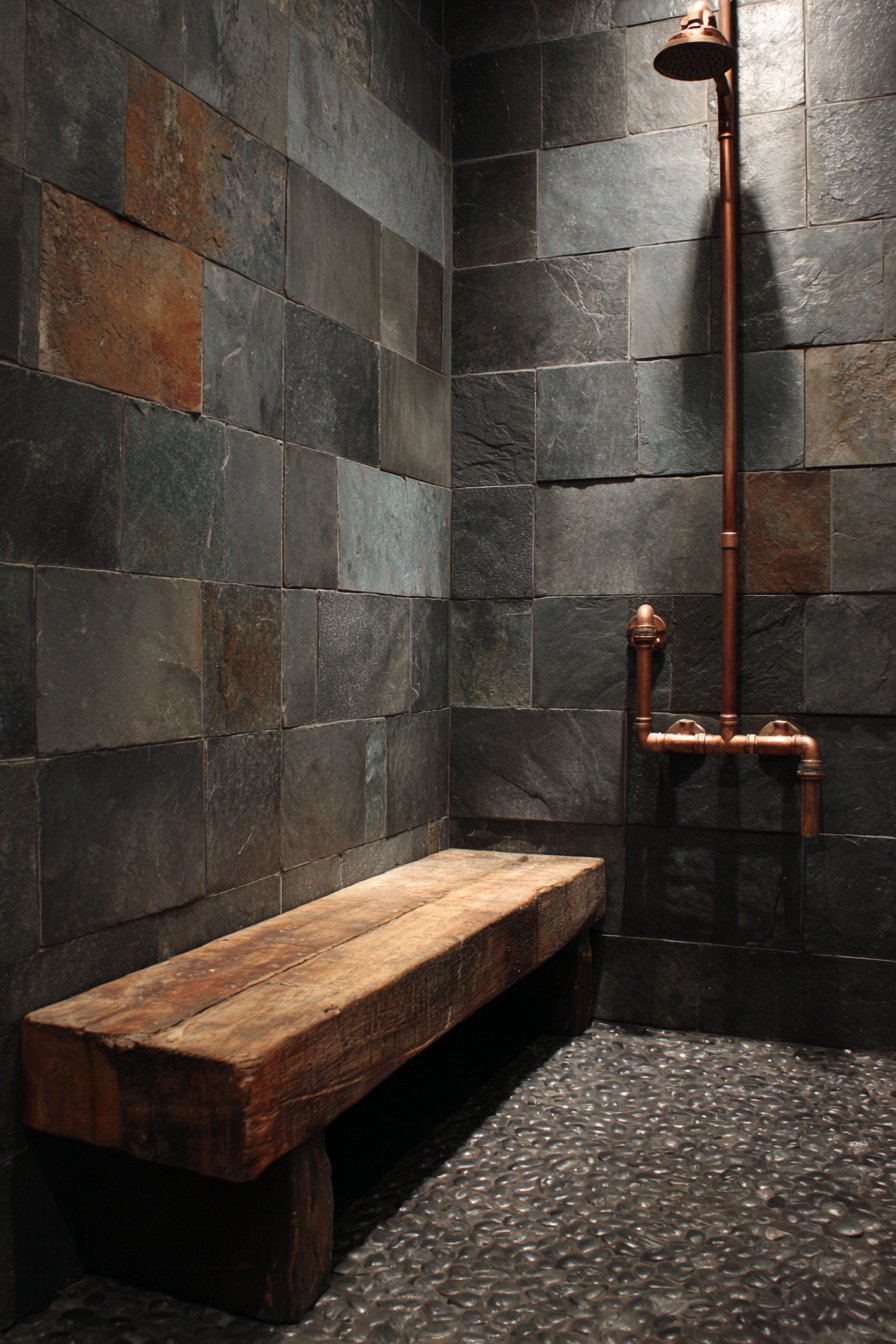 Important considerations for this design include: installing a proper shower pan beneath river rock flooring to ensure water drains to the correct location rather than seeping into subflooring, using a skilled tile installer experienced with natural slate to accommodate its thickness variations and ensure proper setting, applying appropriate sealers to both slate and river rock to enhance color and provide stain resistance while maintaining natural appearance, ensuring copper piping is properly supported and connections are watertight to prevent leaks behind walls, and treating the wooden bench with water-resistant finish suitable for constant moisture exposure. Regular resealing of natural stone surfaces maintains their beauty and performance. This rustic shower idea demonstrates how combining multiple natural materials with varying textures and colors creates rich, layered spaces with enduring appeal.