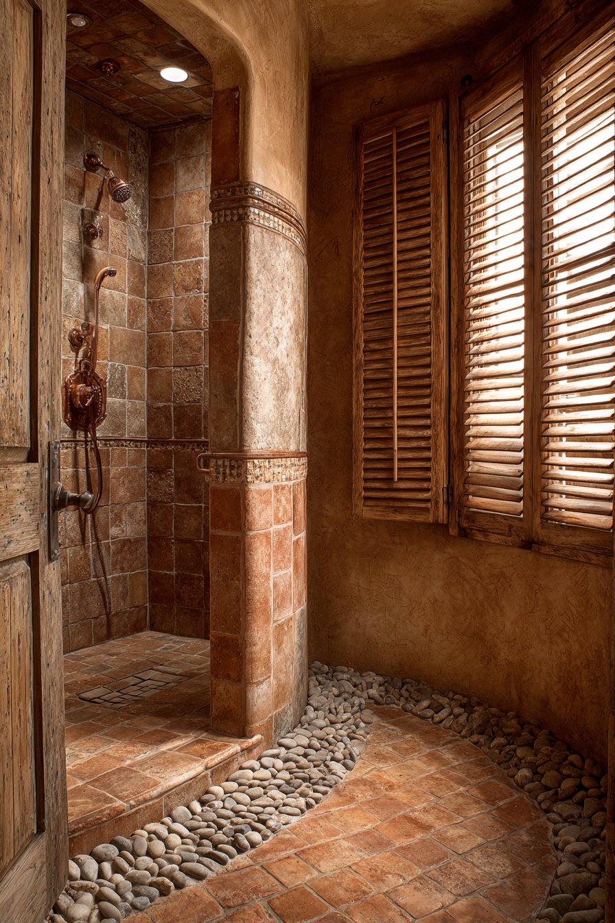 Aged copper fixtures showing natural patina provide the perfect complement to the terracotta’s warmth, their greenish-blue patina creating beautiful color harmony with the orange-toned tiles. The copper’s living finish continues to evolve over time, developing richer patina that adds character and depth impossible to achieve with static finishes. Curved river rocks create a decorative floor border around the central tile area, their rounded forms and varied colors adding organic beauty while the border pattern creates architectural definition. Wooden window shutters, adjustable to control natural light and ventilation, provide both practical function and additional rustic character.